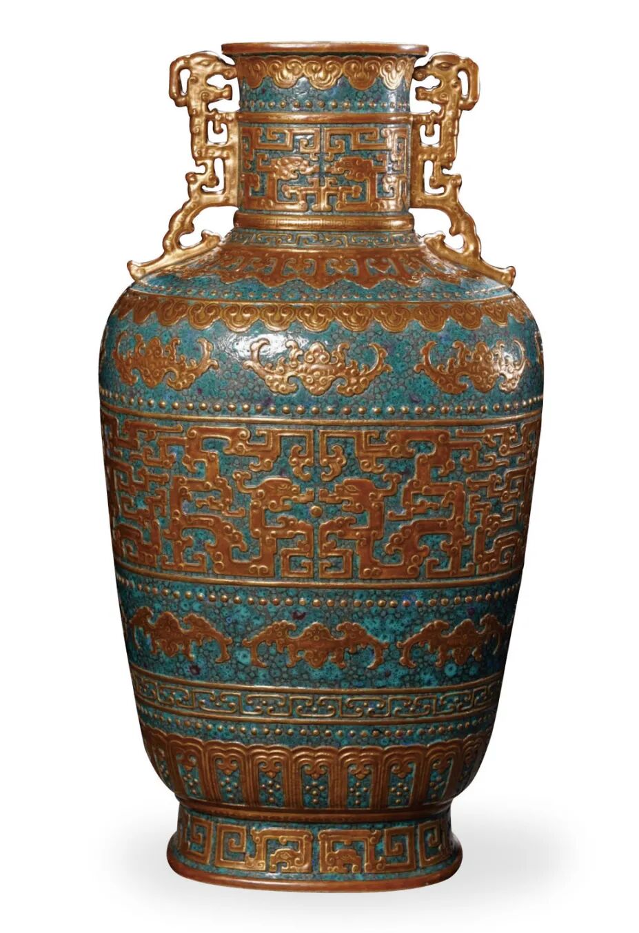 仿古铜釉彩描金浮雕“夔龙拱福”双螭耳瓶