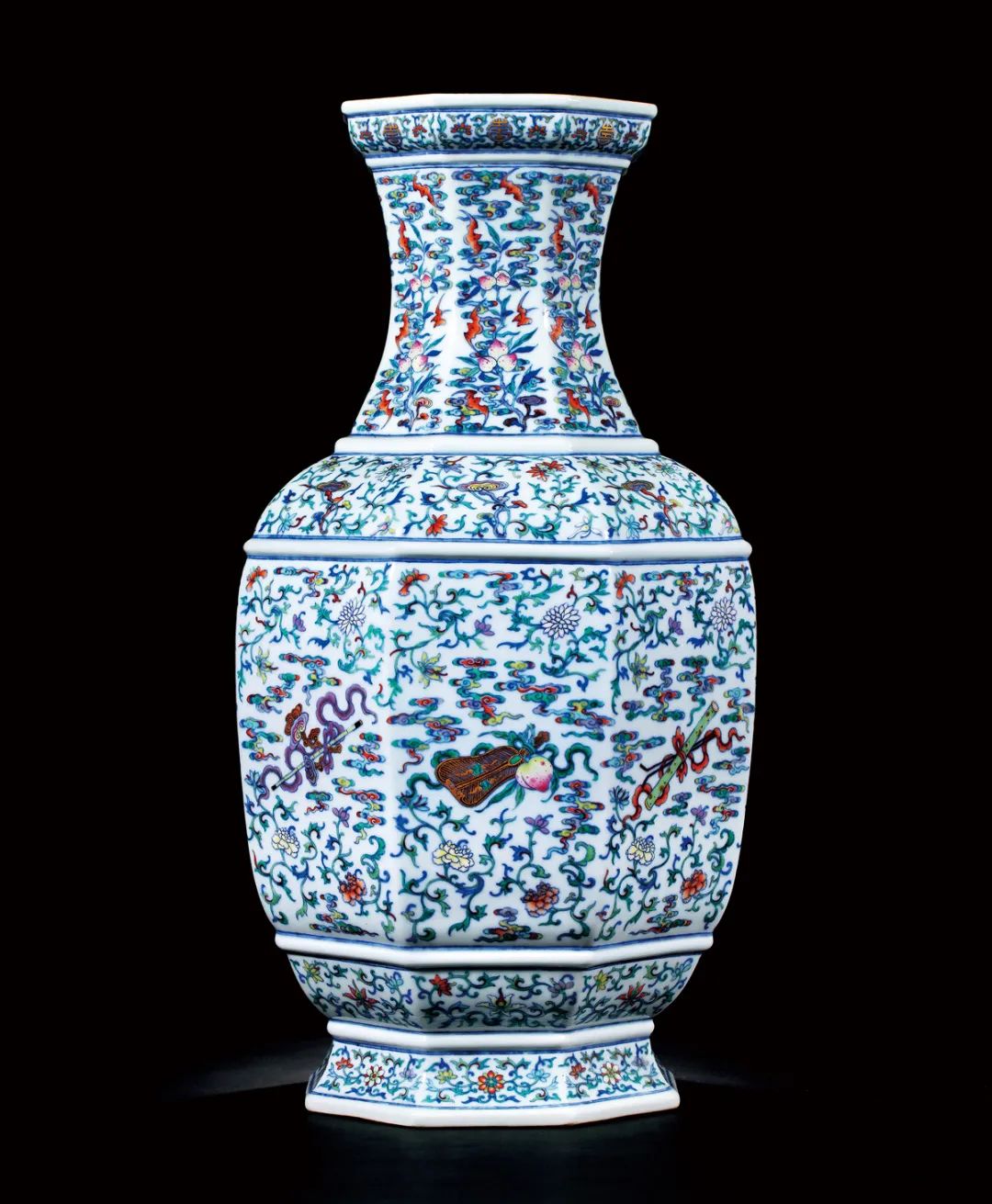 御制斗彩加粉彩暗八仙福寿纹八方盘口大瓶