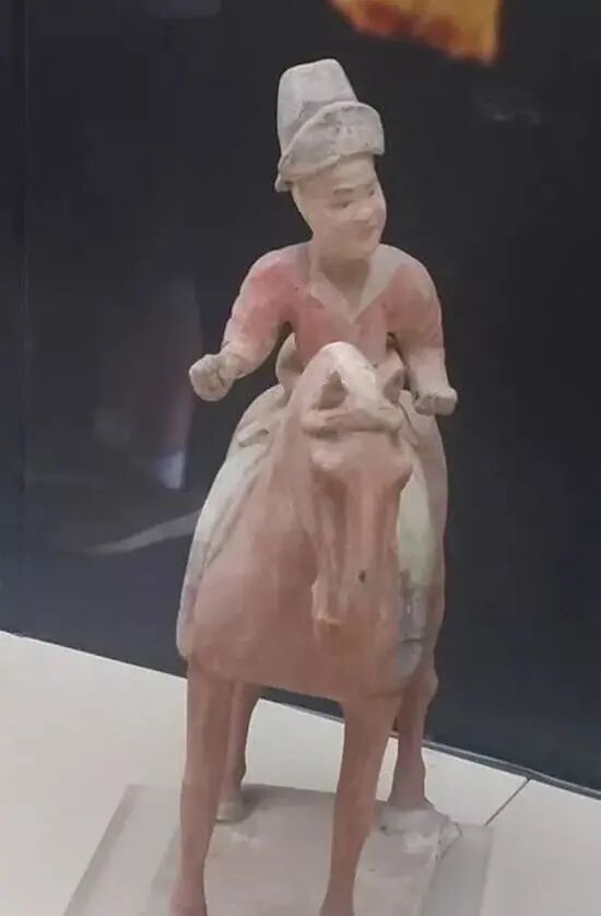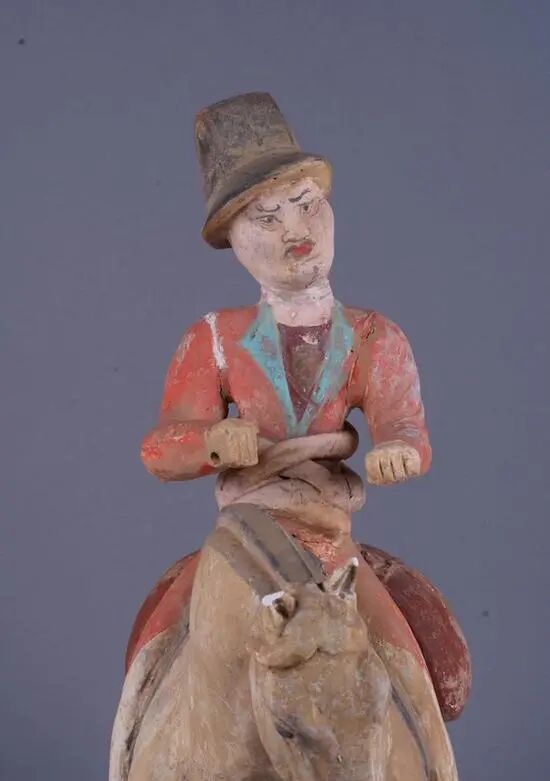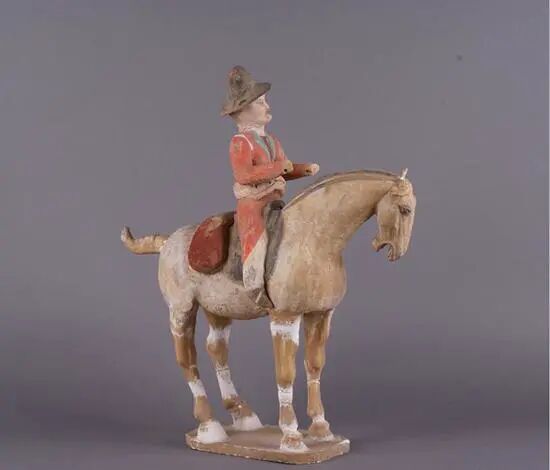 这件“骑马胡商俑”质地为红陶,并采用了彩绘工艺,其造型高大,制作精美,人、马比例准确。人物肩宽腰壮、神态威严警惕,充满异域特征,从坐姿便可感觉到他的彪悍威猛和机警霸气;马身体健硕、肌肉分明,肥不露肉、瘦不露骨,紧束的尾巴有力的翘起,呈现出马的力感、动感和美感。正是这些造型上的细节,展现出唐代制陶工艺高超的水平以及工匠们对胡人胡马的细致观察和充分了解,也从侧面反映出唐代胡汉交融已经深入人心。