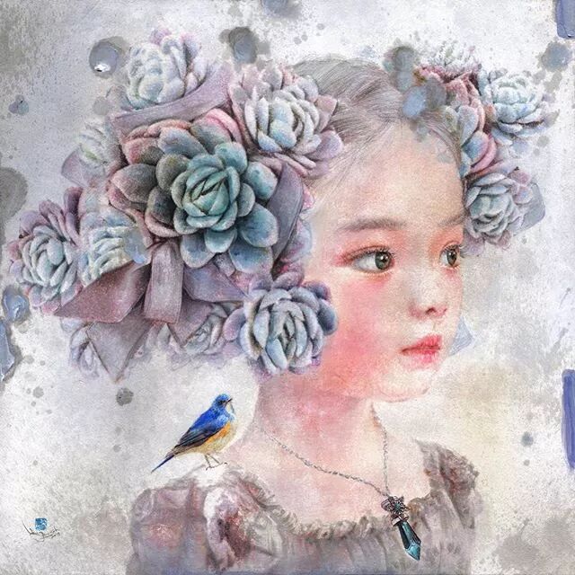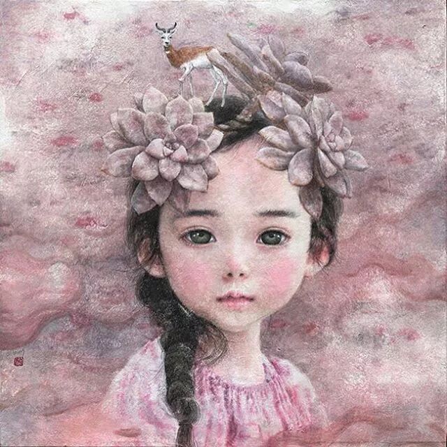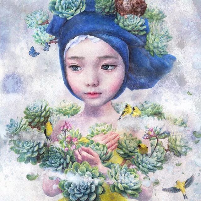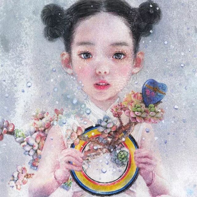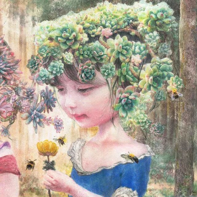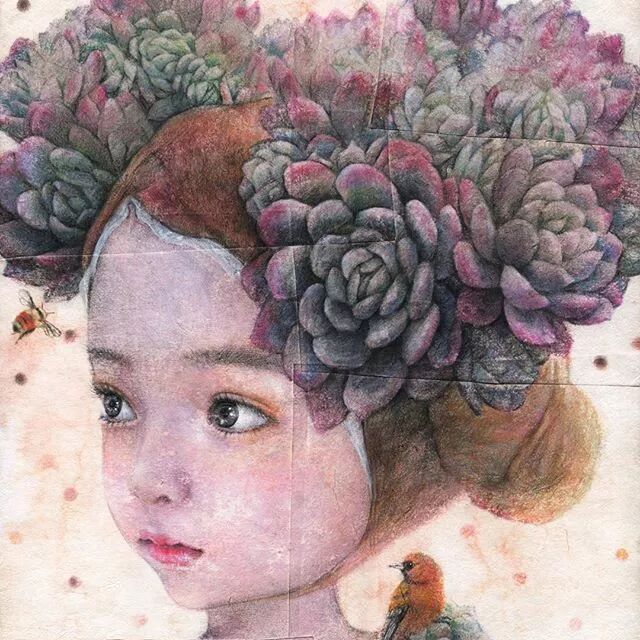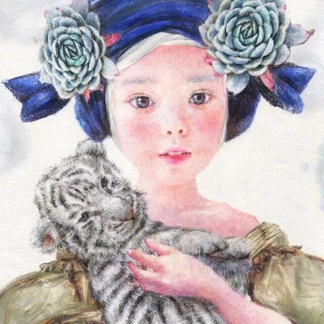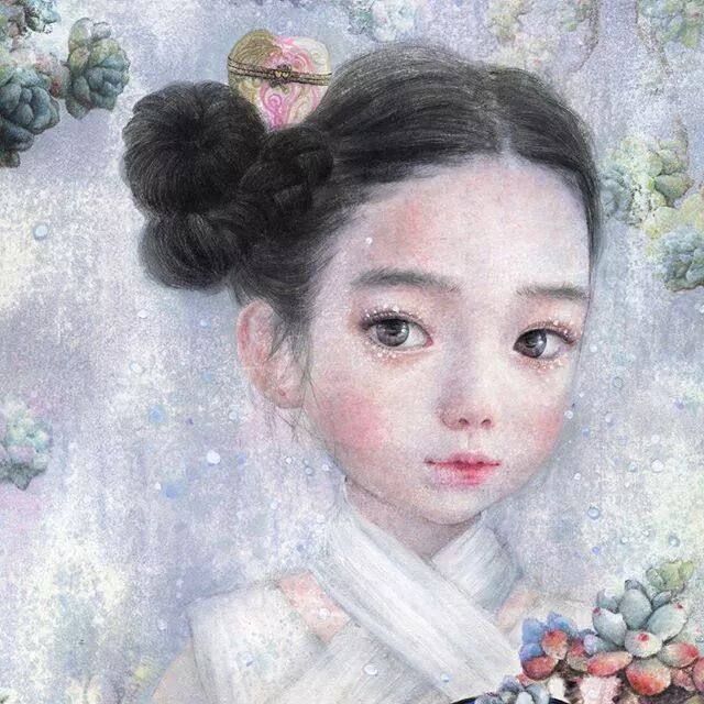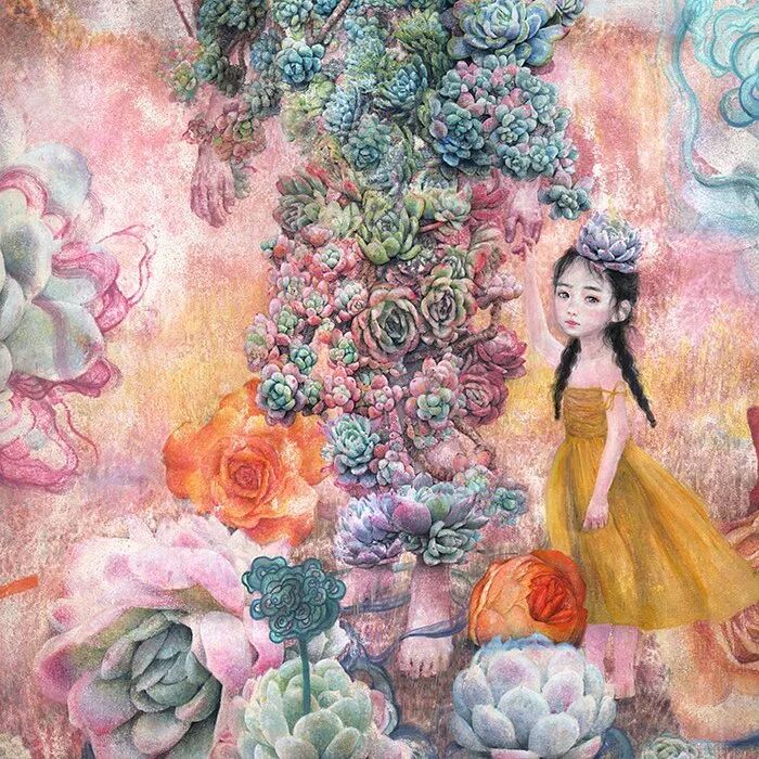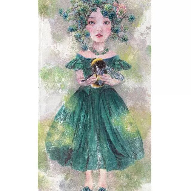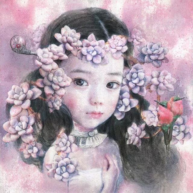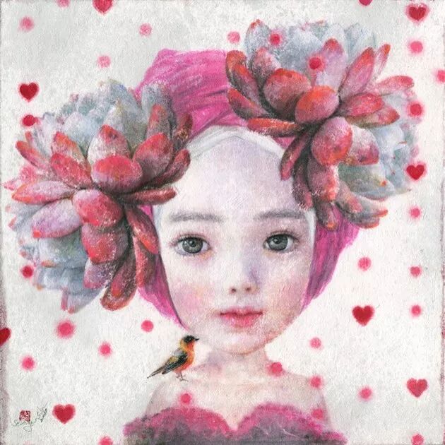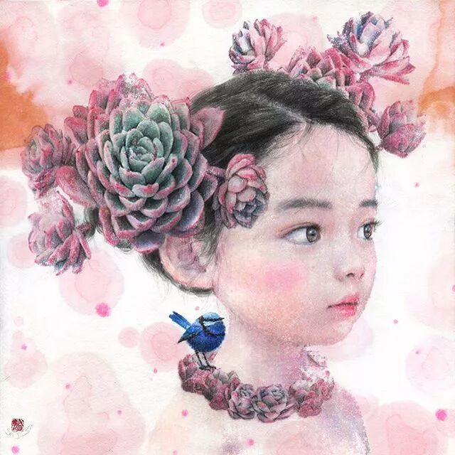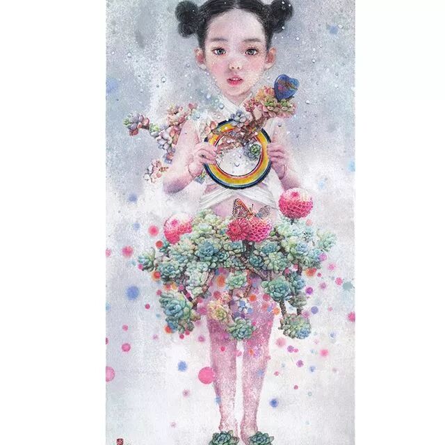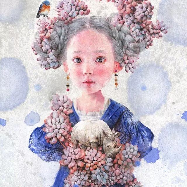 她画中的题材多为女孩子和一些动植物,