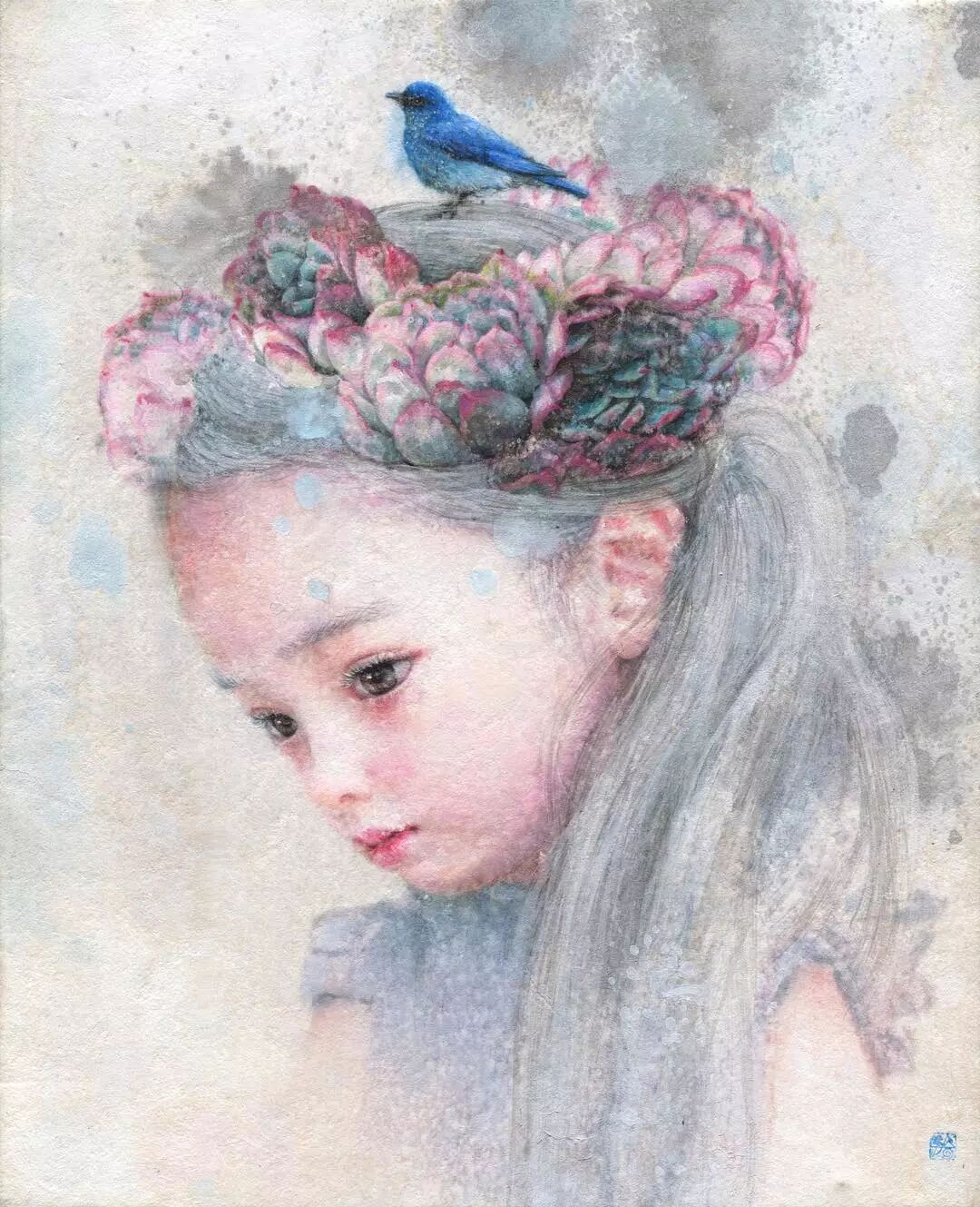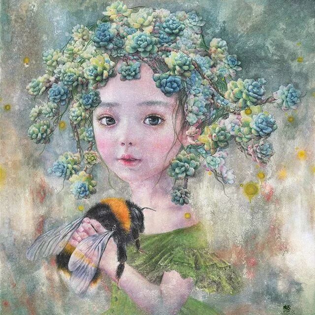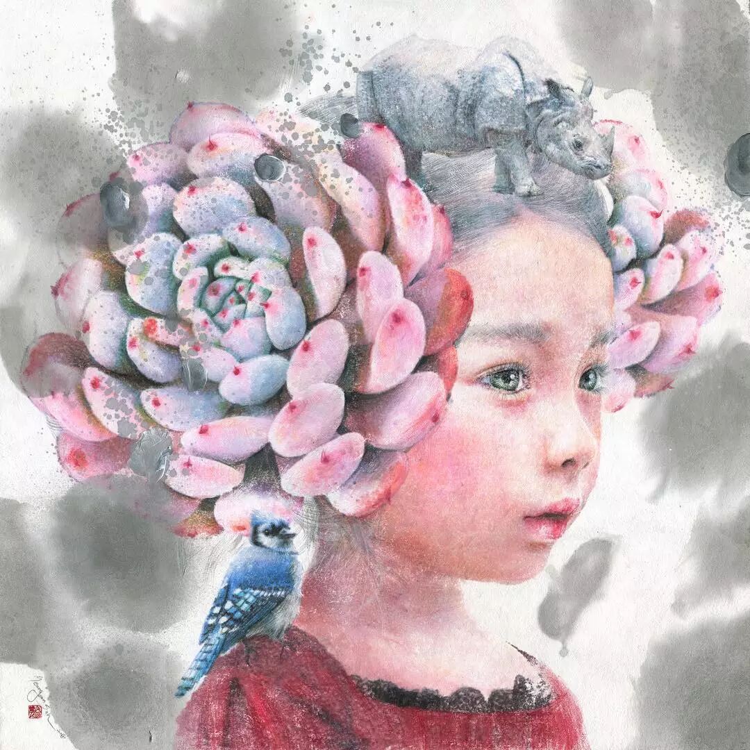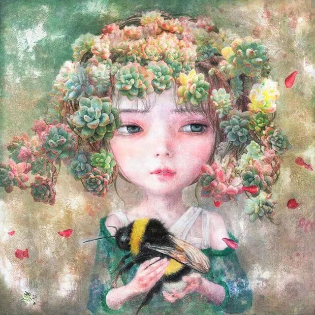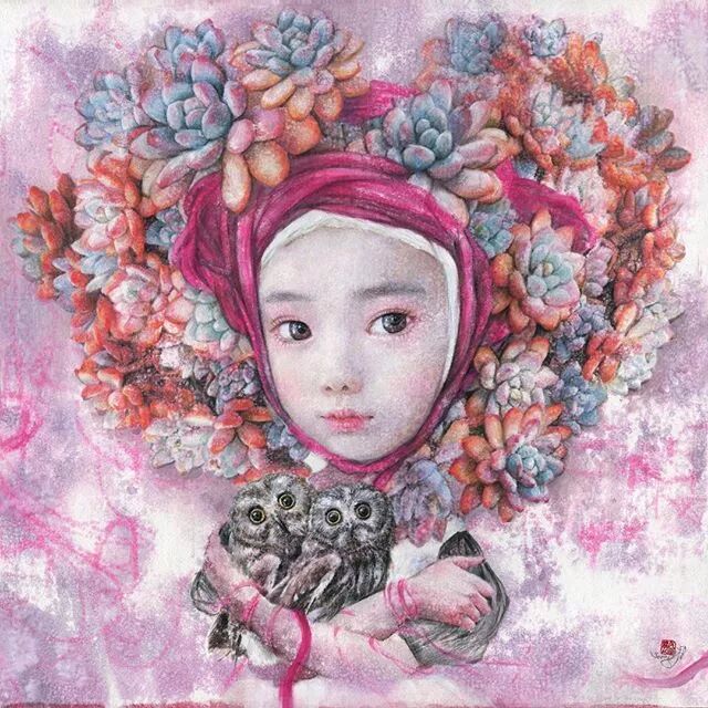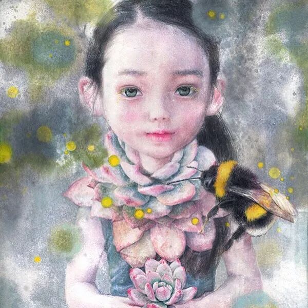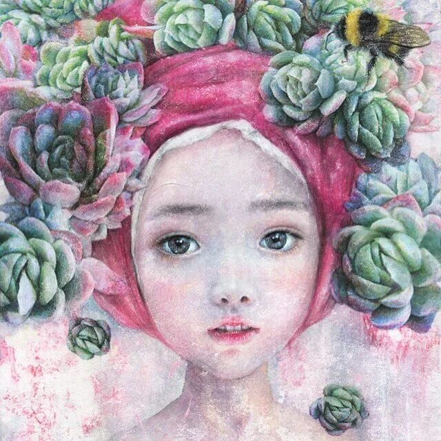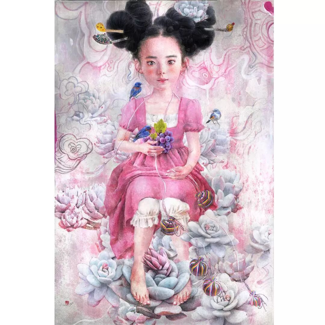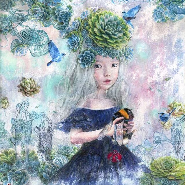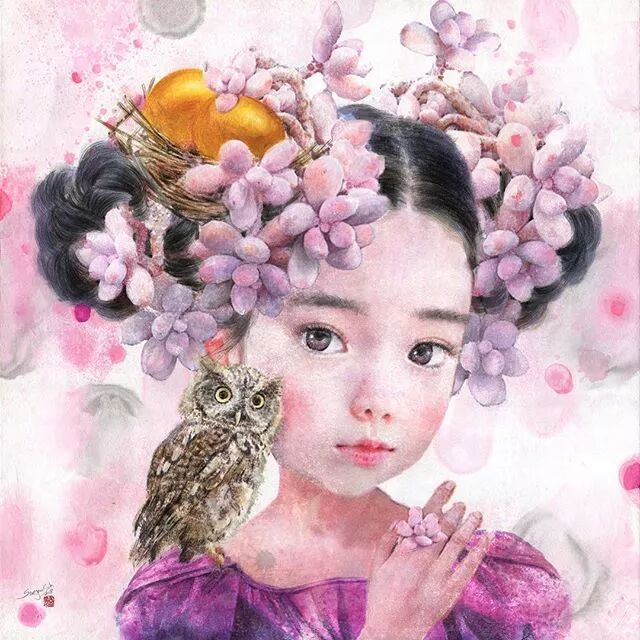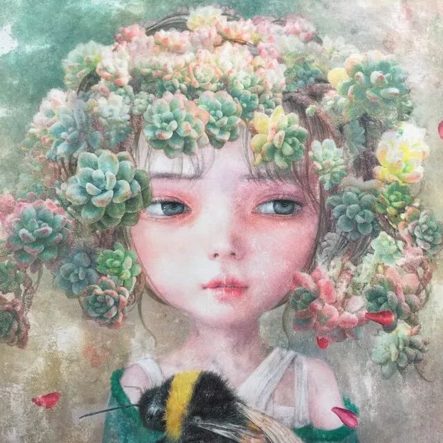 她画中的题材多为女孩子和一些动植物,