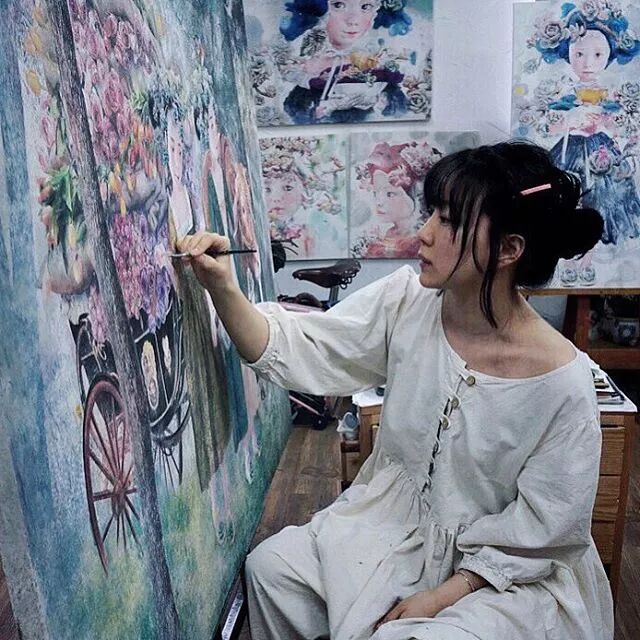 与她笔下柔美的女孩绘画叠加在一起
