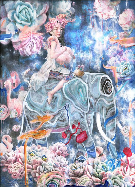 将东方艺术风格的材料和西式油画混合而成