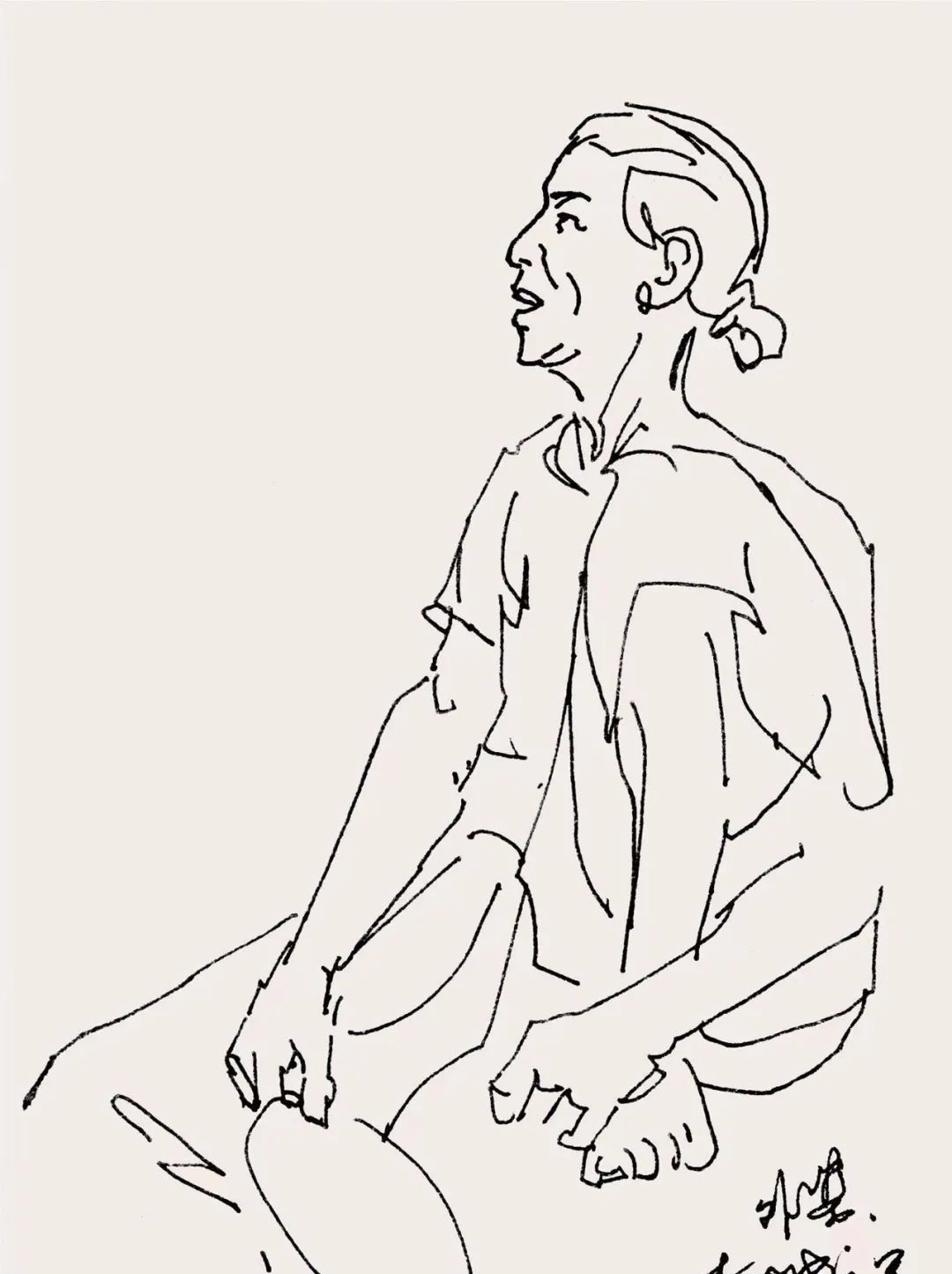 生活中的每一次心灵颤动都是我速写的记录,我的艺术人生。我以线作为速写的主要表达方式,每一根线条都是我心灵的痕迹。线条的疏密、曲直、停走都牵动着我的心。概括是我取舍的理念,疏密中藏着我的黑白灰观点。
