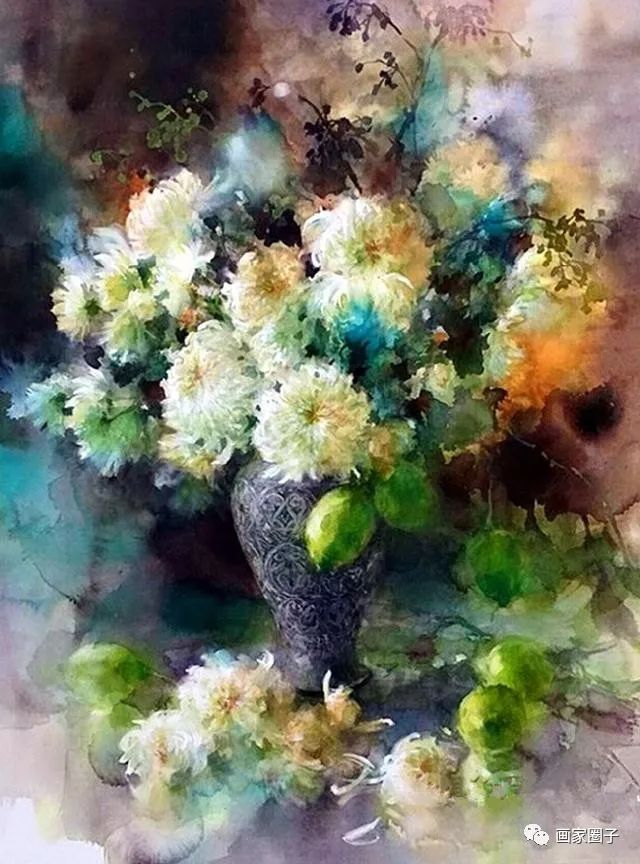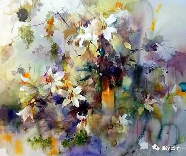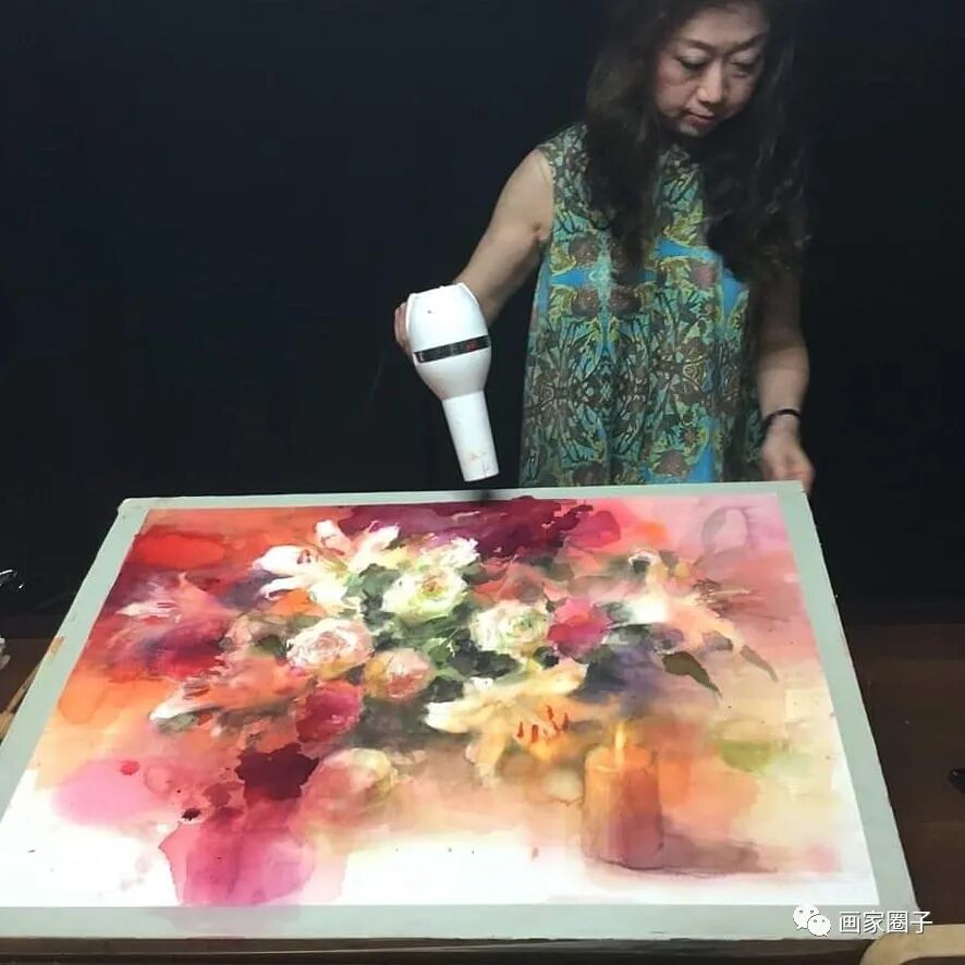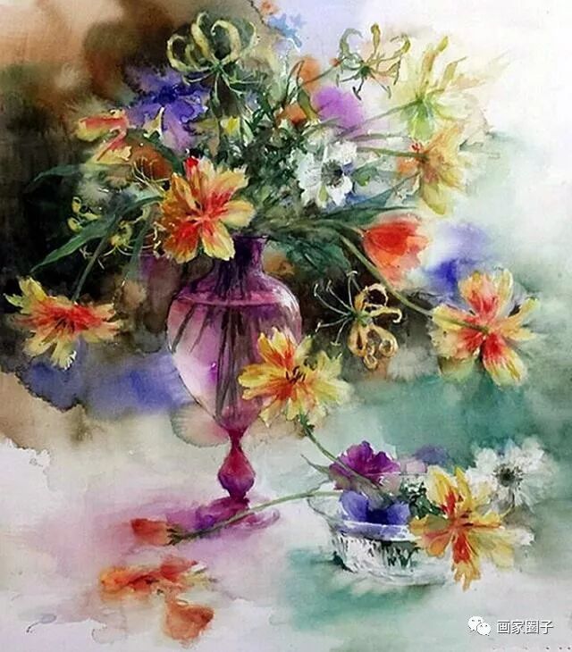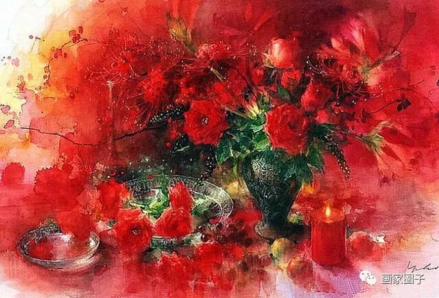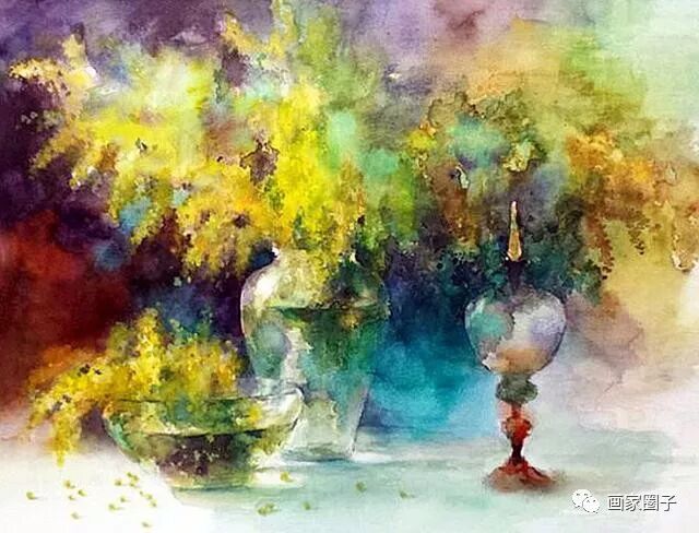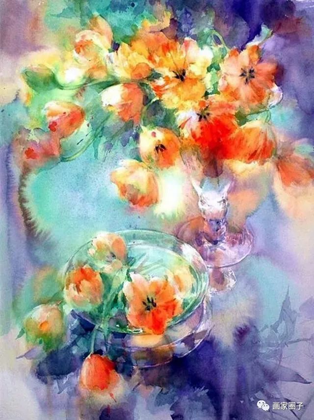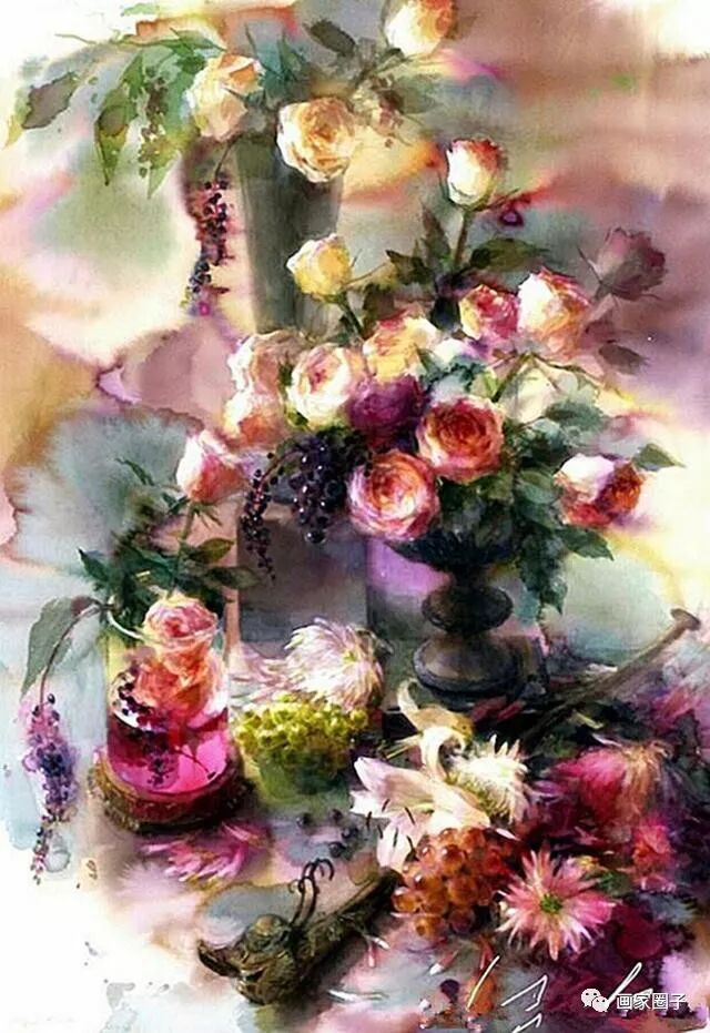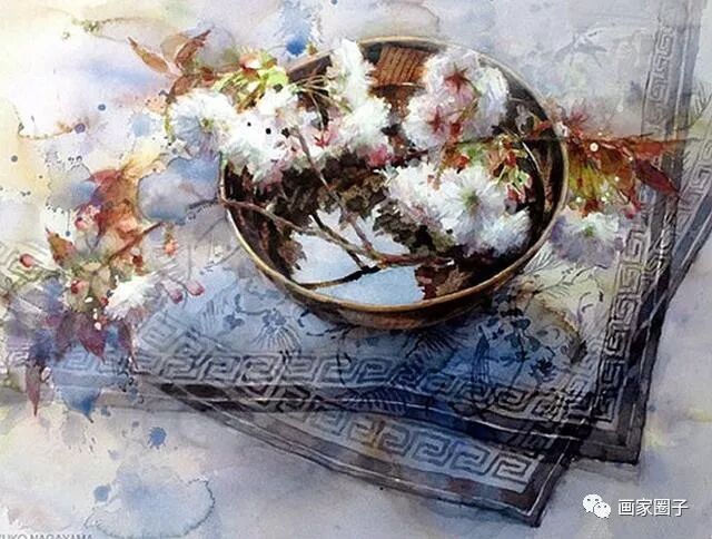 看她笔下的玻璃瓶或碗多么通透,花朵氤氲的气氛多么恰到好处。与一般水彩技能专注于写实不同,永山裕子的水彩作品达到一种写实与写意的平衡。其笔下有生命力的花朵和绚烂奔放的背景达到一种意蕴缭绕的境界。而且我认为她无论写实还是写意都是顶尖级的。