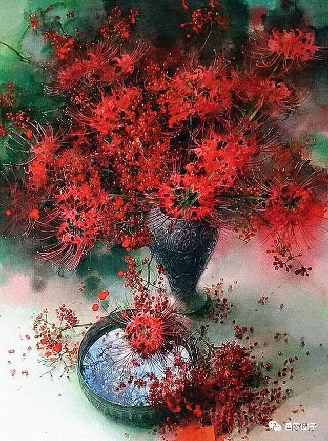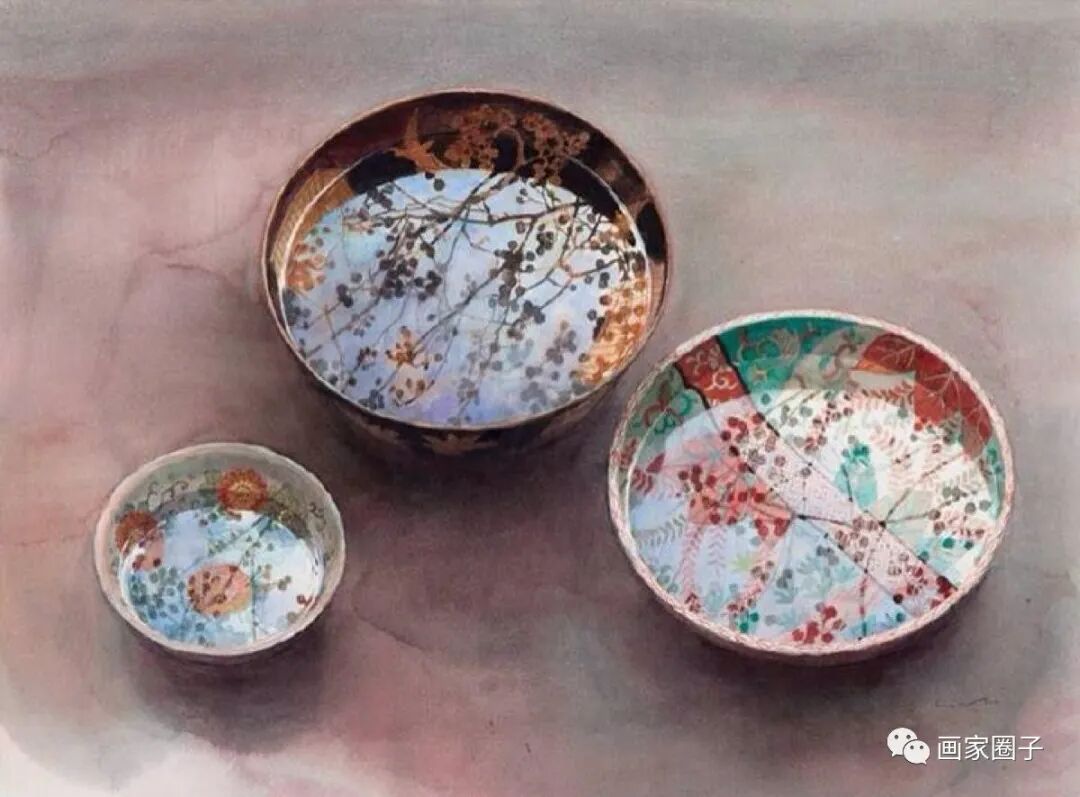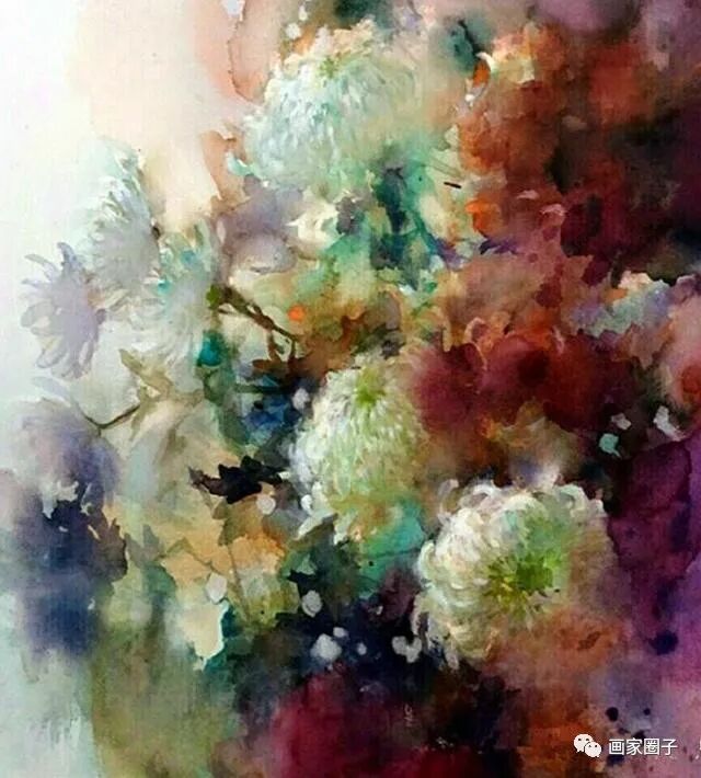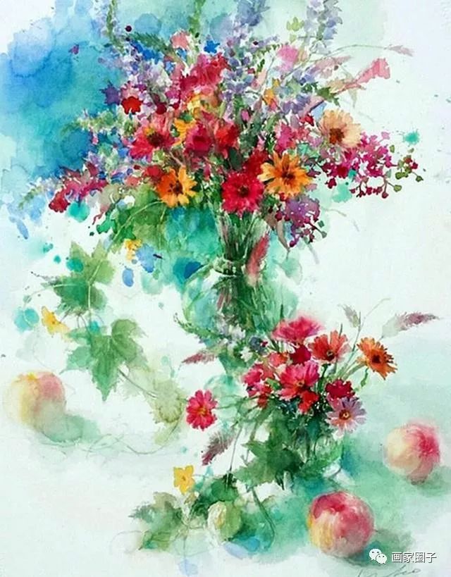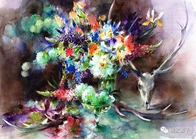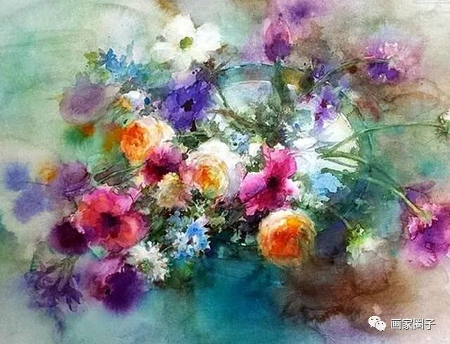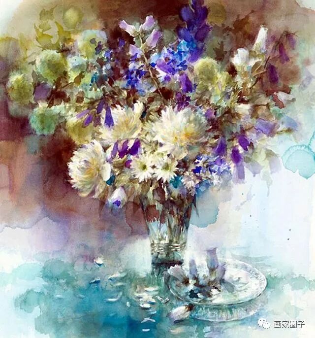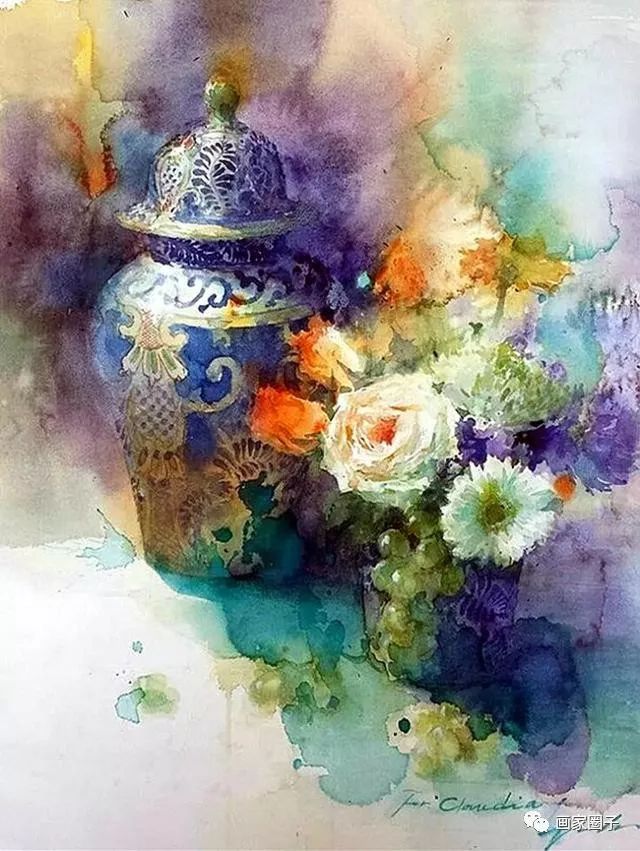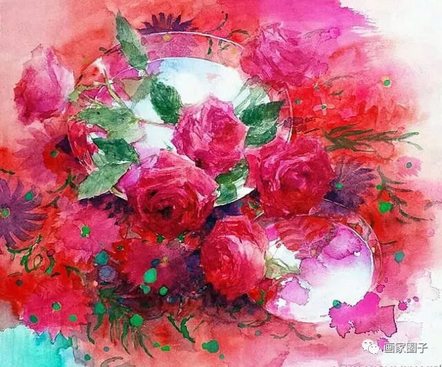 看她笔下的玻璃瓶或碗多么通透,花朵氤氲的气氛多么恰到好处。与一般水彩技能专注于写实不同,永山裕子的水彩作品达到一种写实与写意的平衡。其笔下有生命力的花朵和绚烂奔放的背景达到一种意蕴缭绕的境界。而且我认为她无论写实还是写意都是顶尖级的。