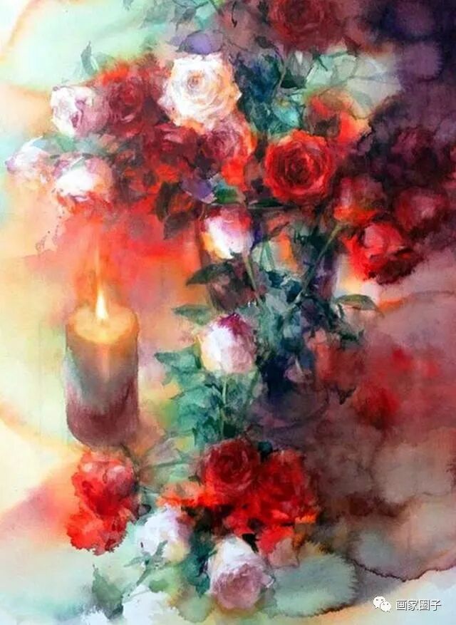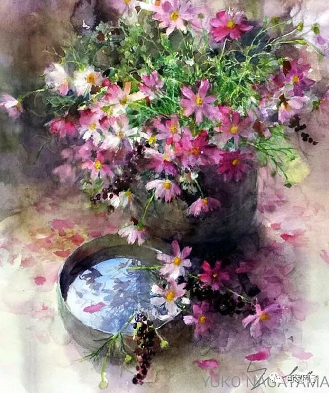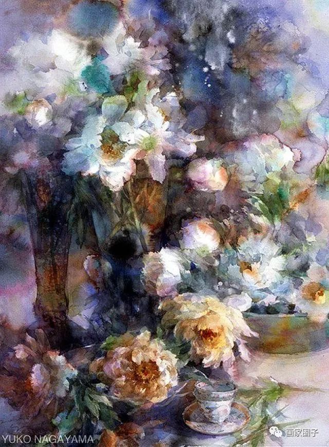 永山裕子,日本最具代表性的水彩画家。1963年出生于东京,1985年毕业于东京艺术大学油画系,同年获安宅奖、大桥奖,1987年完成东京艺术大学研究生学习,现为武藏野美术大学油画系讲师。永山裕子的水彩花卉,融写实与写意为一体,水色光影、花影摇曳、浓郁高雅,在仿佛油画般的浓郁渲染中,飘溢着水彩画特有的透明感。尤其是色彩之间的对比和过渡尤为绝妙,细细观赏,你会陶醉于细腻的笔触,清晰的层次,动人的明暗处理中,让人不敢相信这些作品竟然是用水彩画成。这几年,永山裕子将透明水彩作品的重心放到了花卉、静物、人物、风景等内容的水彩画上,广受欢迎。