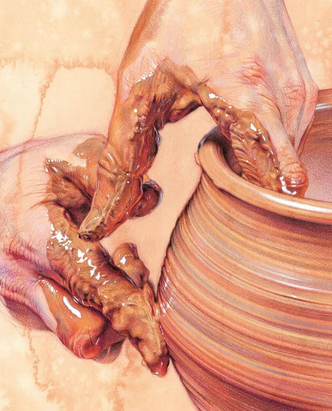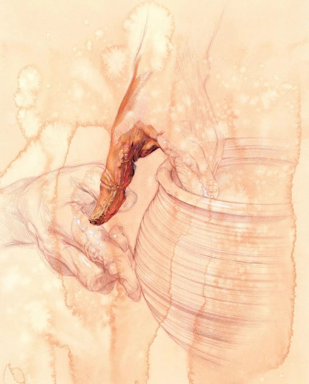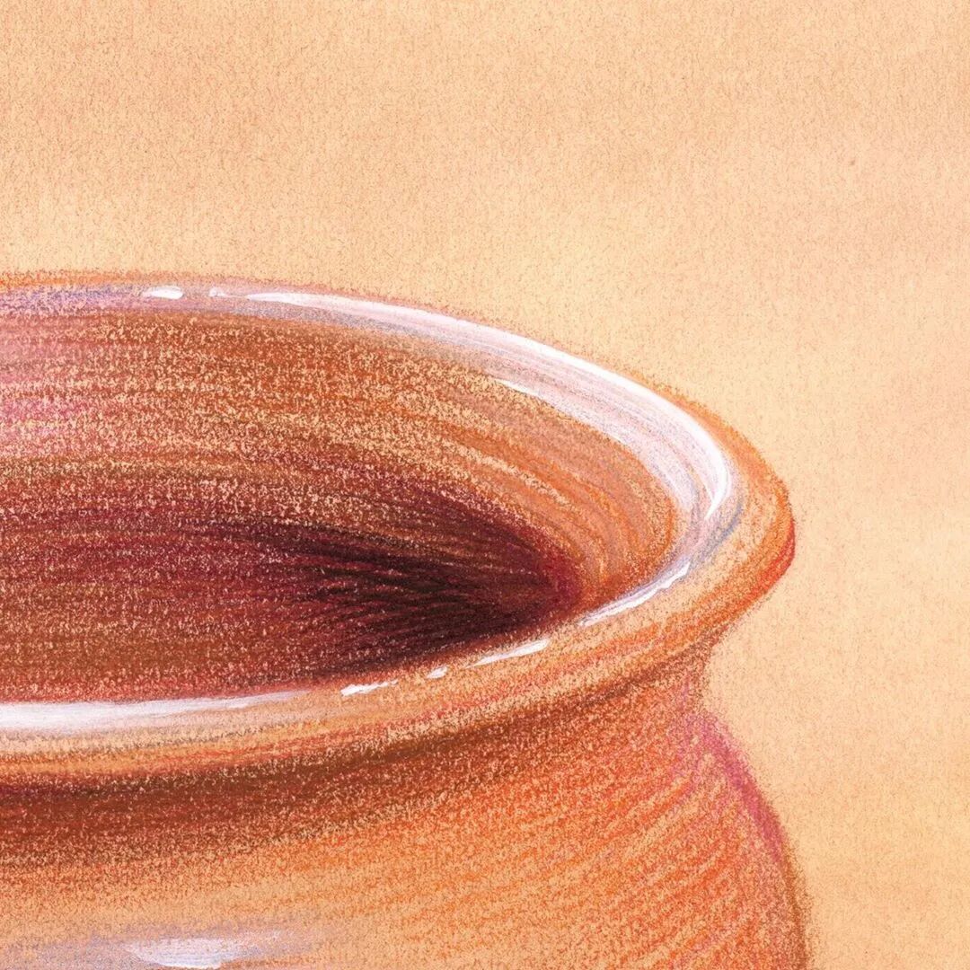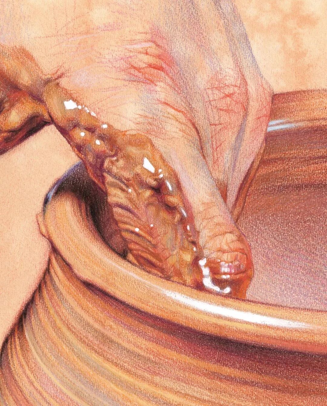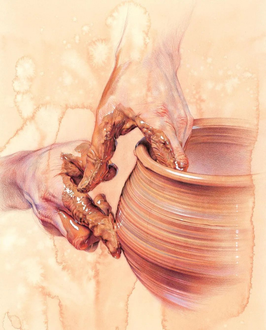 两三种颜色就表现出手部每一个细节,柔和的曲线明暗、层次、空间感很强,手托住陶罐的质感非常的鲜明、饱满光滑的肌肤,笔触的细微之处给了我们视觉和触觉的感受,见证他极强的美术功底。