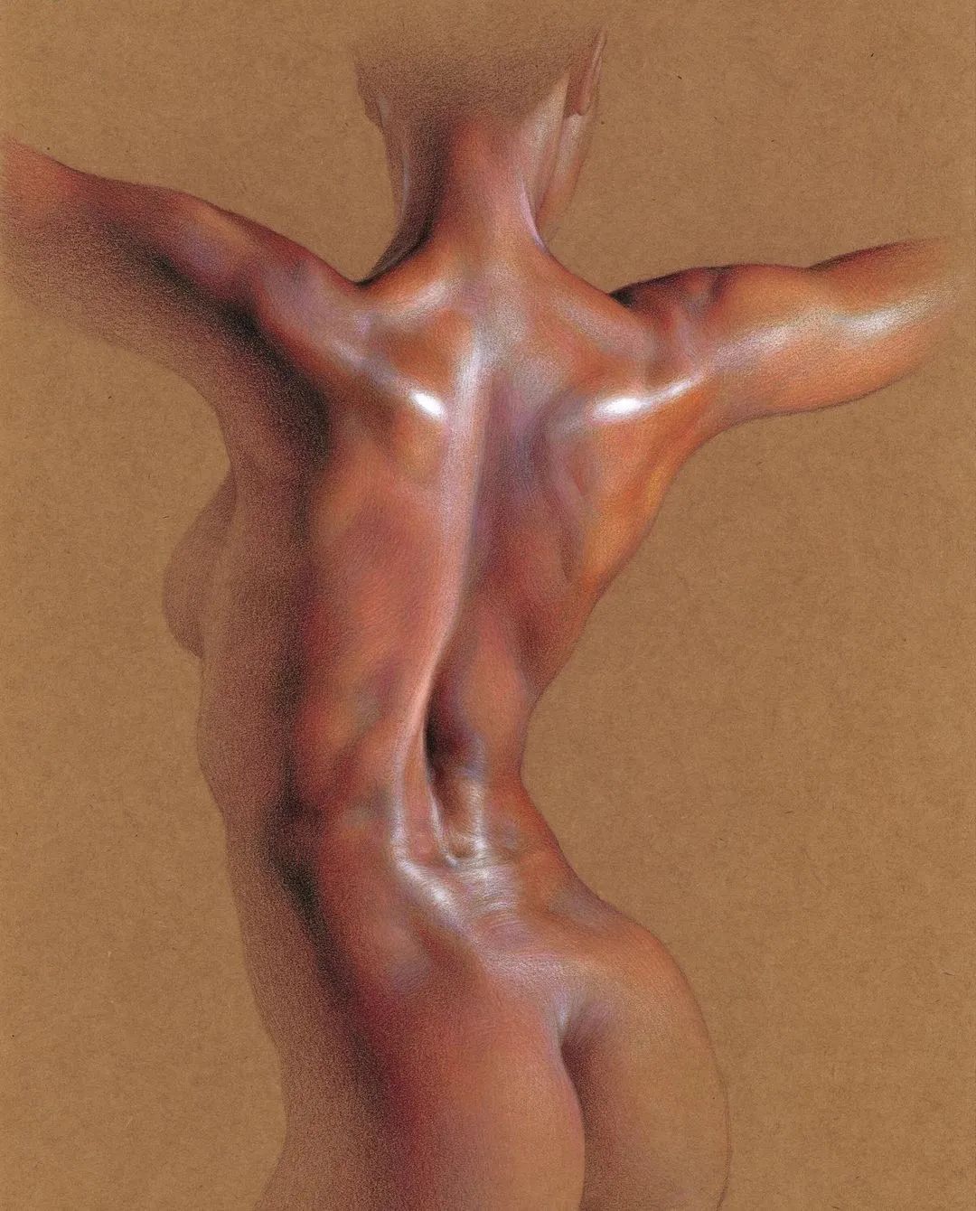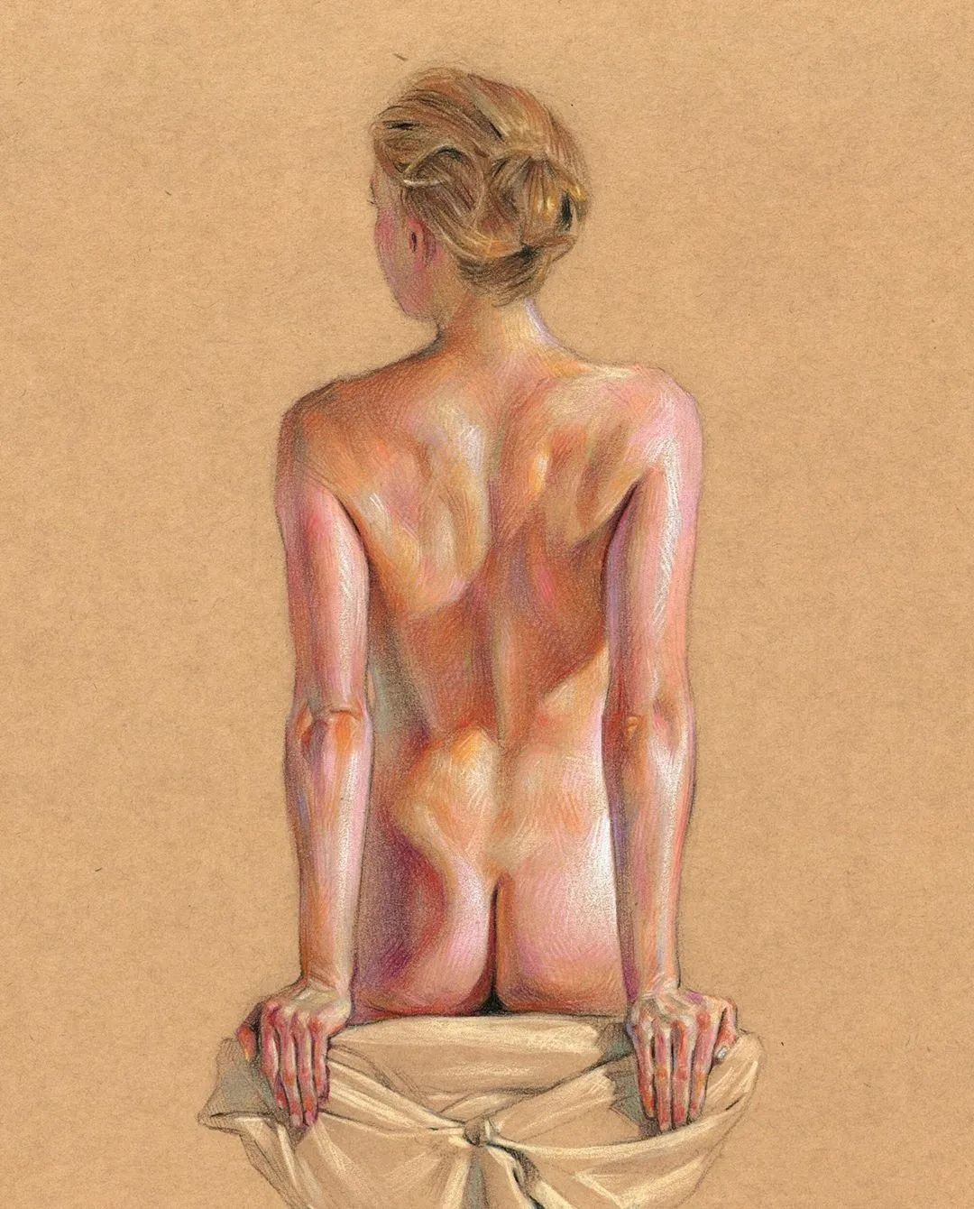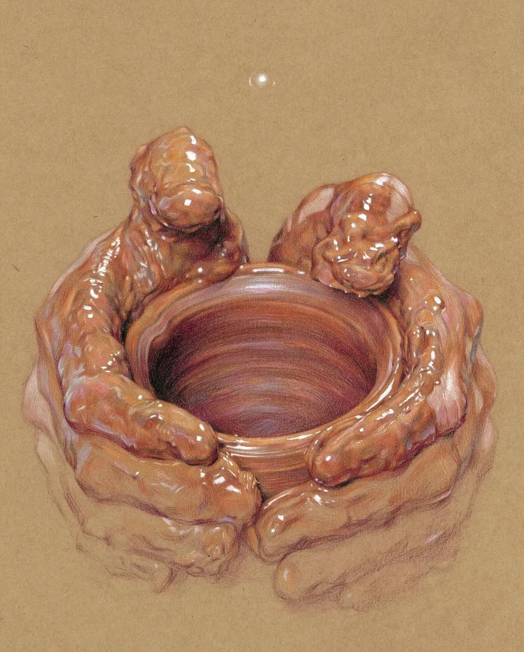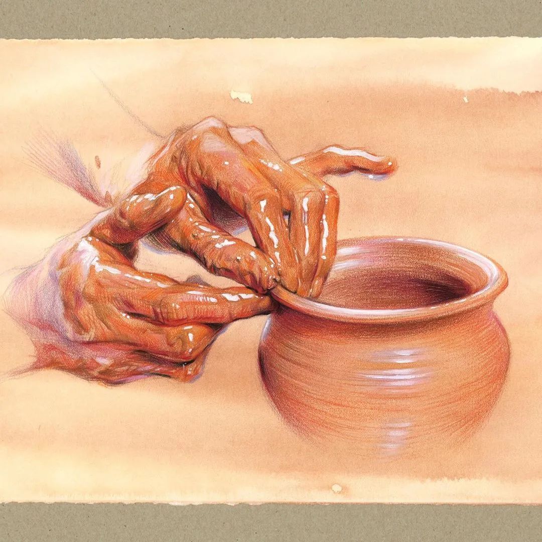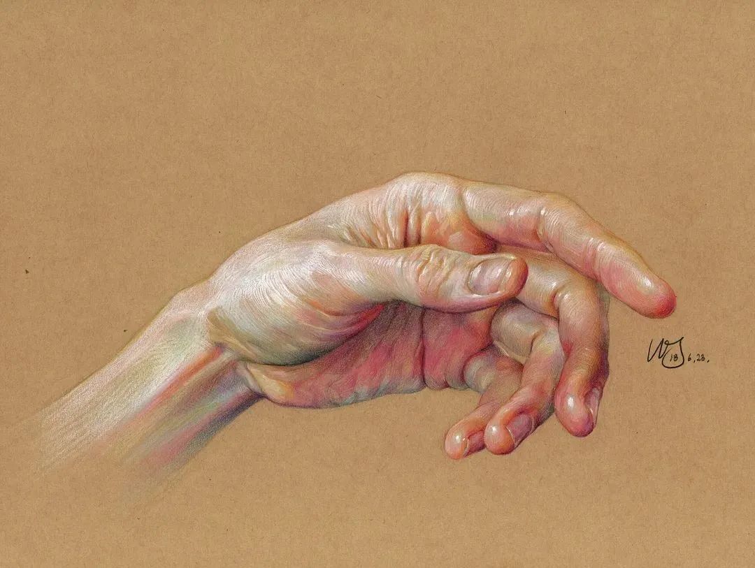 两三种颜色就表现出手部每一个细节,柔和的曲线明暗、层次、空间感很强,手托住陶罐的质感非常的鲜明、饱满光滑的肌肤,笔触的细微之处给了我们视觉和触觉的感受,见证他极强的美术功底。