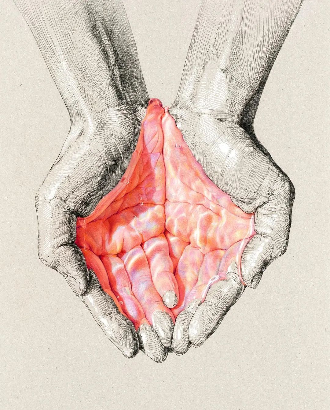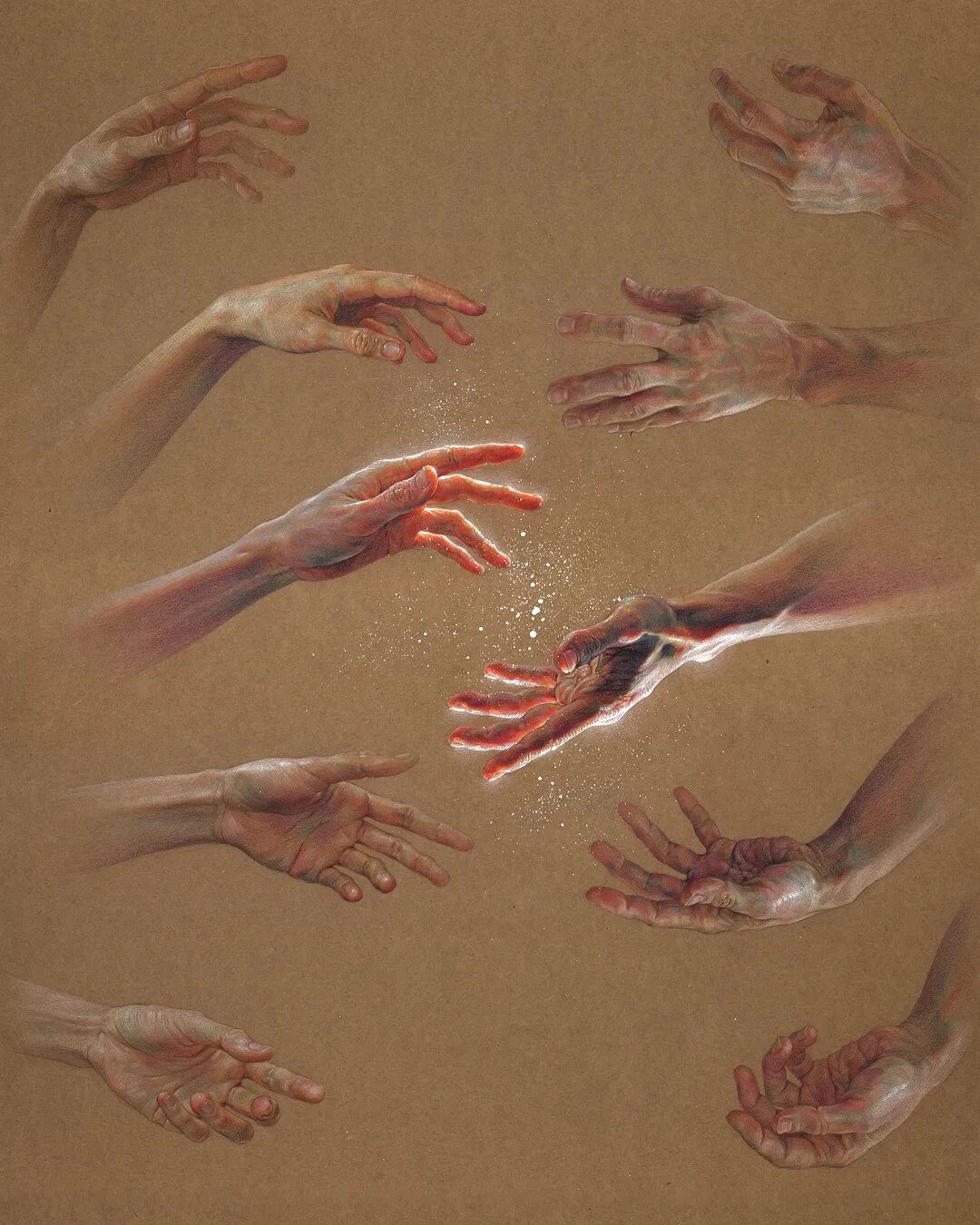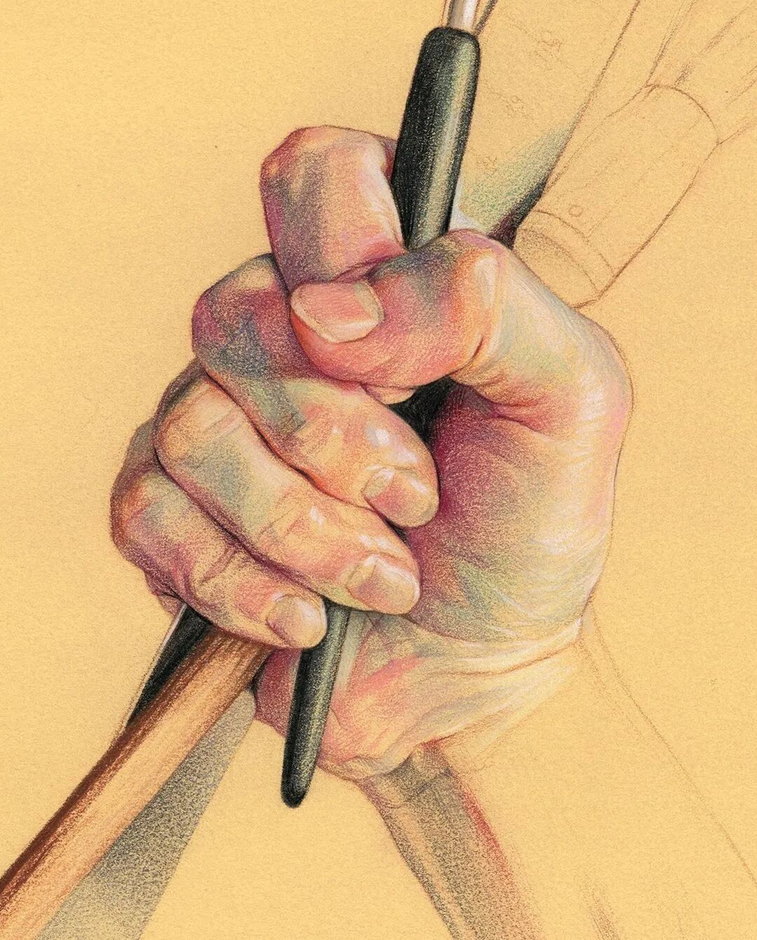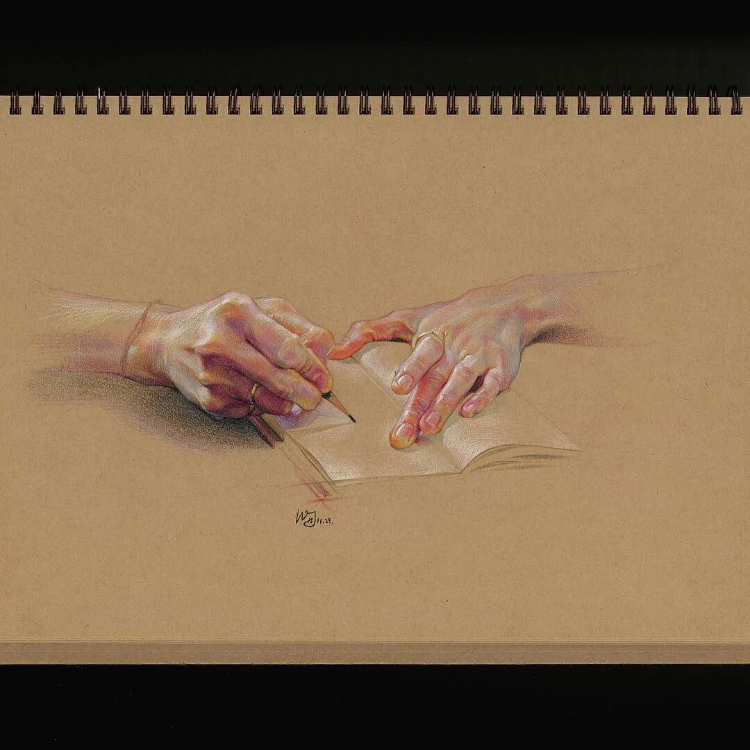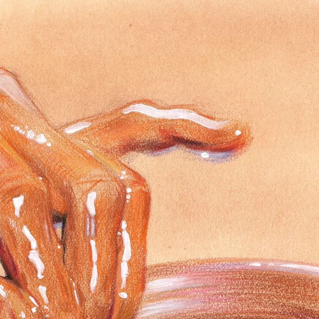 两三种颜色就表现出手部每一个细节,柔和的曲线明暗、层次、空间感很强,手托住陶罐的质感非常的鲜明、饱满光滑的肌肤,笔触的细微之处给了我们视觉和触觉的感受,见证他极强的美术功底。