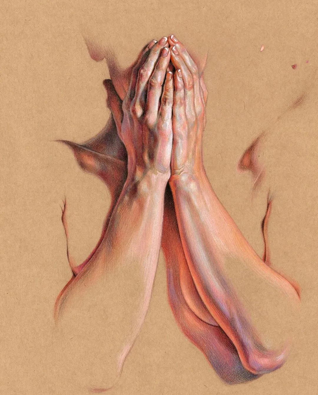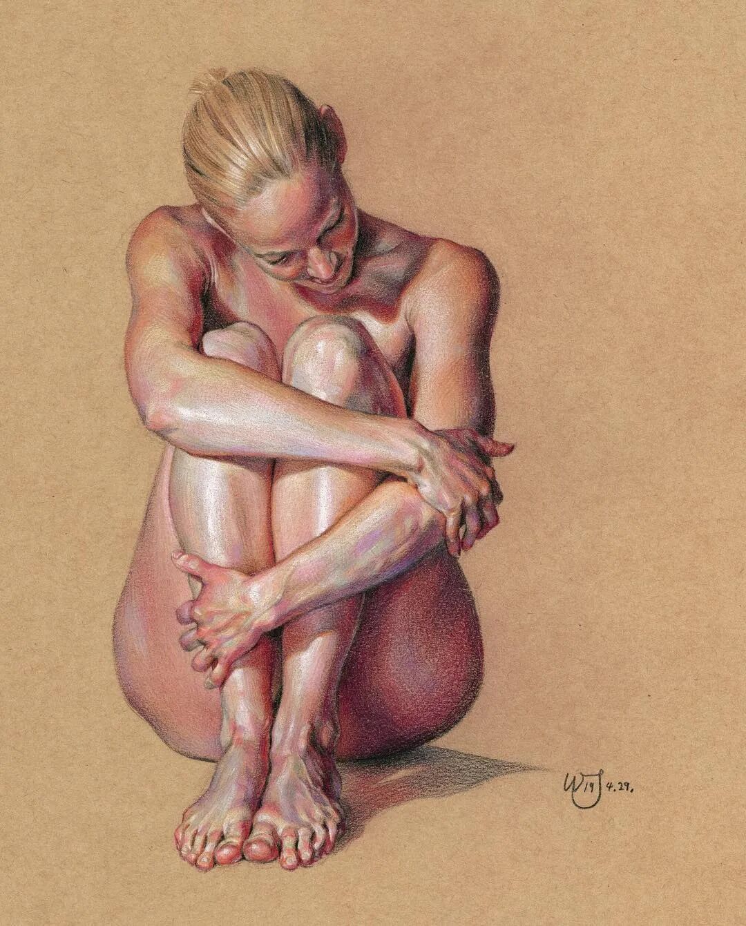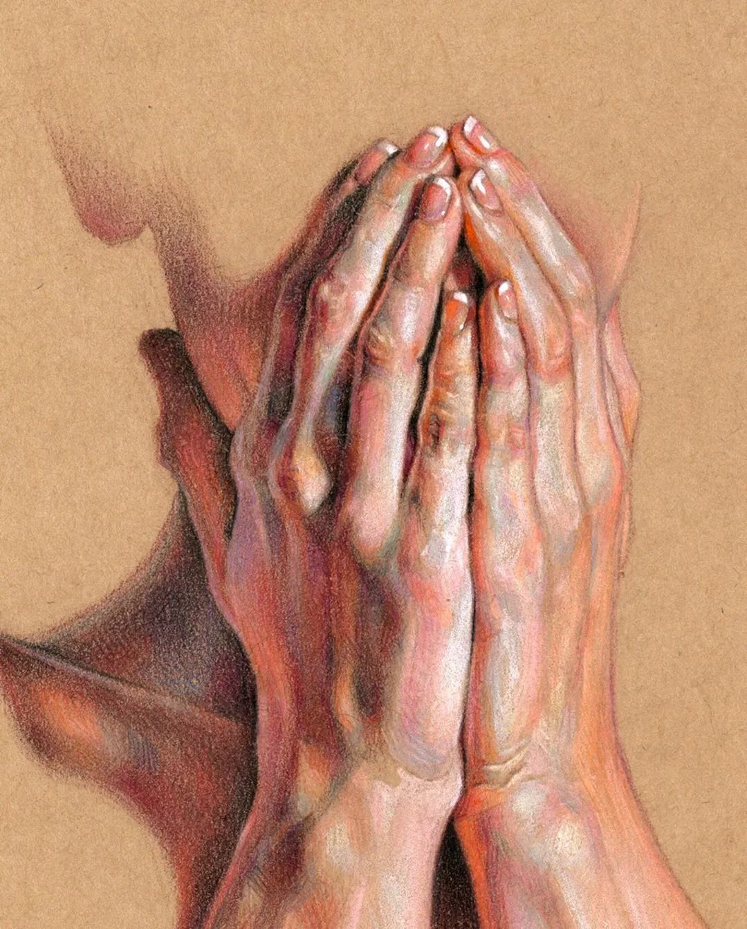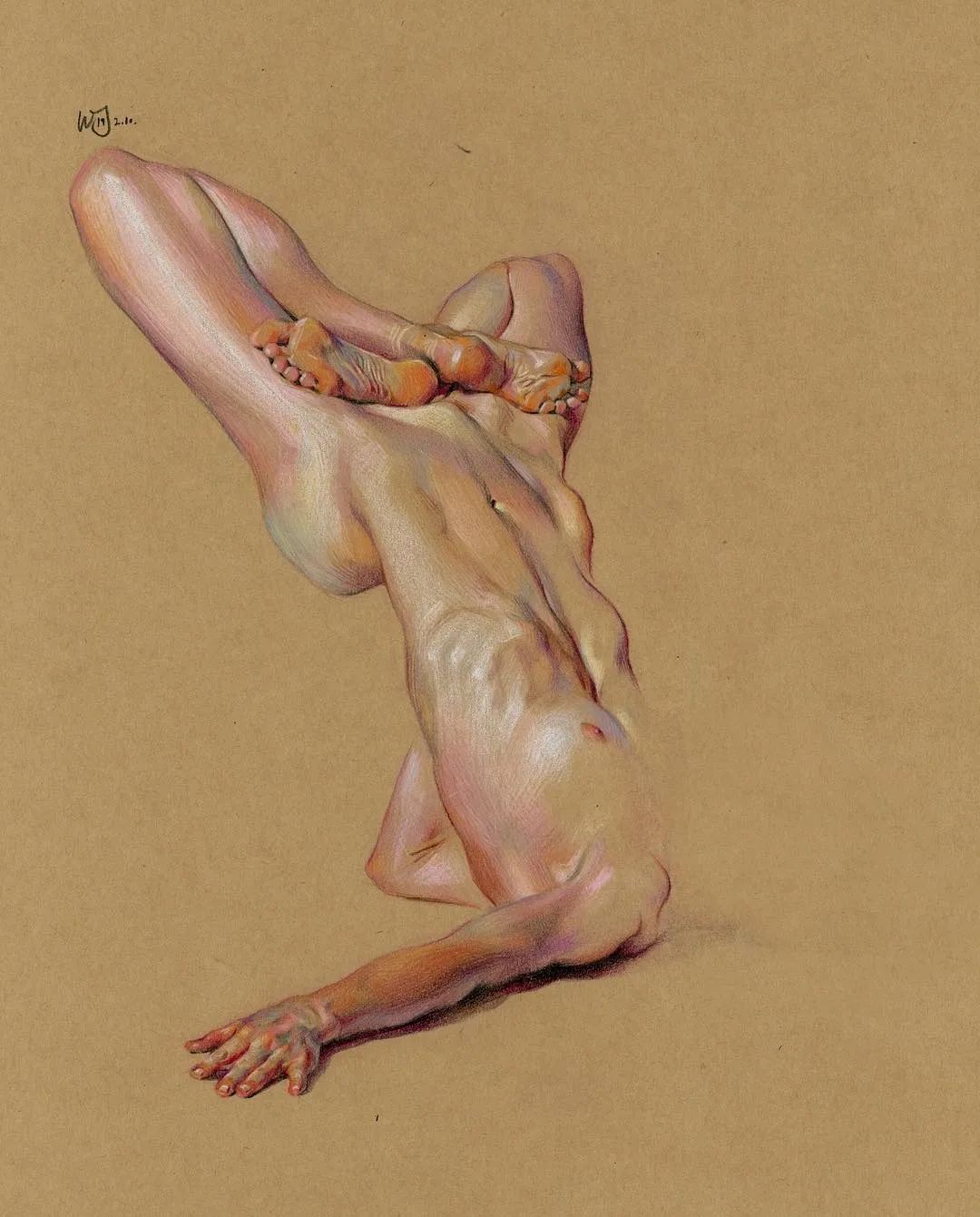 两三种颜色就表现出手部每一个细节,柔和的曲线明暗、层次、空间感很强,手托住陶罐的质感非常的鲜明、饱满光滑的肌肤,笔触的细微之处给了我们视觉和触觉的感受,见证他极强的美术功底。