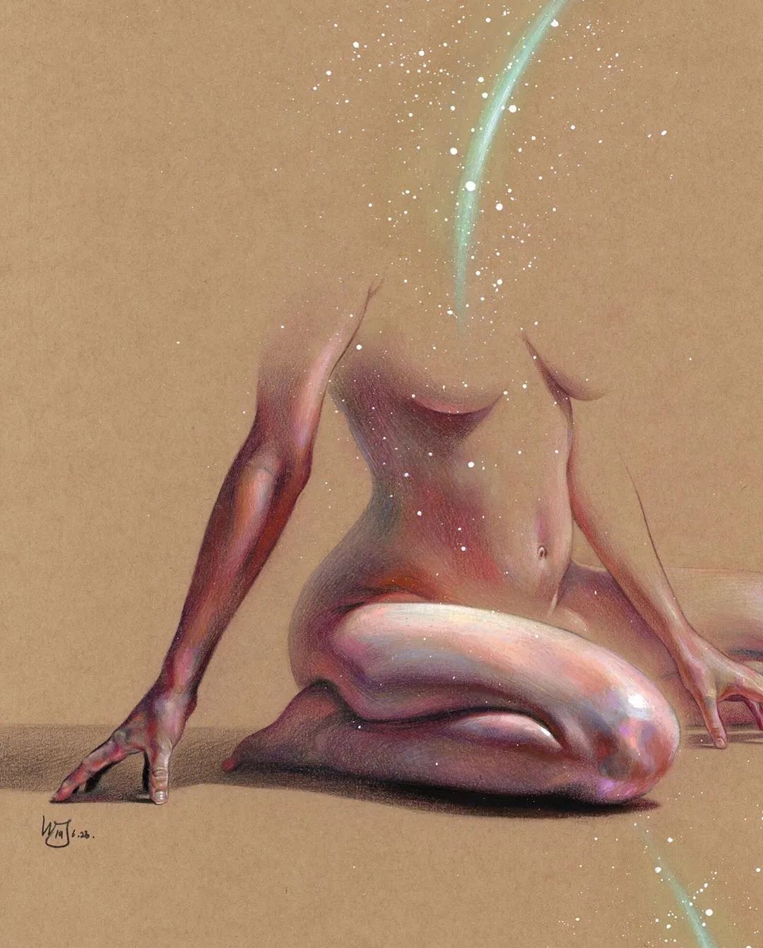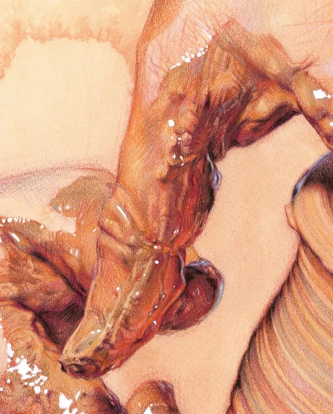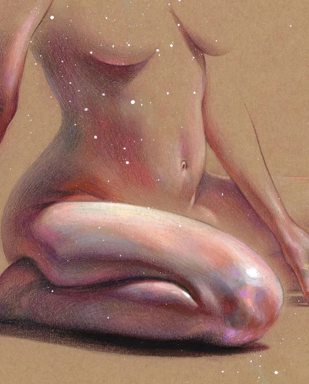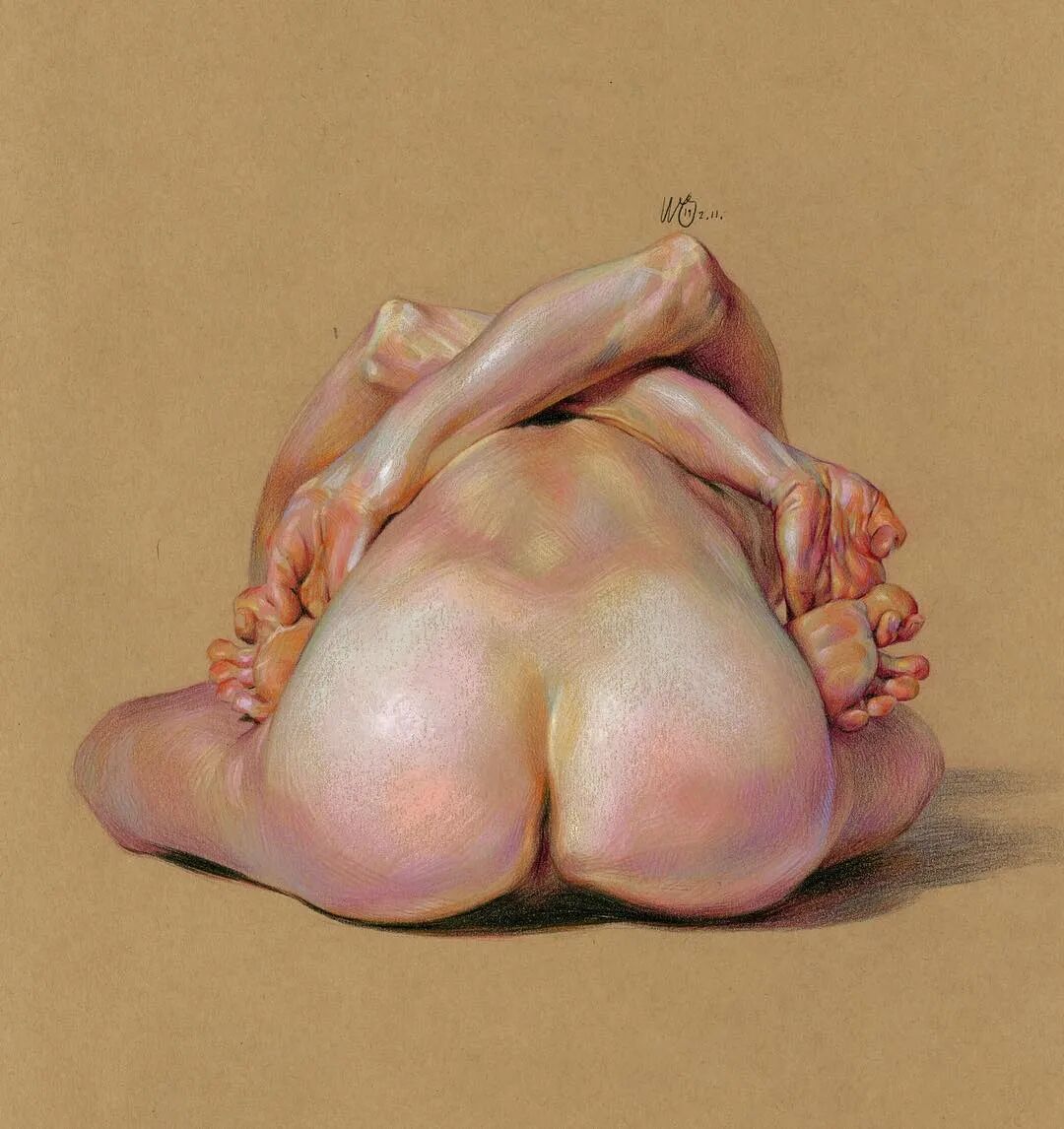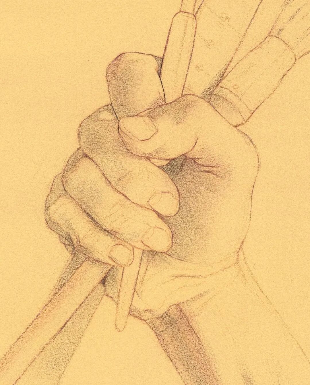两三种颜色就表现出手部每一个细节,柔和的曲线明暗、层次、空间感很强,手托住陶罐的质感非常的鲜明、饱满光滑的肌肤,笔触的细微之处给了我们视觉和触觉的感受,见证他极强的美术功底。