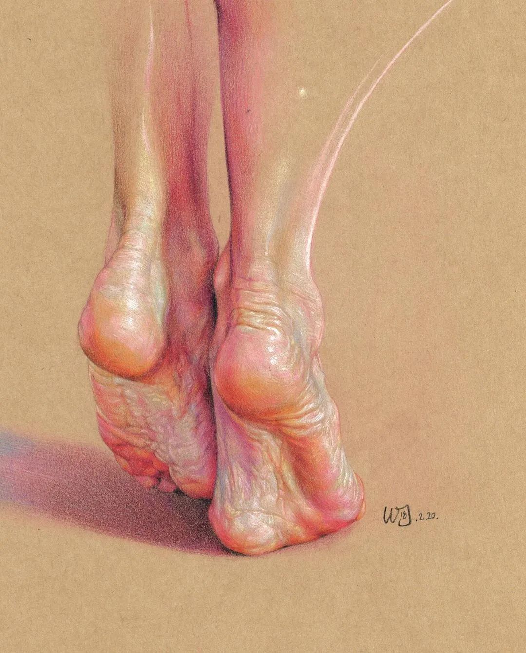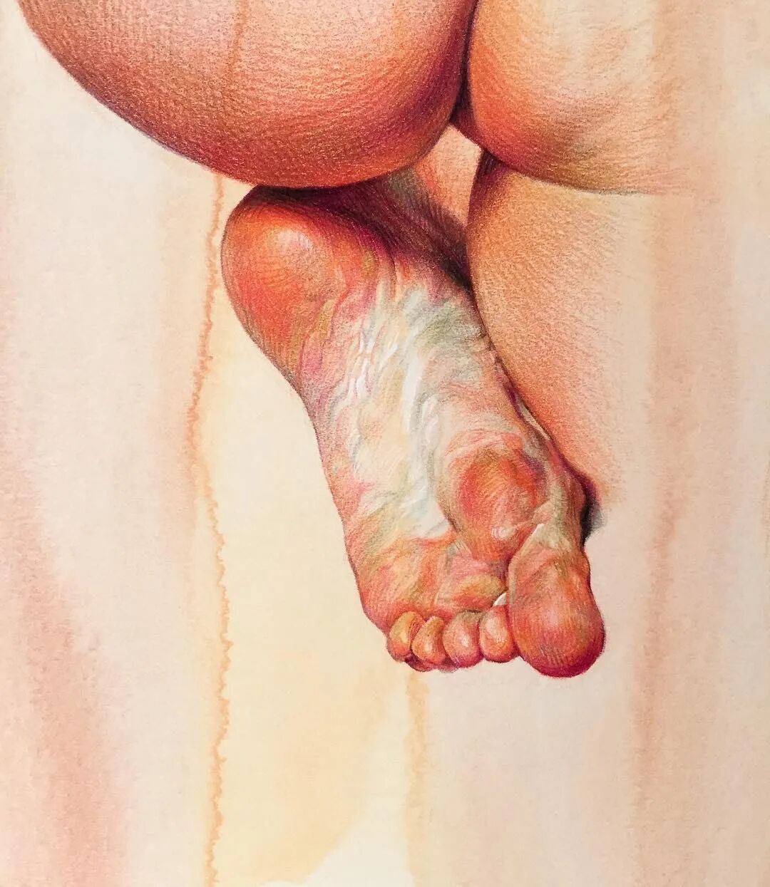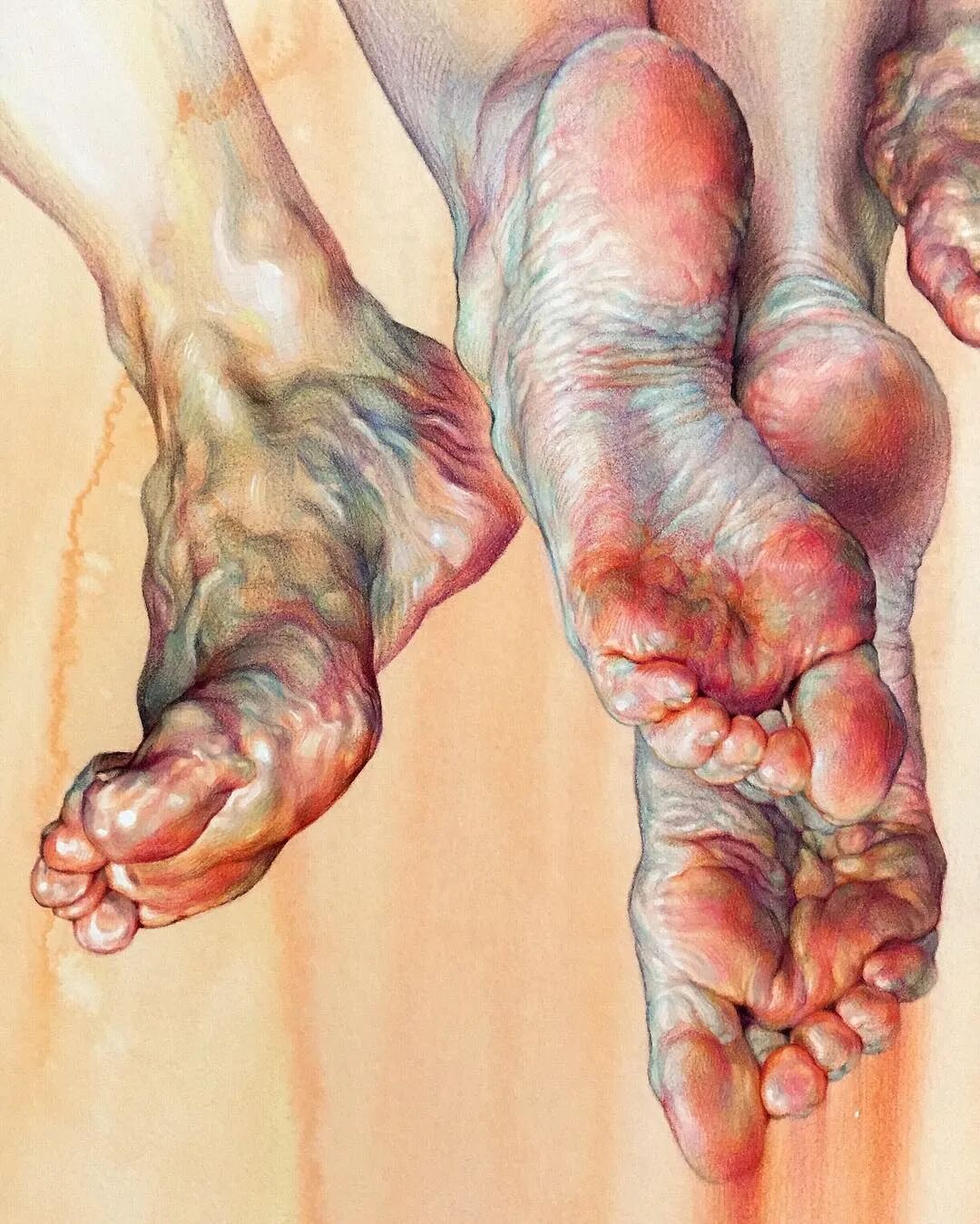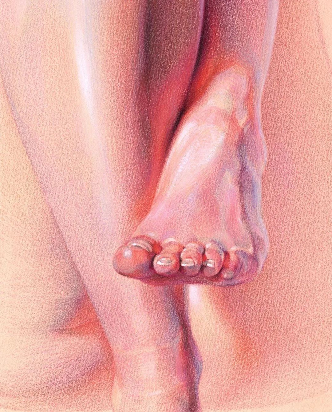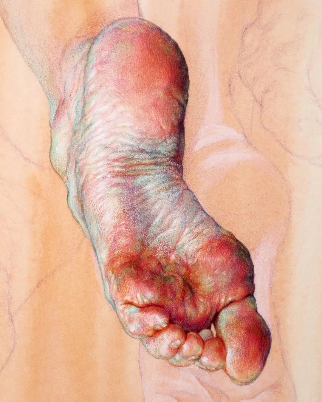 “这张脚底局部,他处理的非常好,依旧是彩铅打底,在处理皮肤上,花了很长时间,由于脚底很多褶皱、细纹,轮廓比较深,所以在处理脚趾部分用了很多偏暖的颜色来叠加阴影,使这一部分的颜色更加丰富一些。但是要注意冷暖的搭配,以防止出现青紫感。