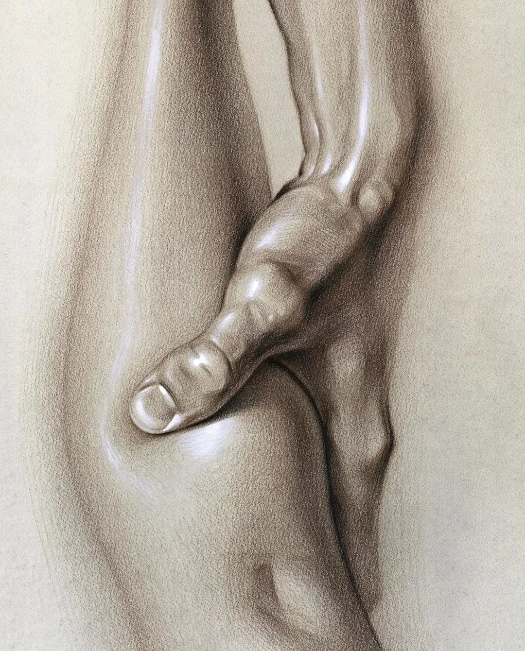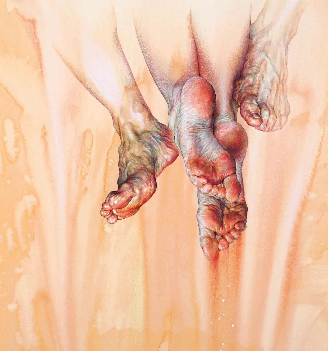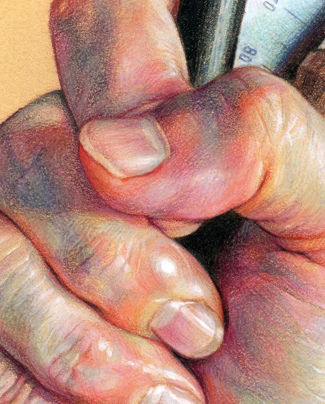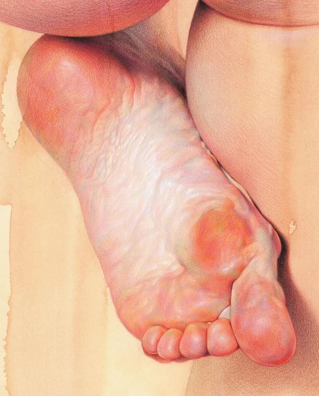 “这张脚底局部,他处理的非常好,依旧是彩铅打底,在处理皮肤上,花了很长时间,由于脚底很多褶皱、细纹,轮廓比较深,所以在处理脚趾部分用了很多偏暖的颜色来叠加阴影,使这一部分的颜色更加丰富一些。但是要注意冷暖的搭配,以防止出现青紫感。
