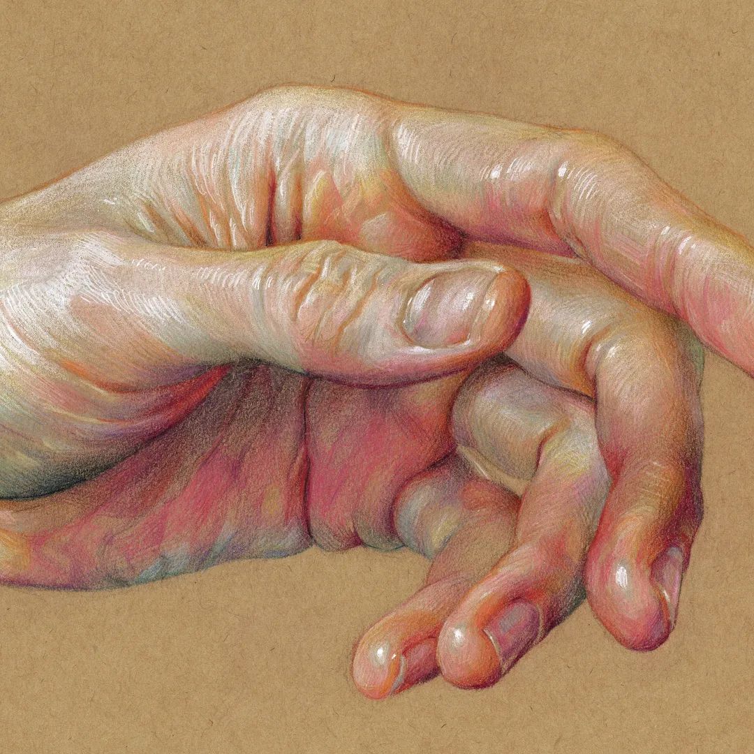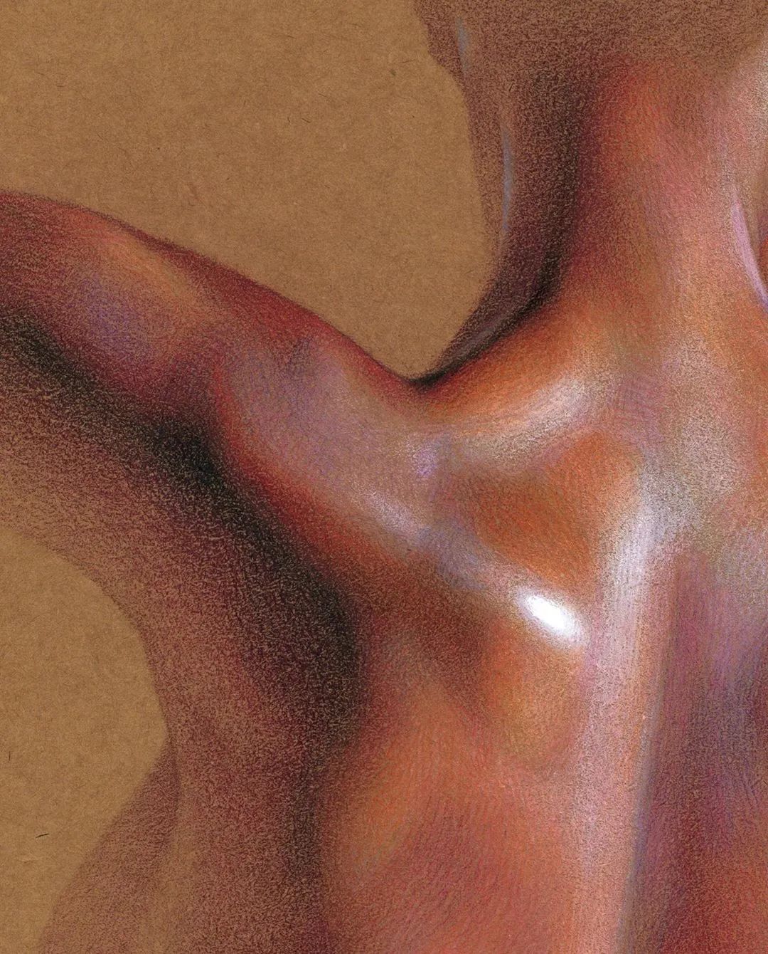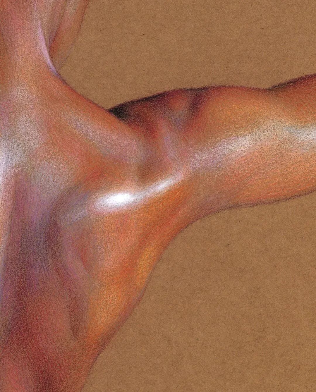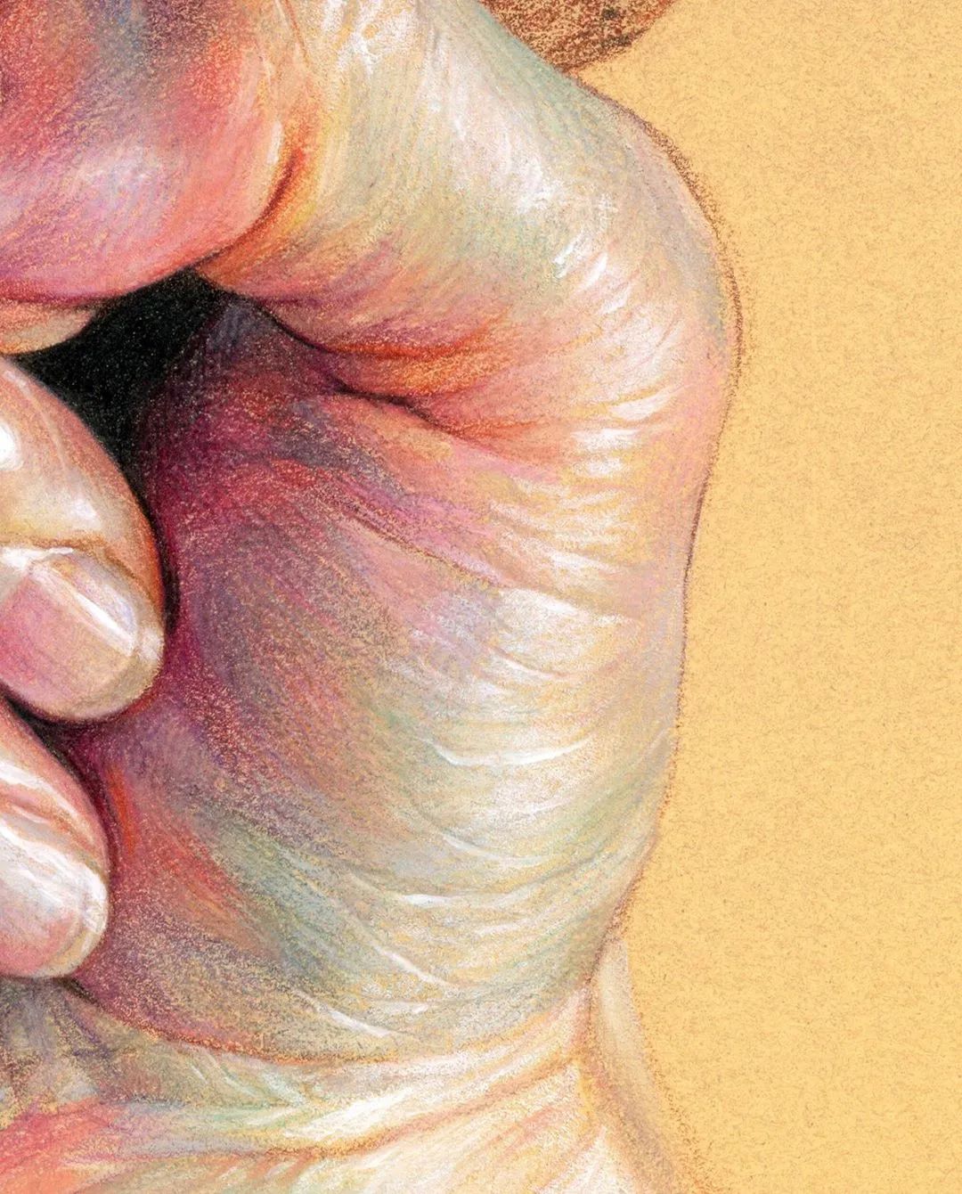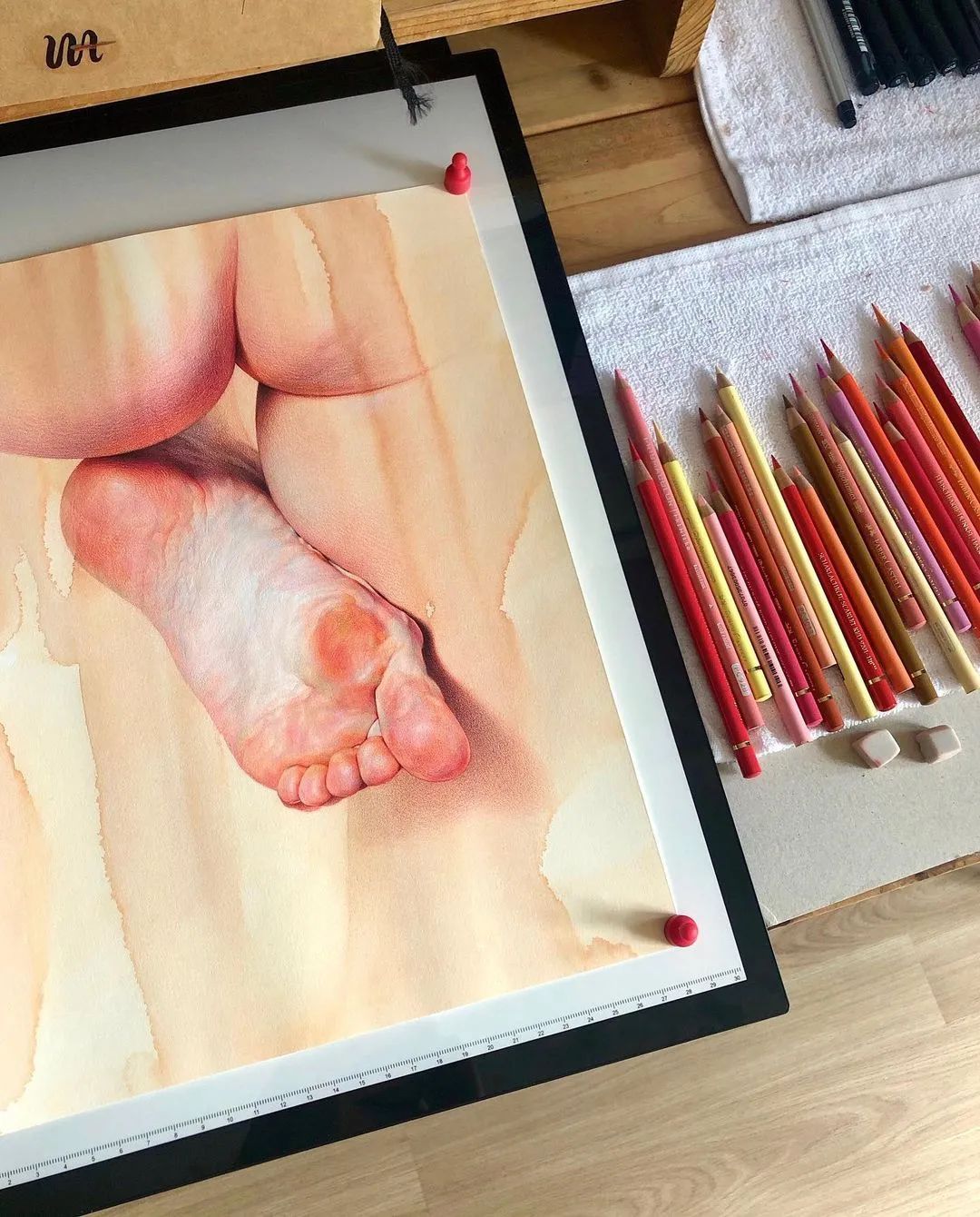 “这张脚底局部,他处理的非常好,依旧是彩铅打底,在处理皮肤上,花了很长时间,由于脚底很多褶皱、细纹,轮廓比较深,所以在处理脚趾部分用了很多偏暖的颜色来叠加阴影,使这一部分的颜色更加丰富一些。但是要注意冷暖的搭配,以防止出现青紫感。