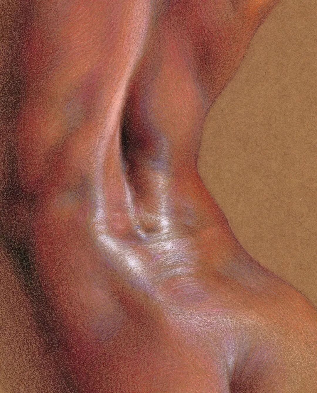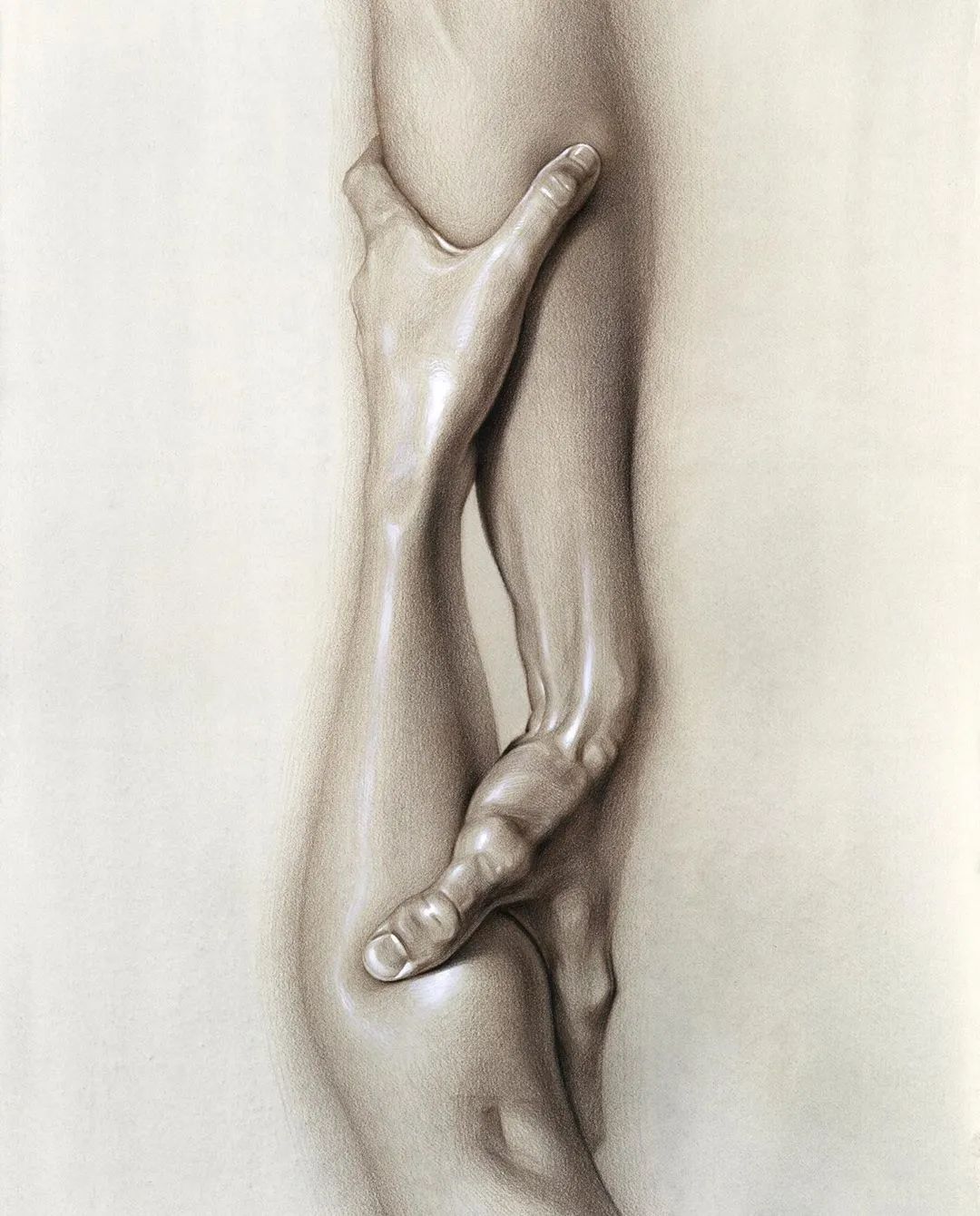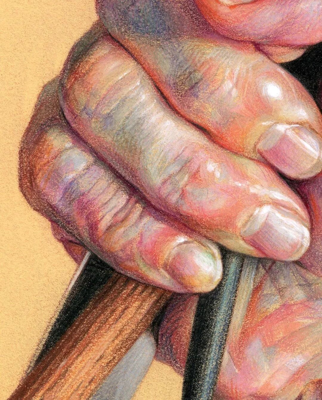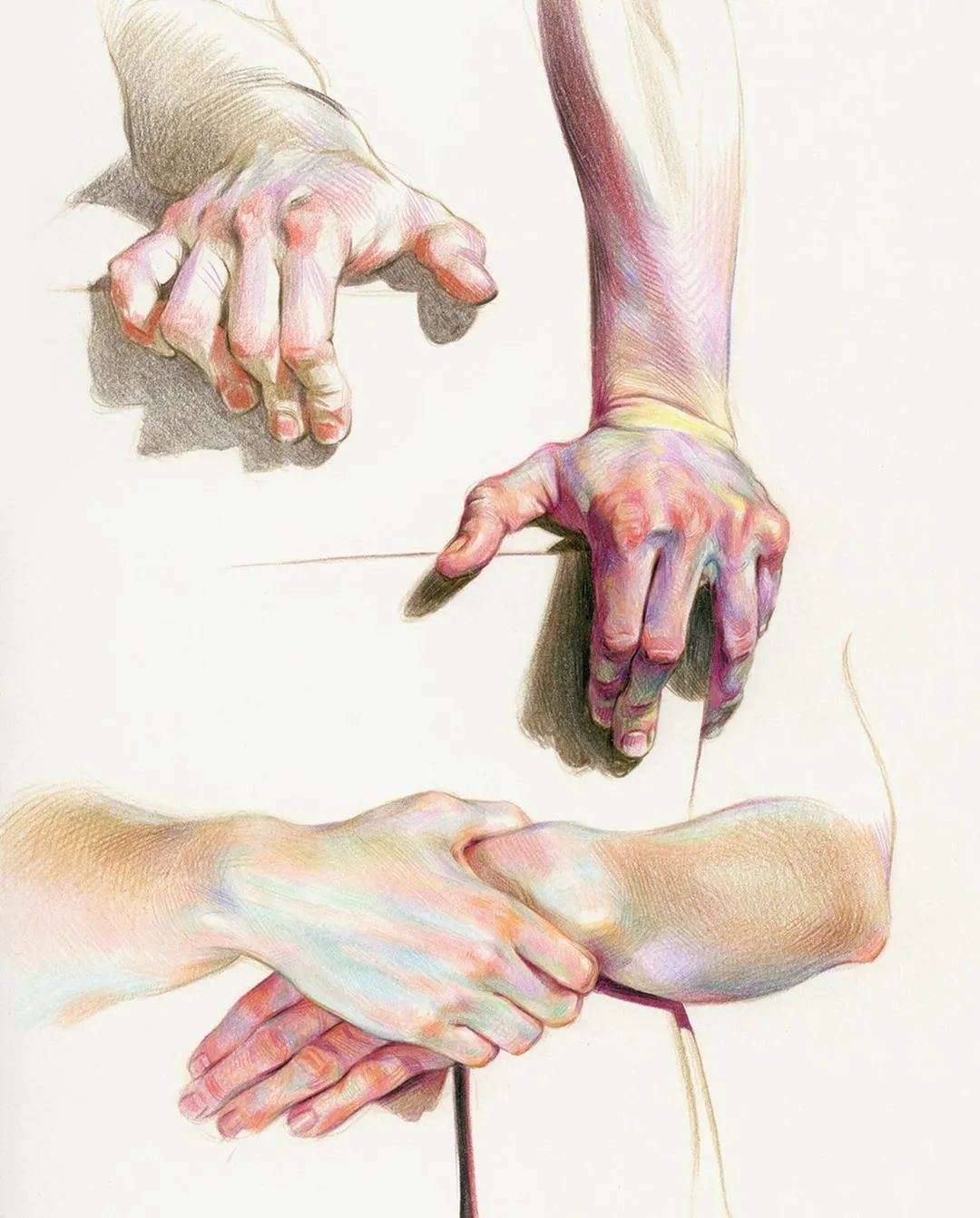 “这张脚底局部,他处理的非常好,依旧是彩铅打底,在处理皮肤上,花了很长时间,由于脚底很多褶皱、细纹,轮廓比较深,所以在处理脚趾部分用了很多偏暖的颜色来叠加阴影,使这一部分的颜色更加丰富一些。但是要注意冷暖的搭配,以防止出现青紫感。