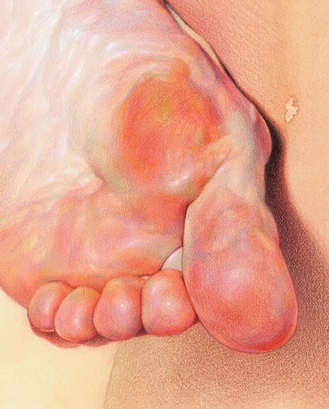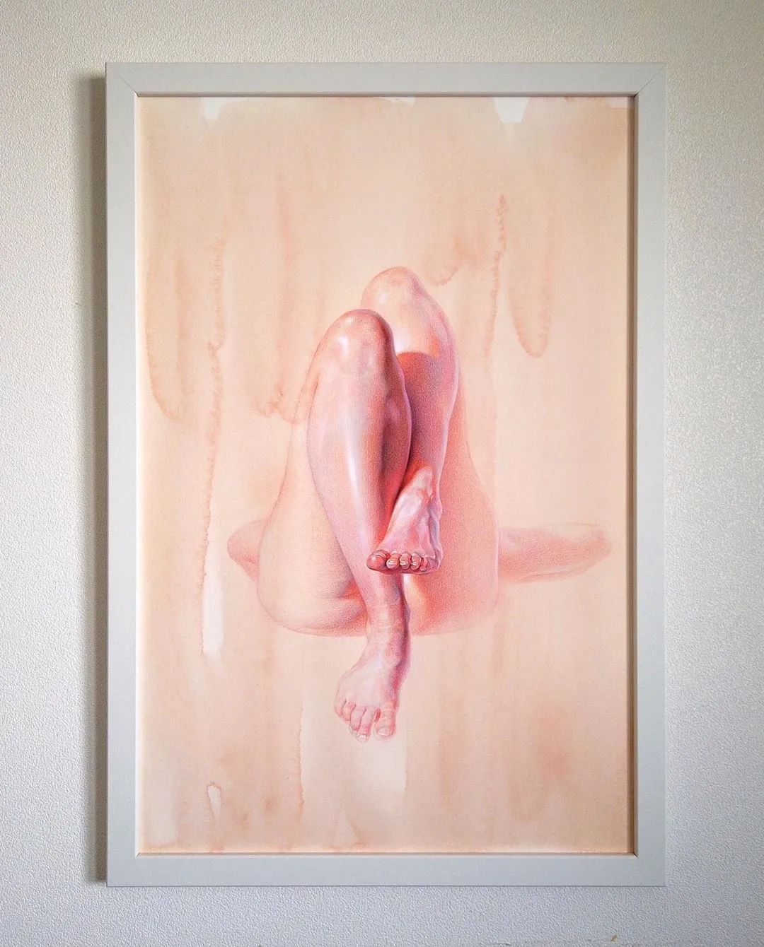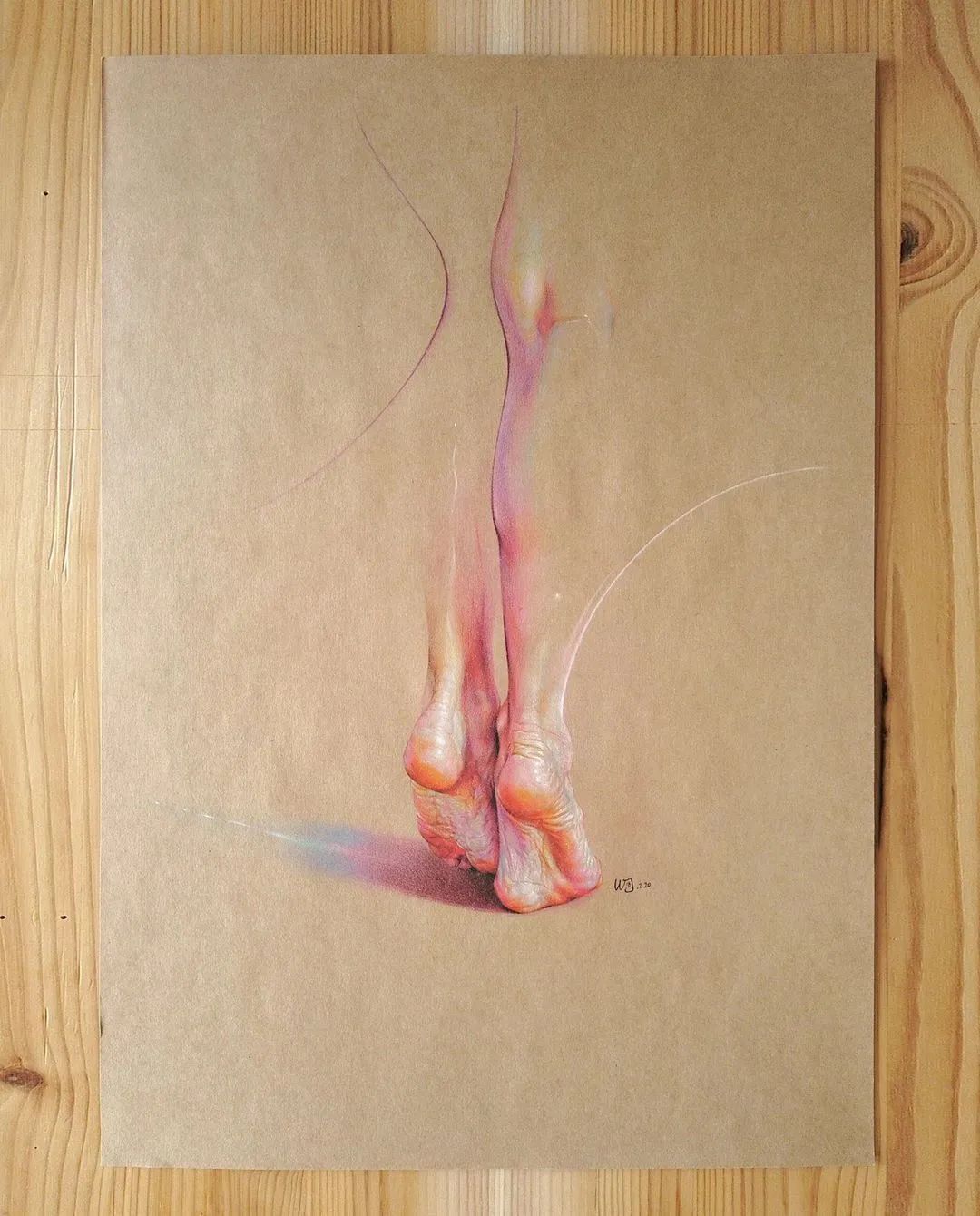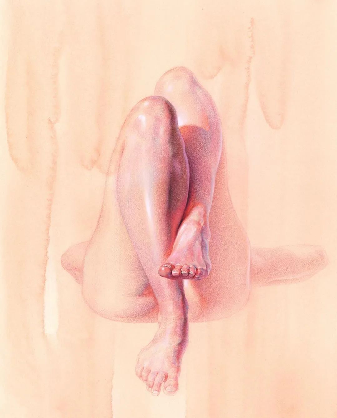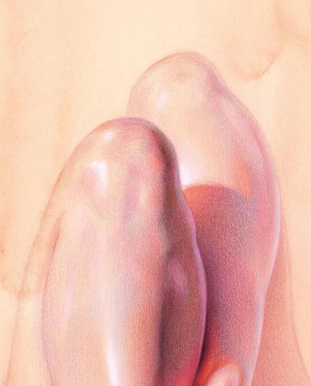 “这张脚底局部,他处理的非常好,依旧是彩铅打底,在处理皮肤上,花了很长时间,由于脚底很多褶皱、细纹,轮廓比较深,所以在处理脚趾部分用了很多偏暖的颜色来叠加阴影,使这一部分的颜色更加丰富一些。但是要注意冷暖的搭配,以防止出现青紫感。