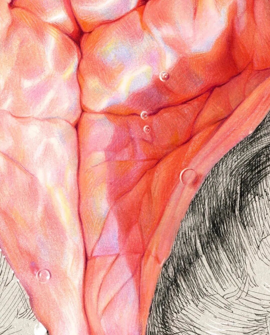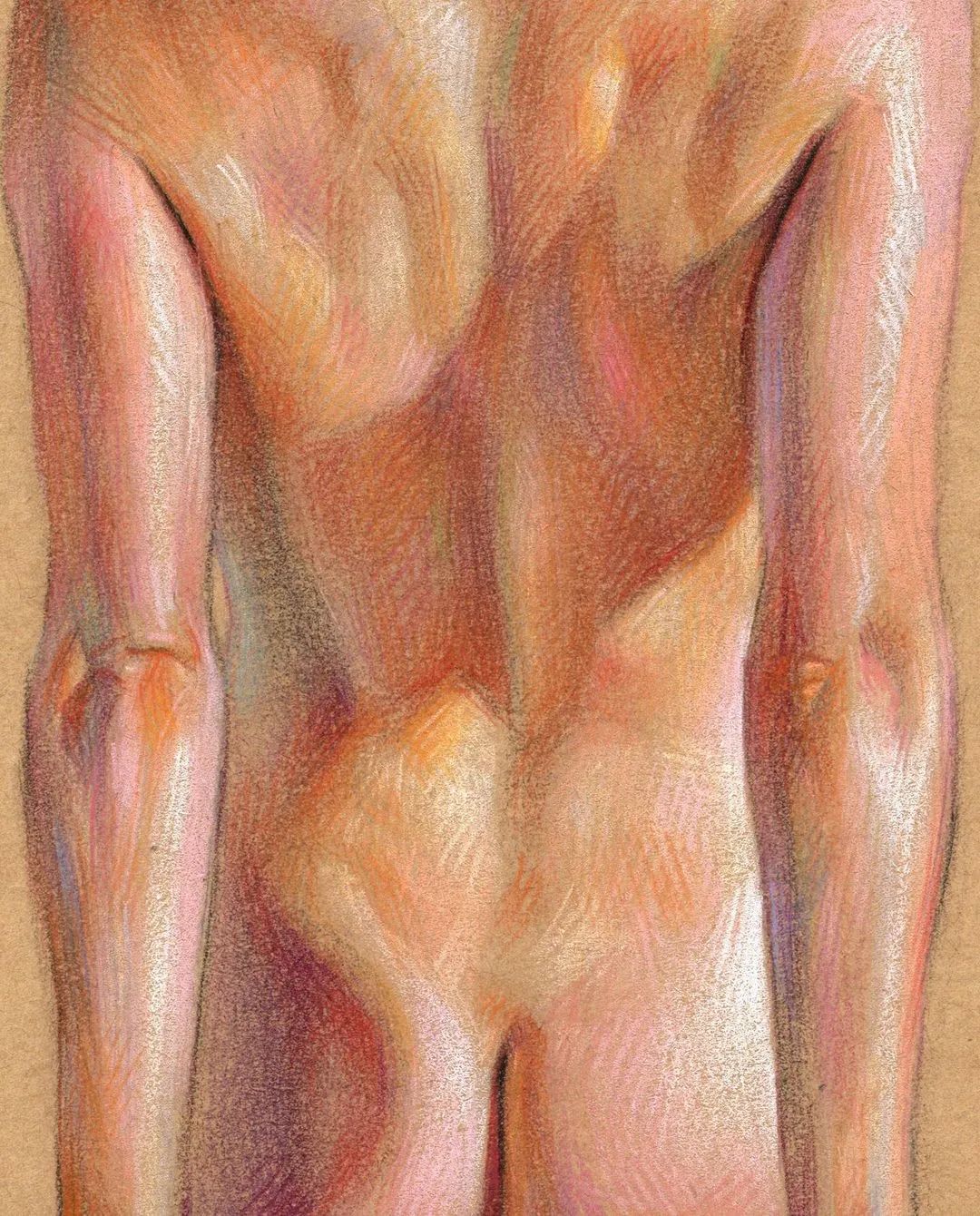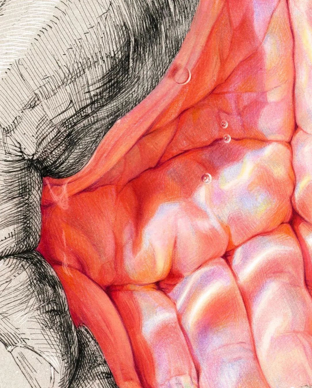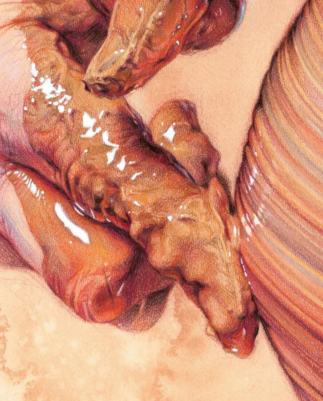 “这张脚底局部,他处理的非常好,依旧是彩铅打底,在处理皮肤上,花了很长时间,由于脚底很多褶皱、细纹,轮廓比较深,所以在处理脚趾部分用了很多偏暖的颜色来叠加阴影,使这一部分的颜色更加丰富一些。但是要注意冷暖的搭配,以防止出现青紫感。