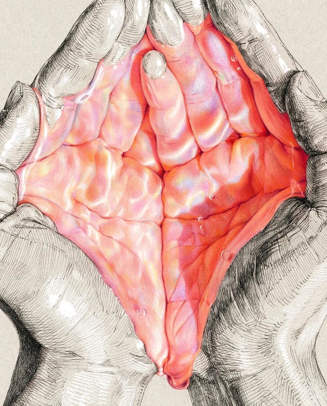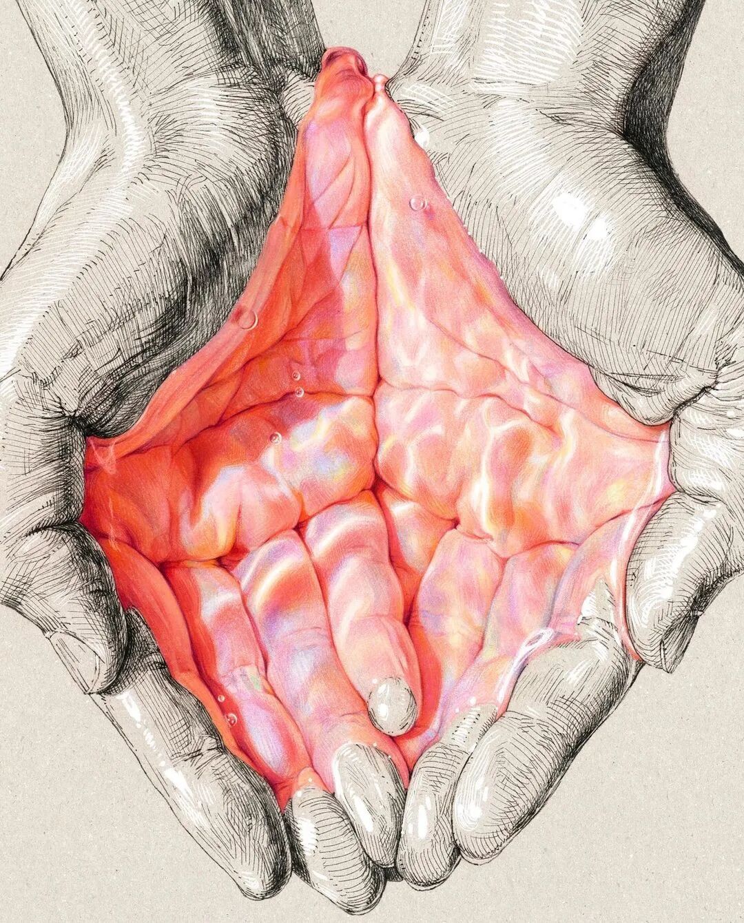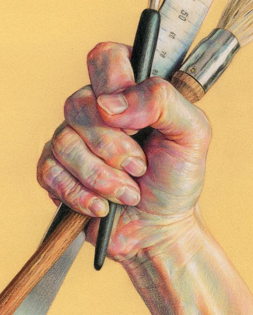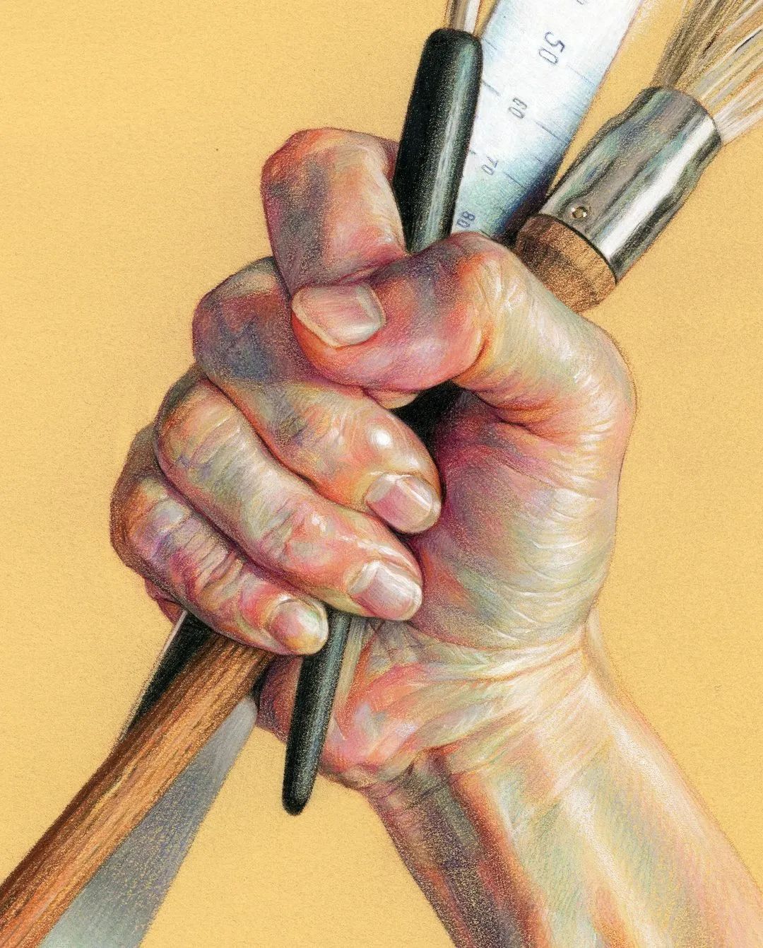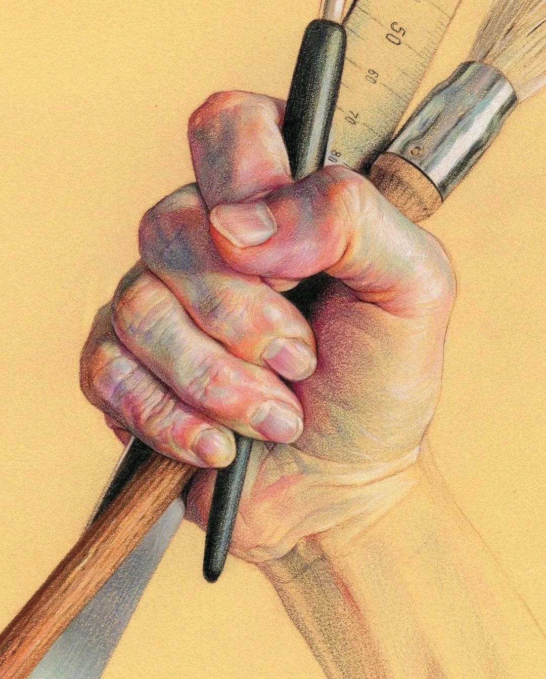 “这张脚底局部,他处理的非常好,依旧是彩铅打底,在处理皮肤上,花了很长时间,由于脚底很多褶皱、细纹,轮廓比较深,所以在处理脚趾部分用了很多偏暖的颜色来叠加阴影,使这一部分的颜色更加丰富一些。但是要注意冷暖的搭配,以防止出现青紫感。