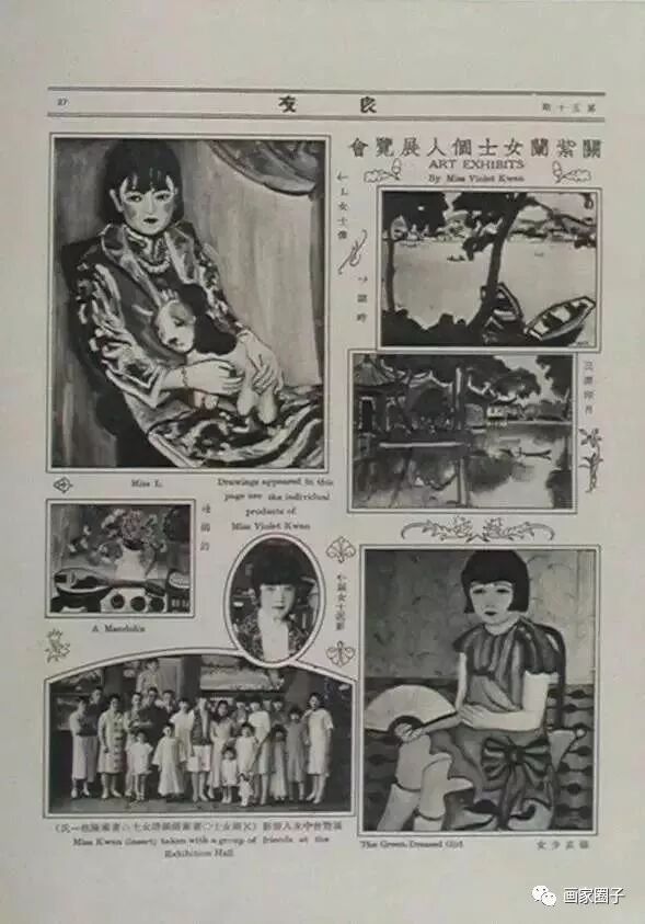 当时一些刊物都争相登载关紫兰的作品和照片,如《万有周刊》《良友》《小世界》等。尤其是《良友》,不仅在封面上登关紫兰的大幅照片,还有整版的作品及相片。在1930年10月出版的《良友》第15期上,有一张集体照,说明写着:“展览会中友人留影”,里面有关紫兰、陈抱一、女画家钟独清等十几个人,还有六七个小孩子。这是张非常珍贵的老照片,如果有人认出上面的人,那可是件美事,能为中国现代美术史增添不少资料。