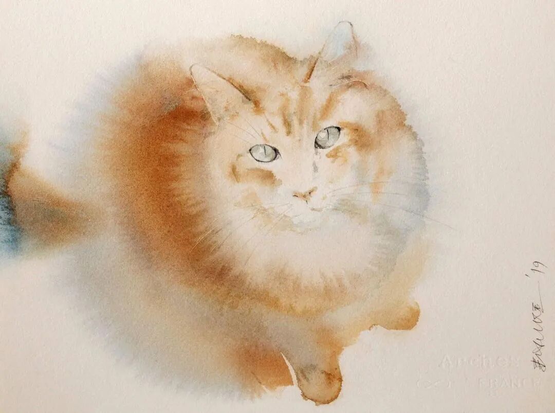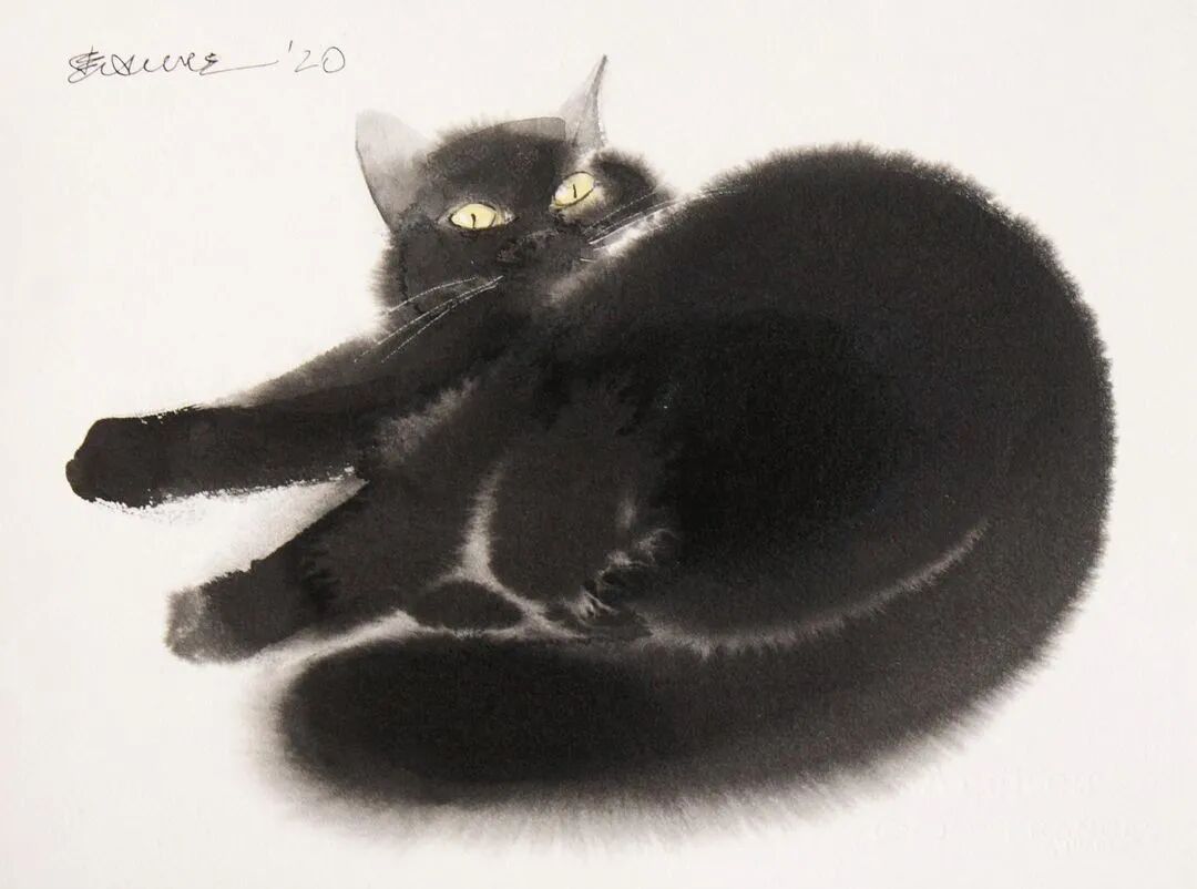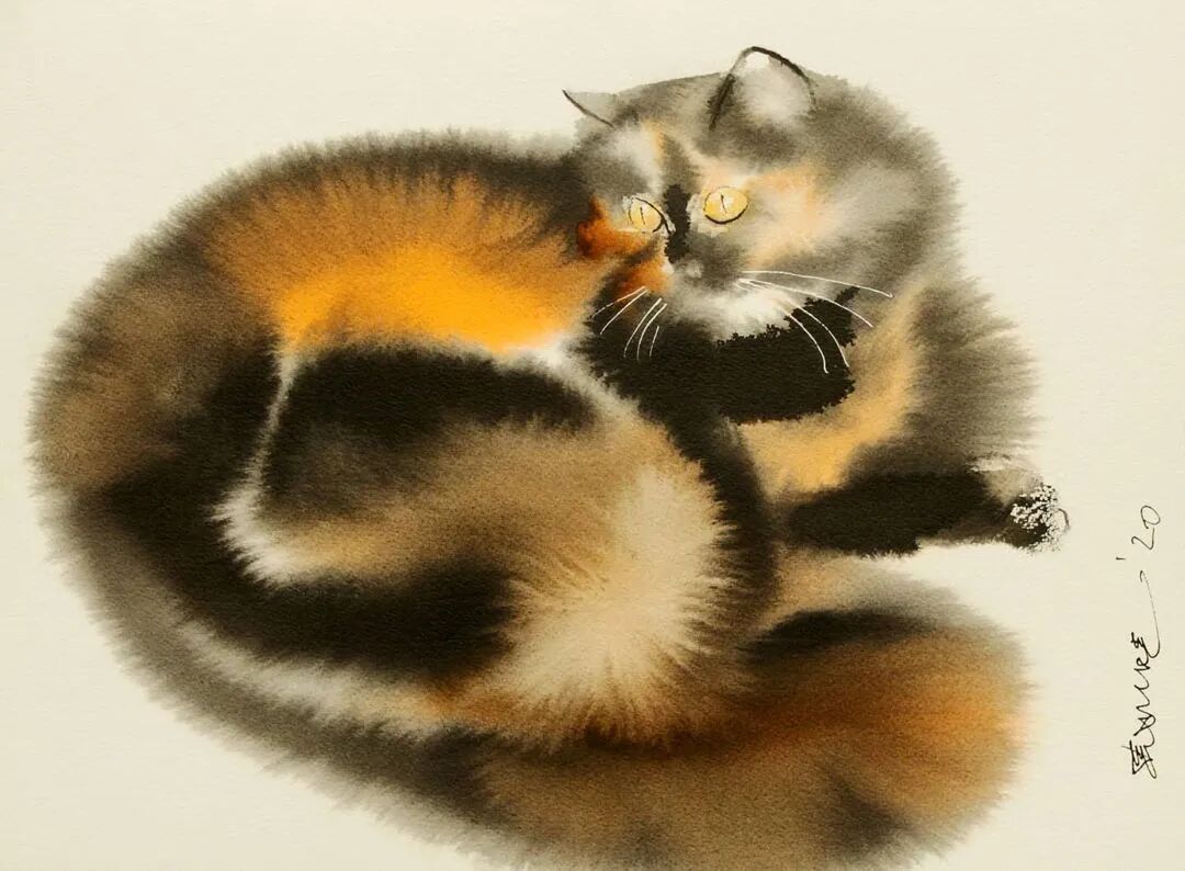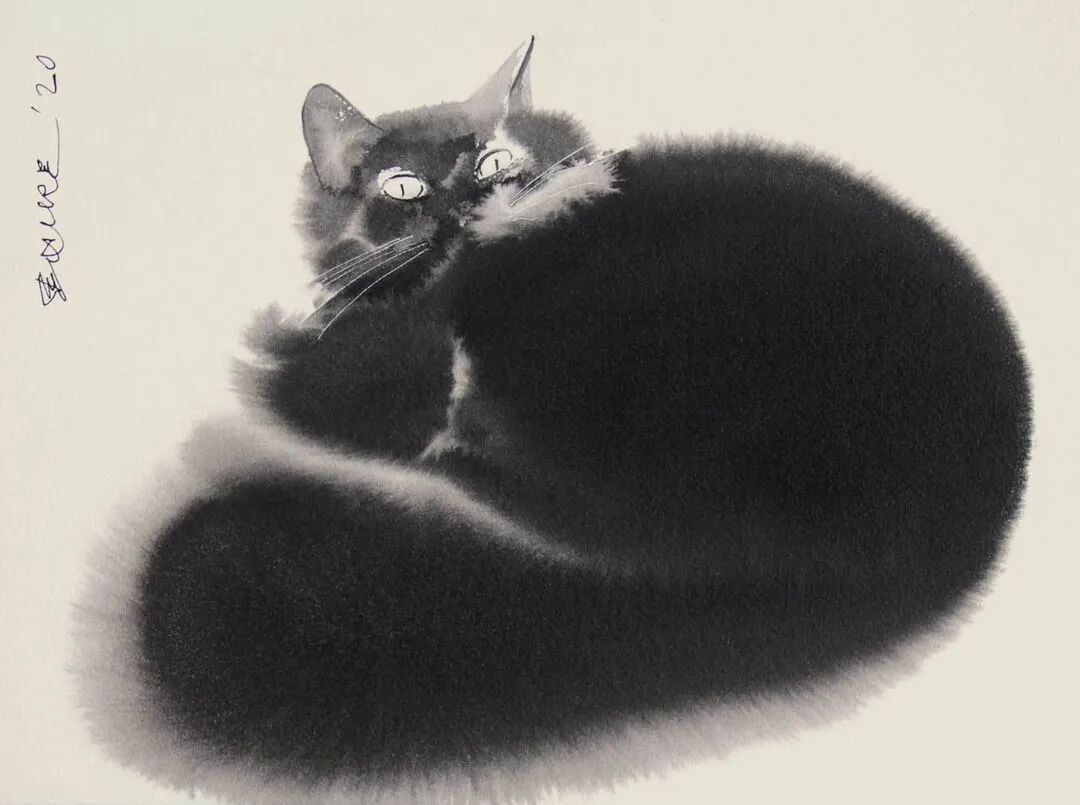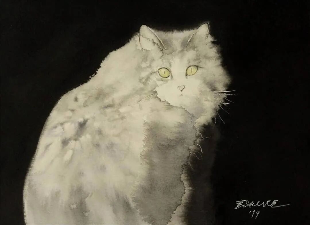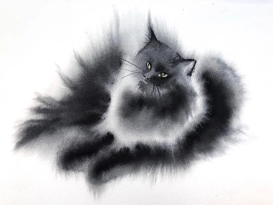 他运用了毛刷晕染出猫蓬松的毛发