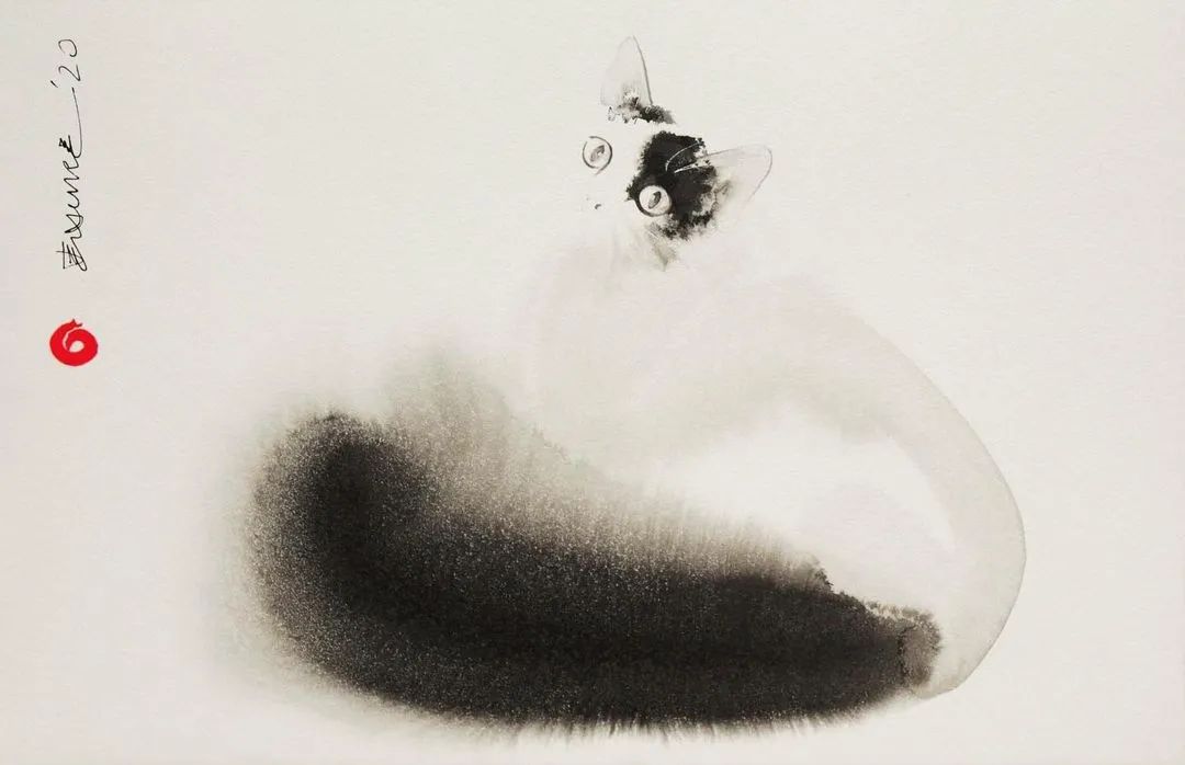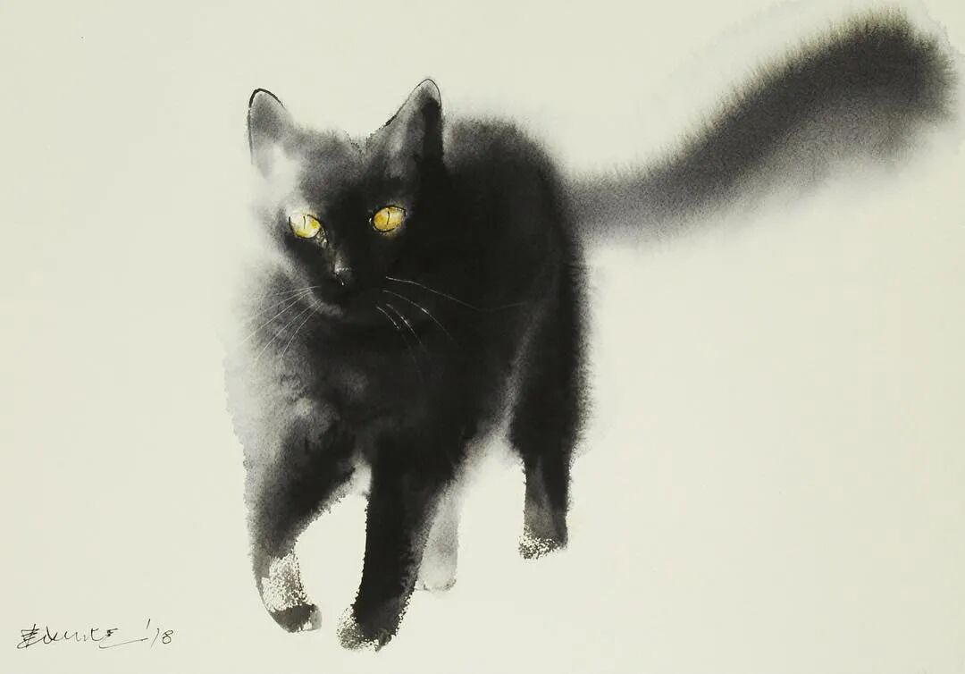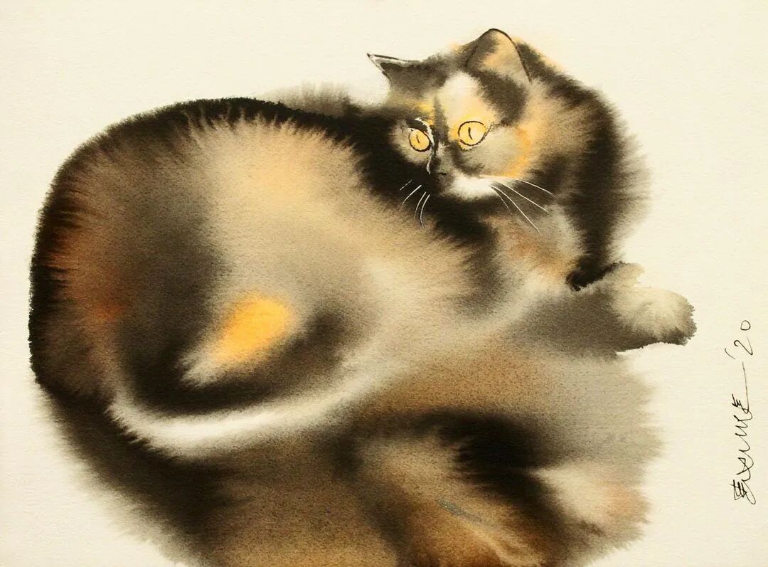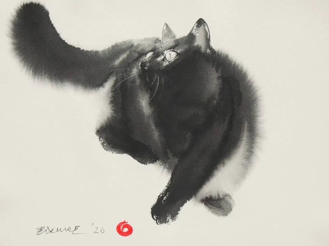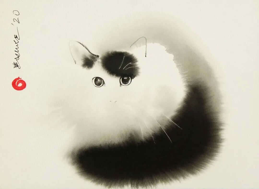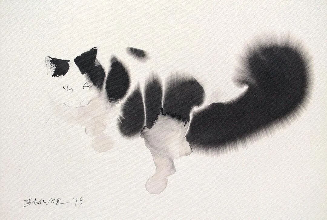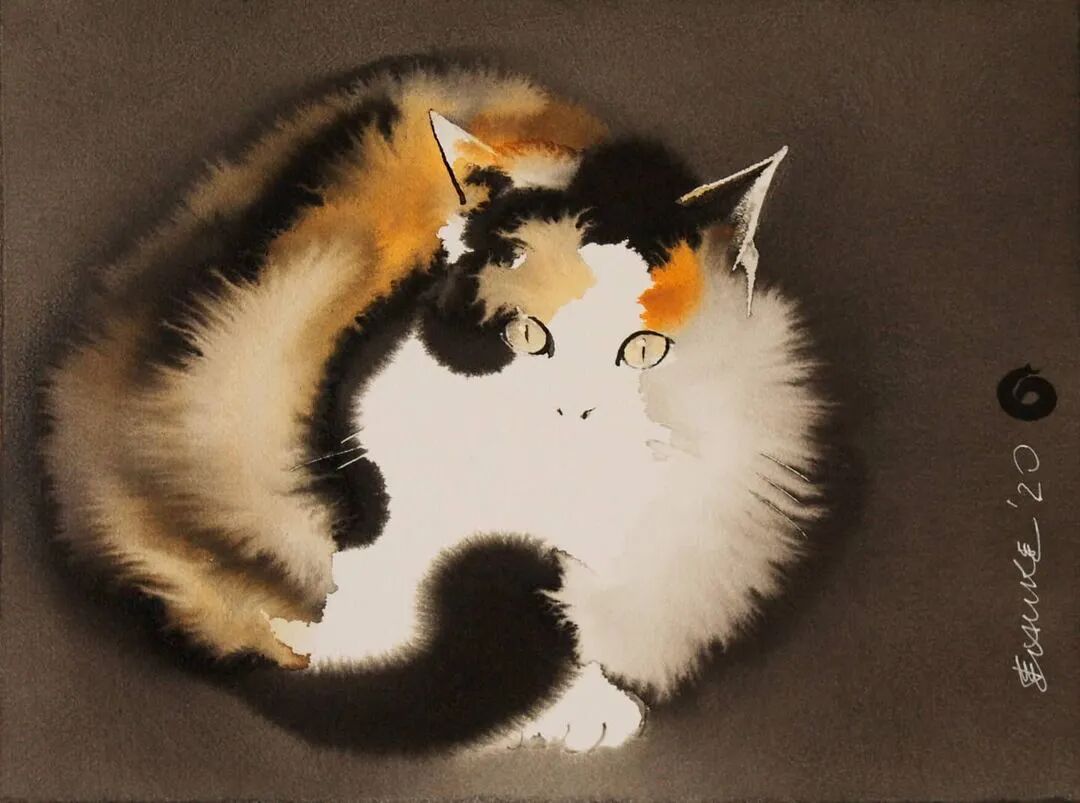 他运用了毛刷晕染出猫蓬松的毛发
