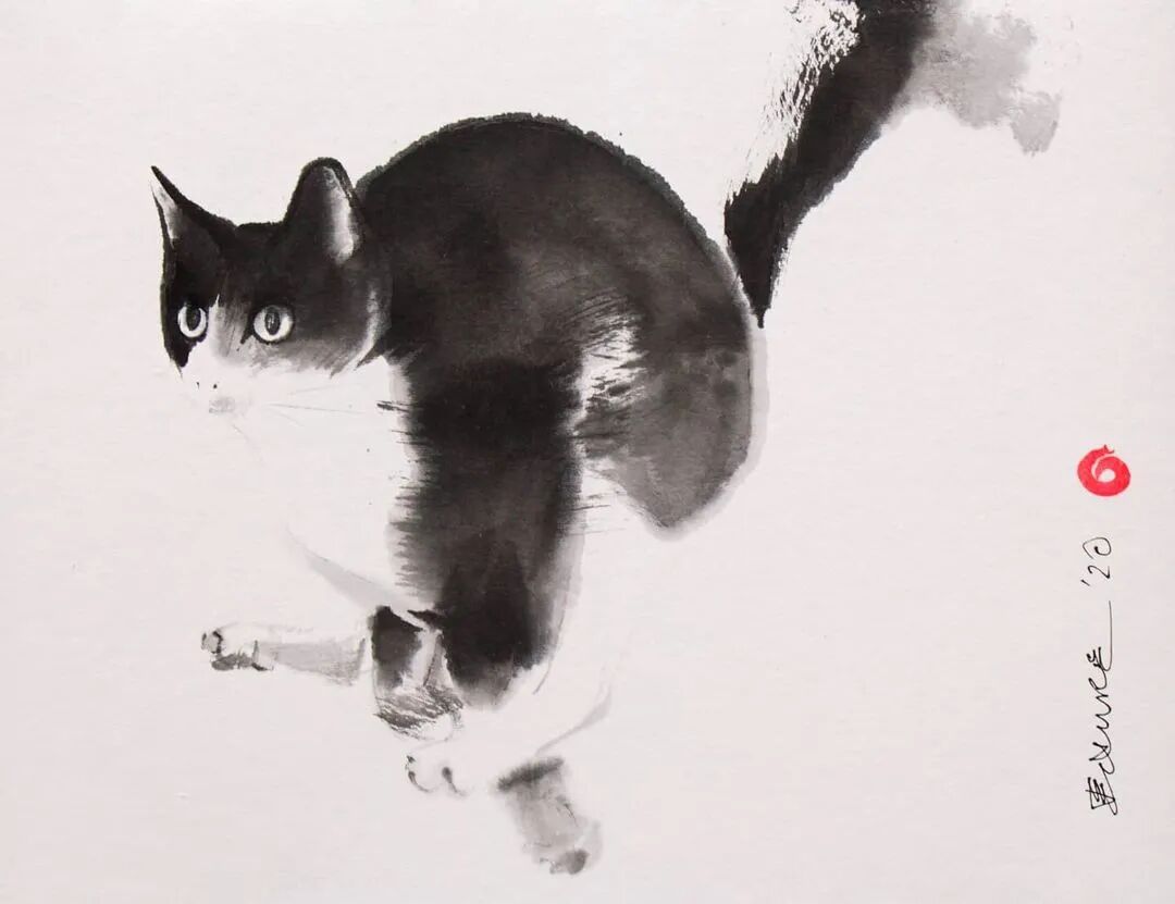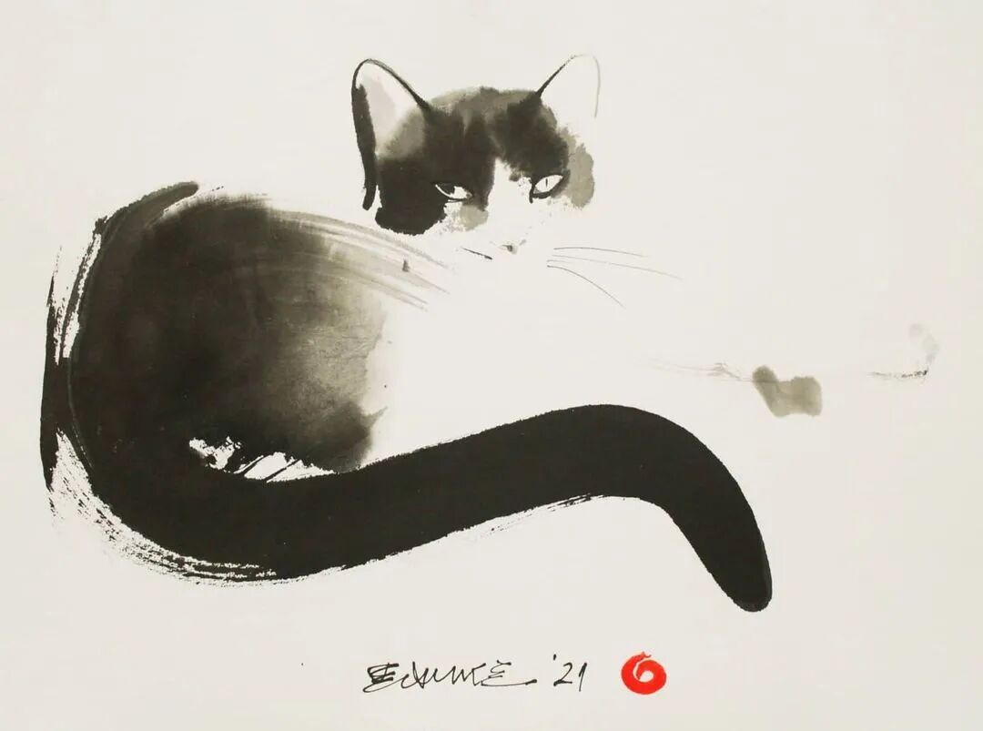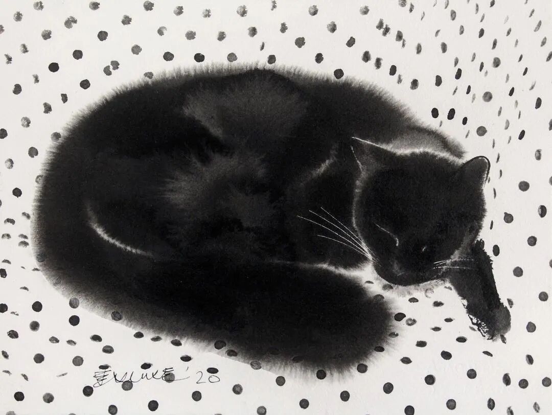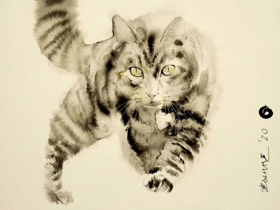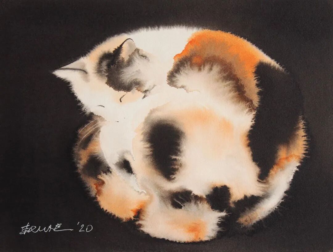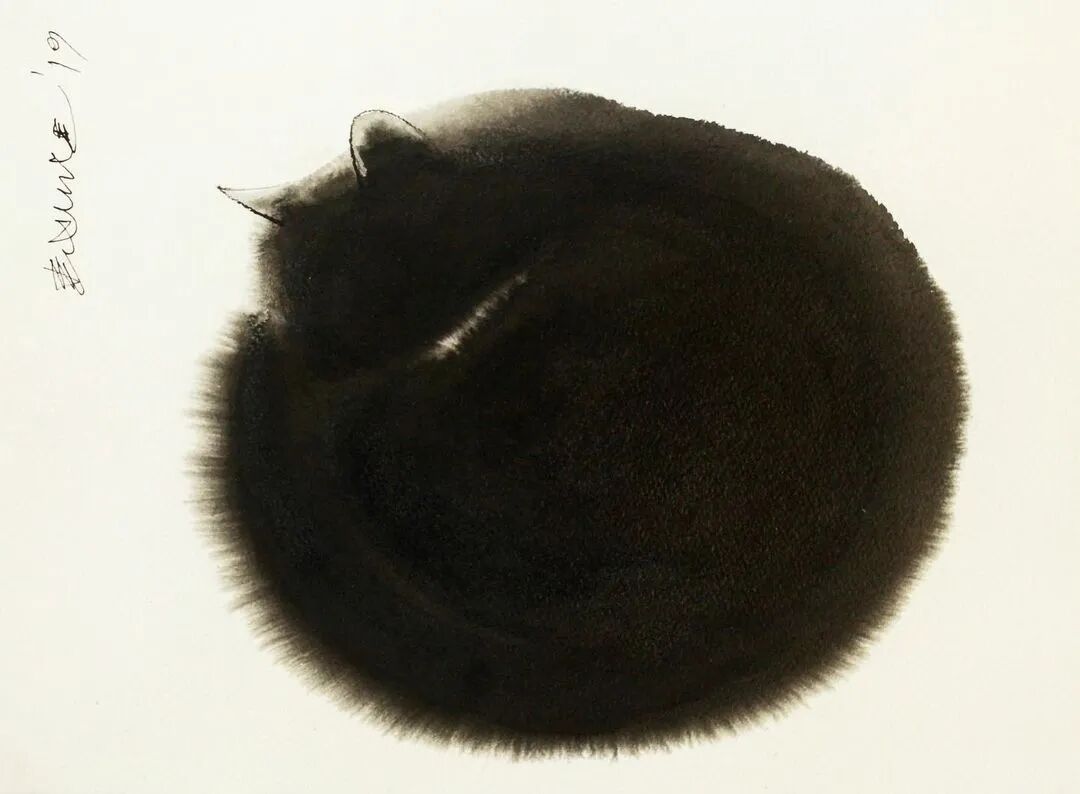 他运用了毛刷晕染出猫蓬松的毛发