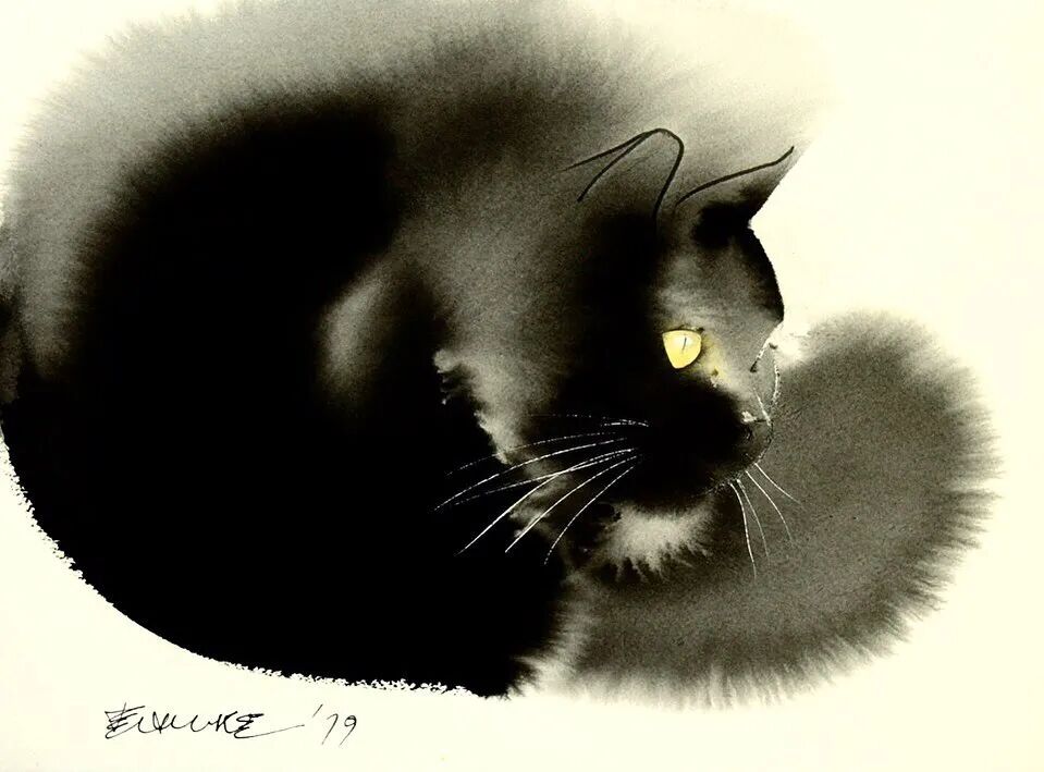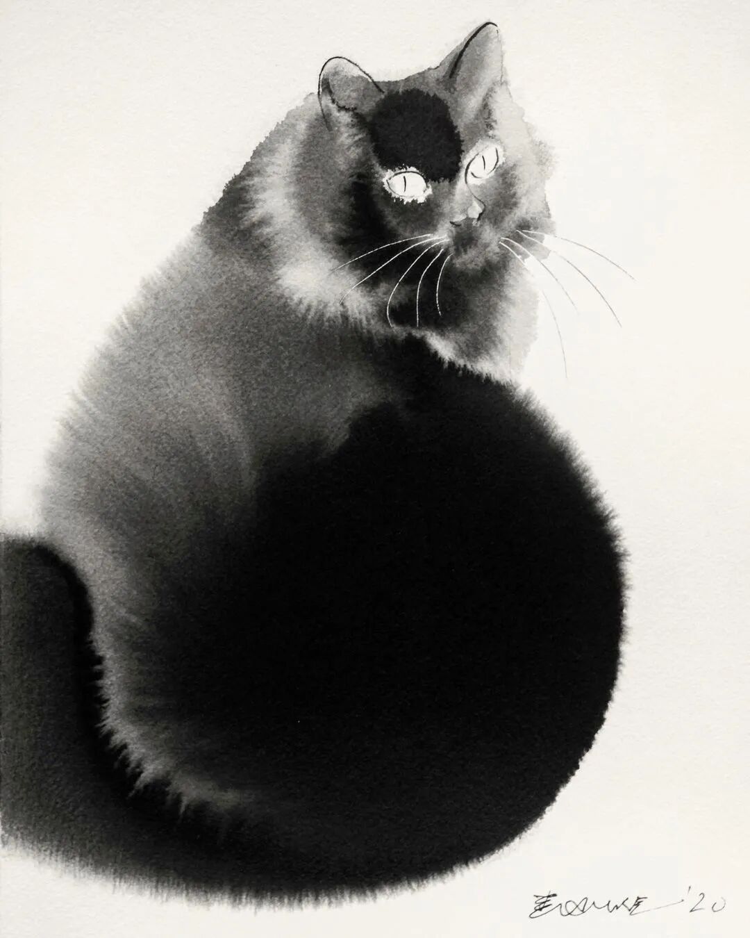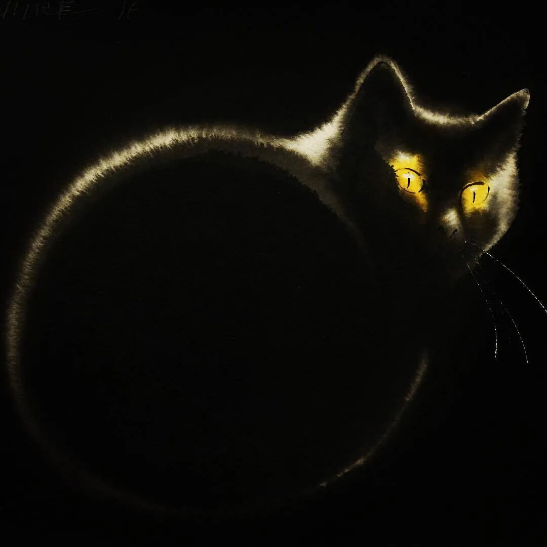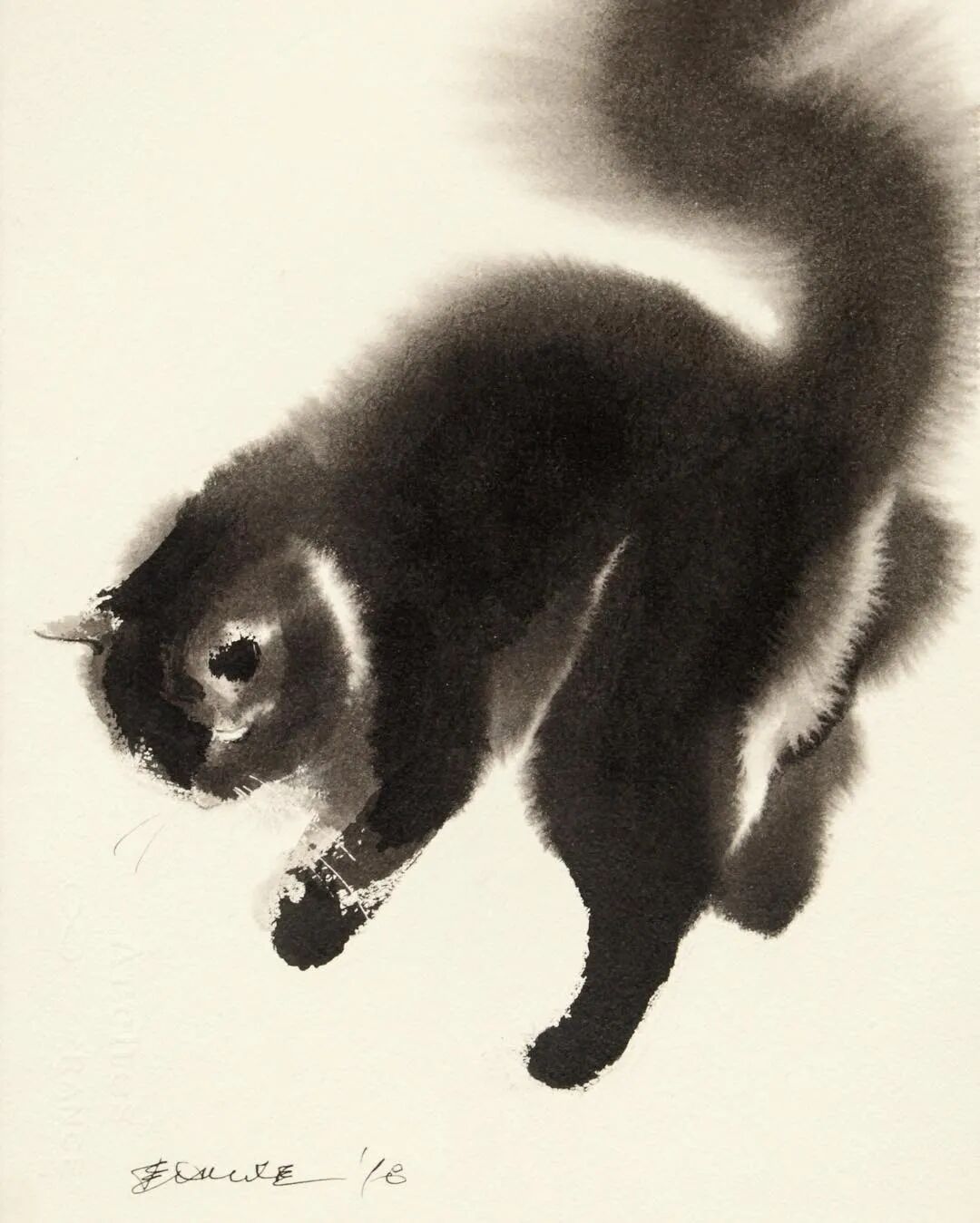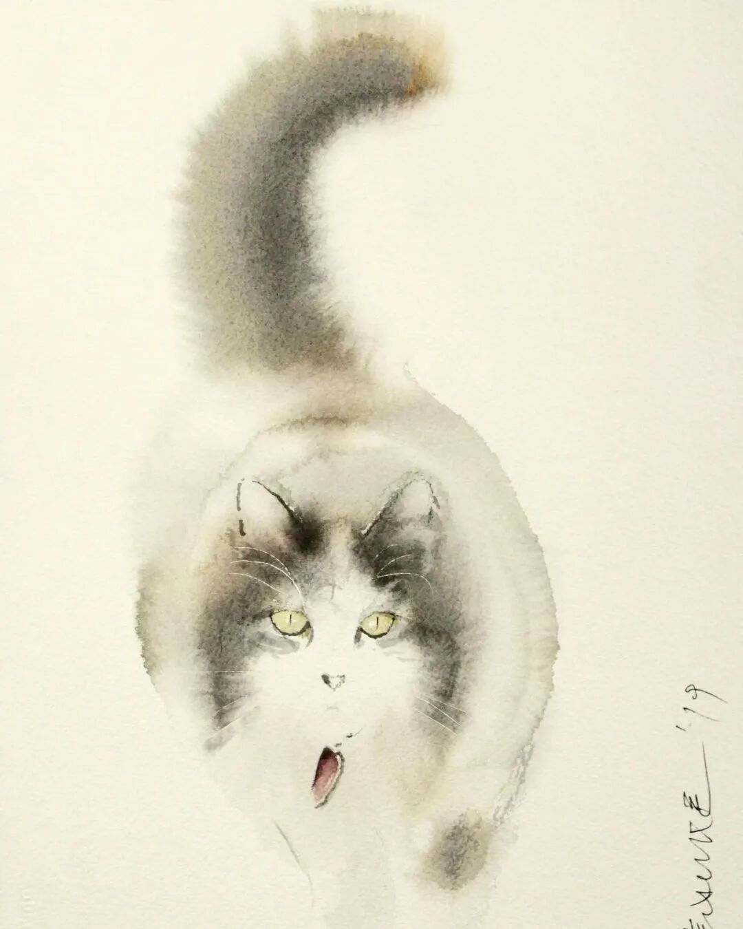 他运用了毛刷晕染出猫蓬松的毛发