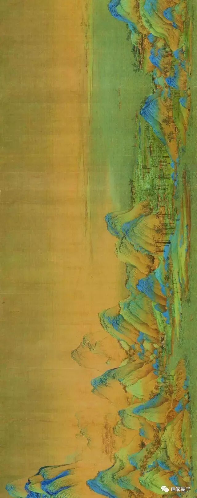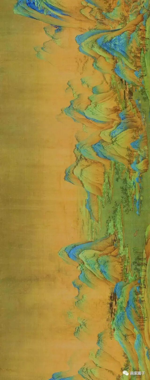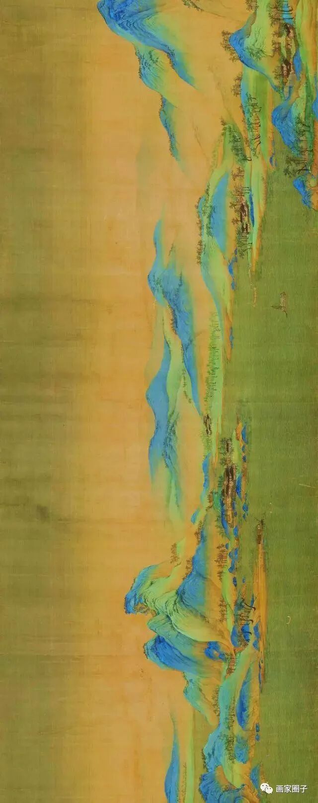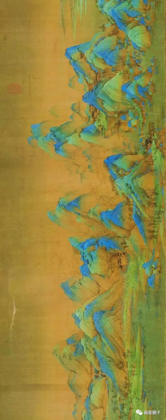 《千里江山图》一直被称为古代青绿山水画的巅峰之作,长卷纵51.5厘米,横1191.5厘米,绢本,青绿设色,无款,现藏故宫博物院。它被称为“中国十大传世名画”之一。