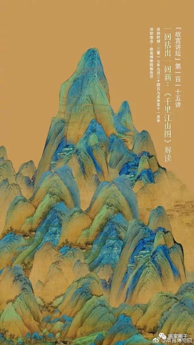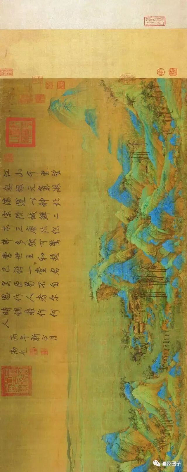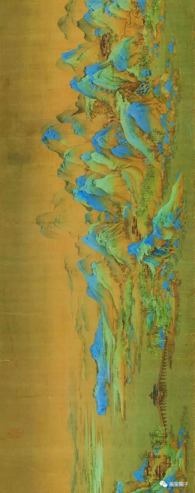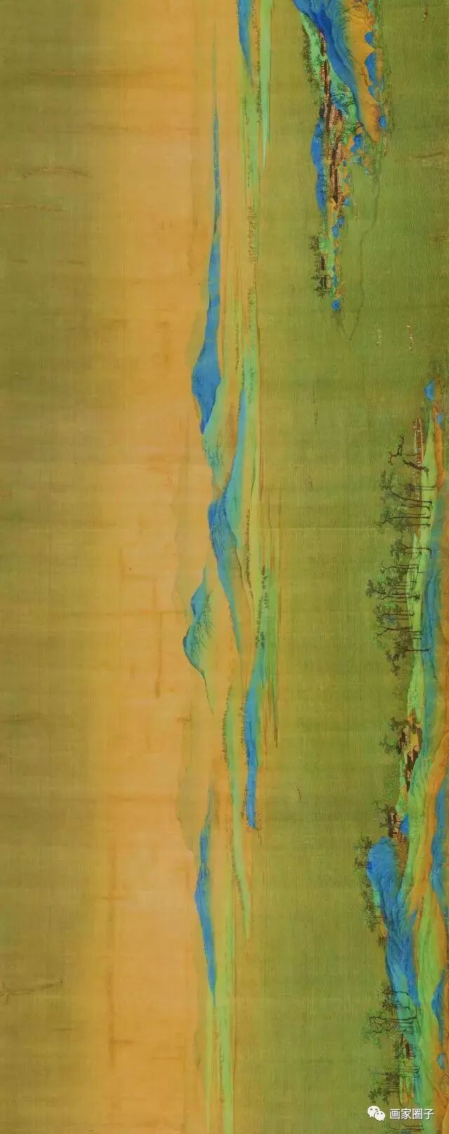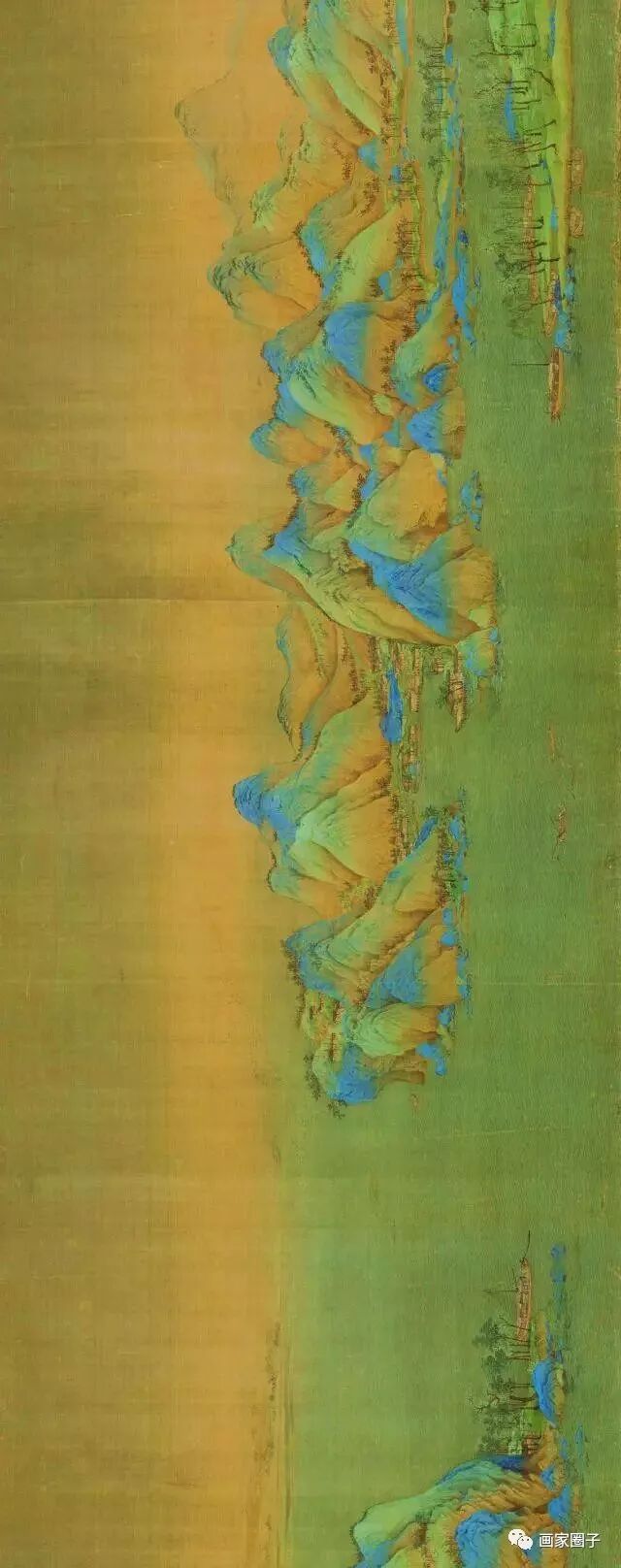 《千里江山图》一直被称为古代青绿山水画的巅峰之作,长卷纵51.5厘米,横1191.5厘米,绢本,青绿设色,无款,现藏故宫博物院。它被称为“中国十大传世名画”之一。