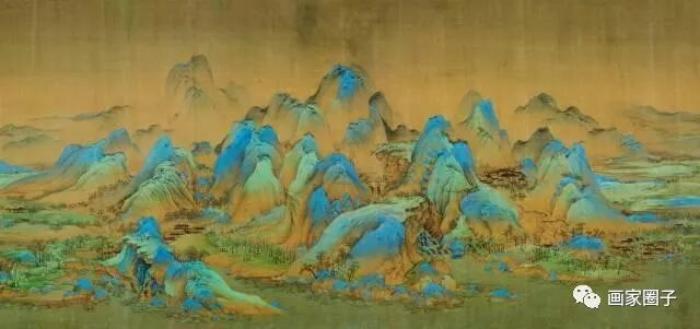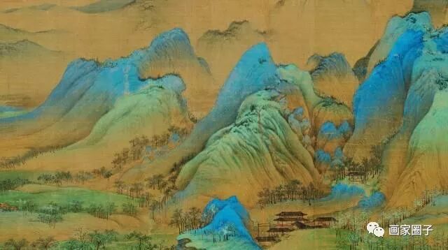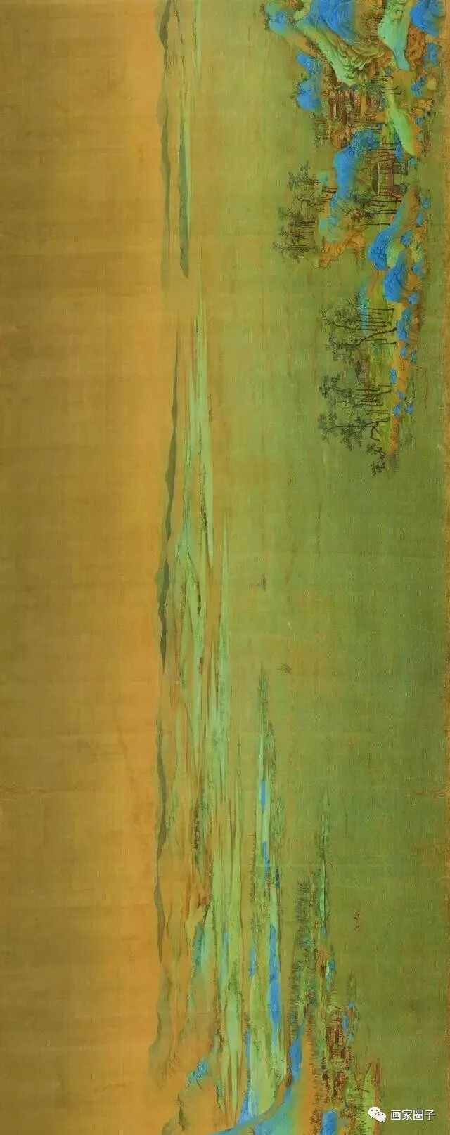 “东晋顾恺之和隋唐的山水画,是中国山水画的胚胎和萌芽,是童年期,一股子少年人的稚气、秀气、灵气和英气。五代北宋的山水画,格局扩大,气势磅礴,雄浑,用墨慢慢老熟,但是宫廷仍然热衷青绿山水画,因为当时的青绿山水,也是一种歌功颂德,好比主旋律题材。到了北宋,遇到像王希孟这样的天才,又少年了一下子,出人意表,光华灿烂。