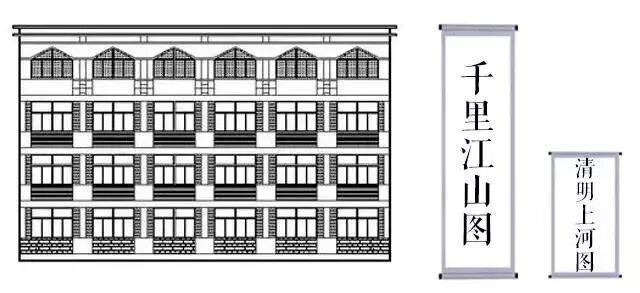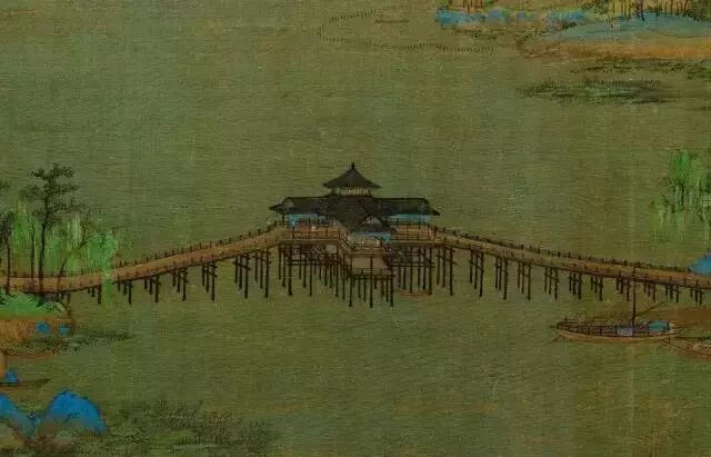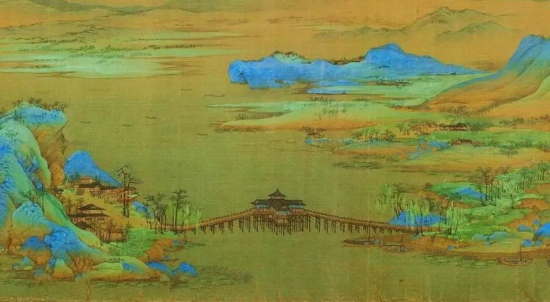 过了宽阔的江面,进入以山景为主的景色;一条曲折山路从山下通向群山环抱着的一处建筑群;逐渐山势峥嵘,山间瀑布,挂挂溅泻,回归大江,从高远直到深远之景,引人人胜,临江山水,远如松柏常青,屋宇桥亭,画面之上,水面渔舟,一座大桥横跨江面,桥头绿柳依依,这是一座木制结构梁柱式廊桥,中间建有宫殿式的两层楼阁,宛如一道彩虹,十分壮观,游人三三两两地在上面游览着江景;