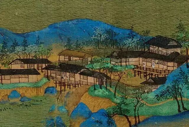 桥头有几座酒楼店铺,往前群峰渐渐高耸,临江峰崖,半山腰有一处山村,村前数级瀑布直泻而下;悬崖下有一个带院子的草堂;过来是一片内湖,人物、渔舟、货船行驶水面,沿岸青绿田野,显现出热闹的生活景象;
