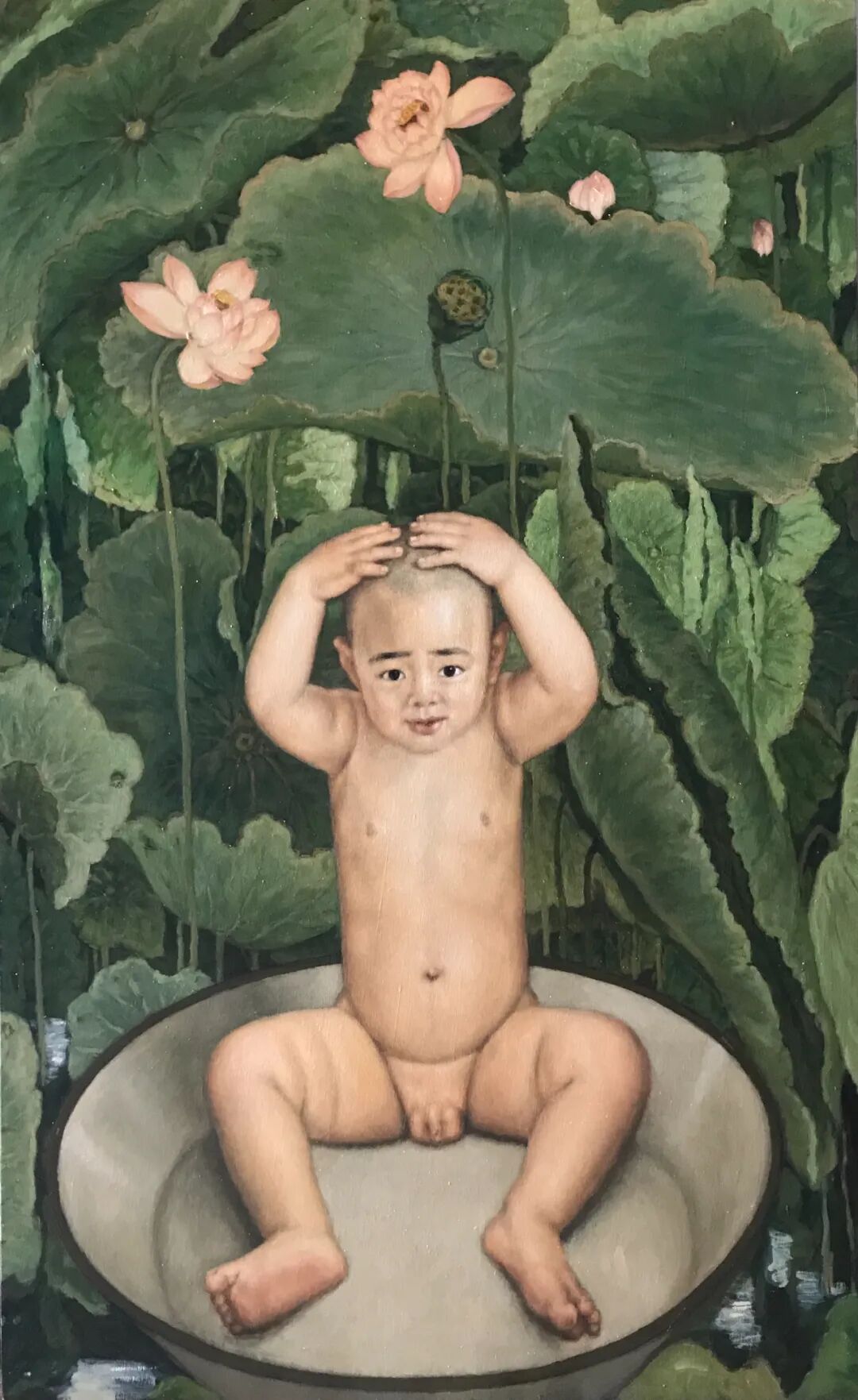 这幅四位数后边还带“千万元”的人体油画,是杨教授在三十一年前新婚时特地为妻子创作的:新娘除却婚纱站立在一株绿意盎然的盆植前,身后还有数颗如她般一样青涩而新鲜的桃子,她就这样微笑着坦然望向认真绘画的夫君……
