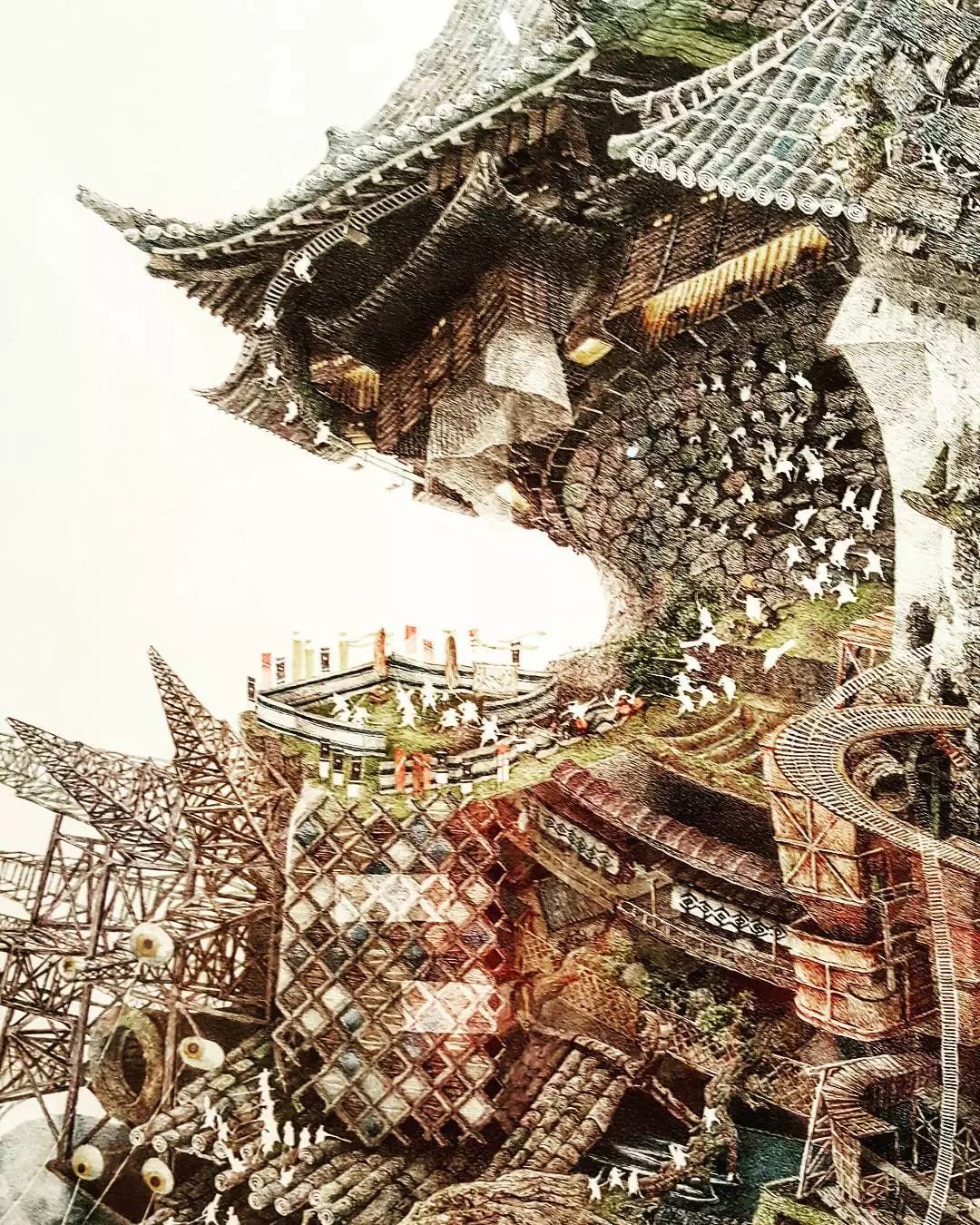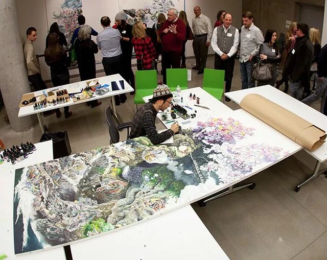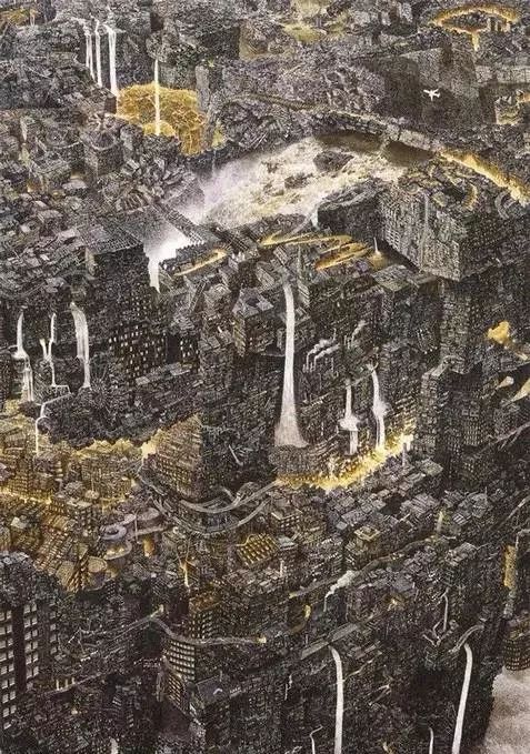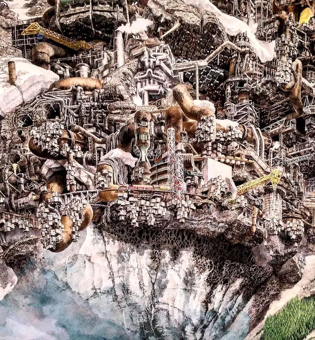一幅作品有两米多高,只用一支小钢笔,从一个细节开始让画面一寸寸地慢慢增长,一张画在几年后生长成了让人叹为观止的繁复的建筑和风景奇异世界,观者可以花一整天去看里面发生故事。