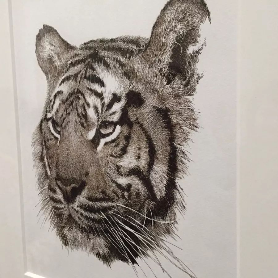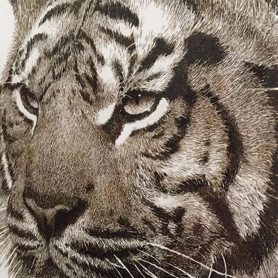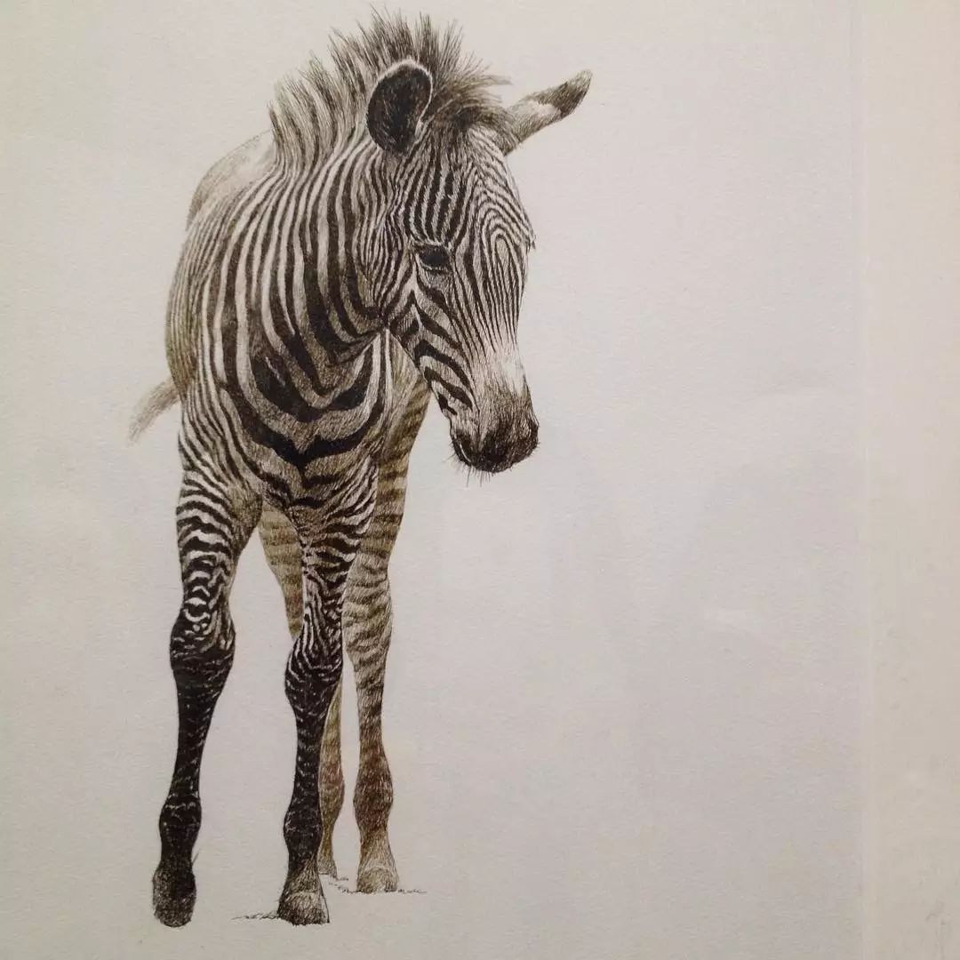 他刻画动物毛发大多使用针管笔,针管笔比较柔和,韧性好,可以画出很细腻的笔触。毛发颜色由浅入深,层层叠加,这样,毛发看起来会比较柔软,有蓬松感。
