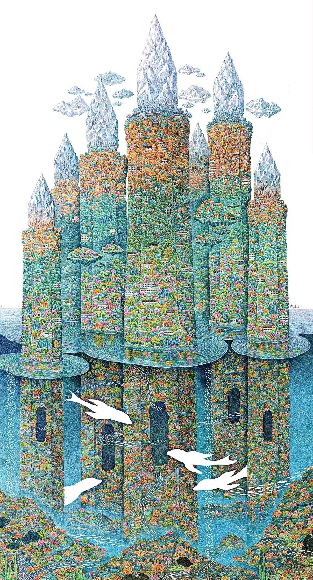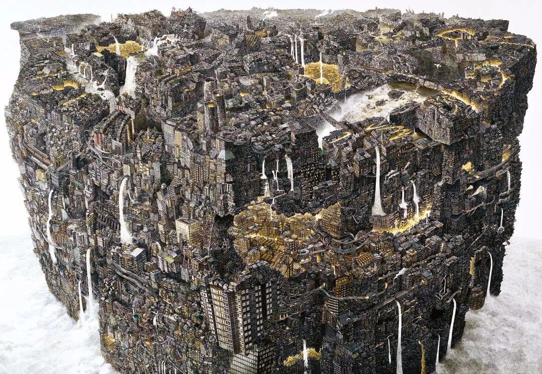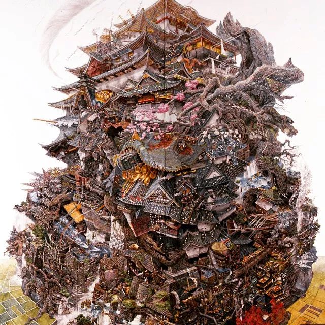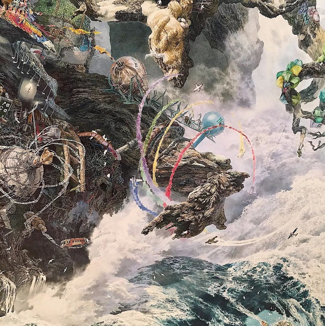 “ 新生 ” 描绘了一棵树与海啸的拼搏,仔细观察画面,上面饱含了无数小细节,成千上万个故事,池田学的画,试图复制一个美丽的揭示人性的超现实世界。