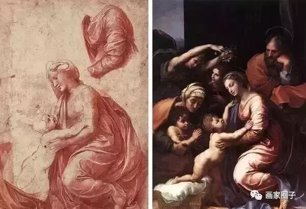 左图是素描习作,右图是完成的油画作品。作者是拉斐尔。素描侧重线条,油画调整明暗,可看得很清楚。