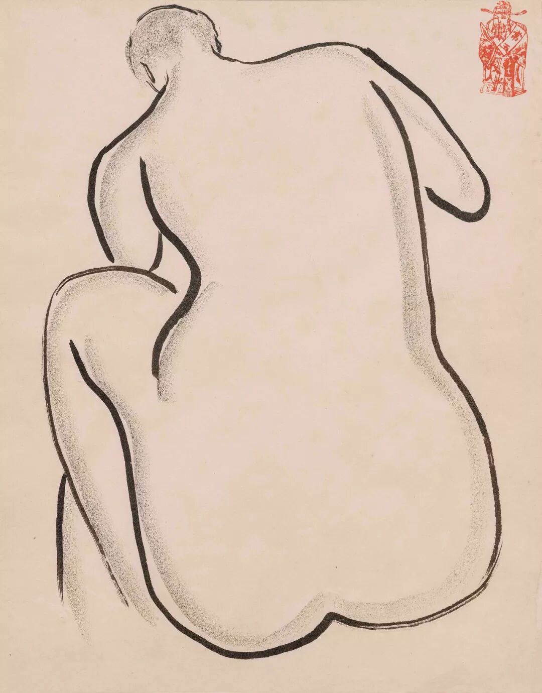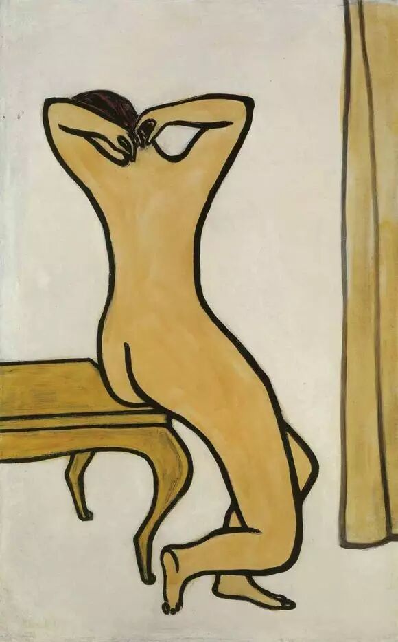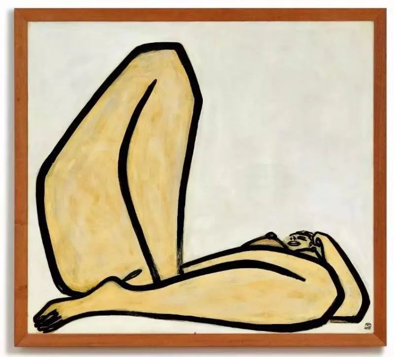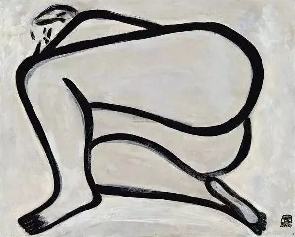 画作解读:《曲腿裸女》中,人物的姿态结构精妙,其抬起的右膝为此仰卧的正向身体平面自水平横放的左腿、如丘耸起的胸壑至被左手臂支撑的头部,创造了一个垂直的对位空间。而此向上的左手也与人物抬起的右脚相互平衡呼应,可说艺术家借助了夸张变形的裸女身姿,联系到东方山水奇石的造型。