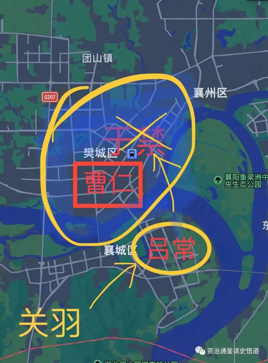 当时关羽在南郡,趁着雨季就水陆并进,把守襄阳的吕常堵在襄阳不敢出来,准备用水军登陆汉江北岸弄掉曹仁。