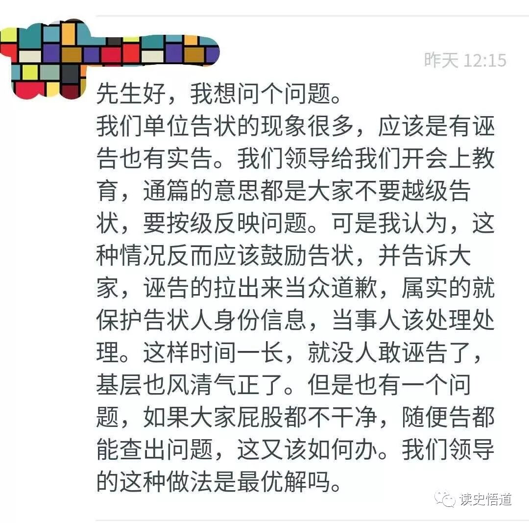 风闻言事大致讲清楚了,我们再回头看看读者的问题。单位风闻言事的现象很严重,领导开会公开反对大家越级报告,提倡大家逐级反应情况。领导真的是在反对风闻言事吗?很难讲。