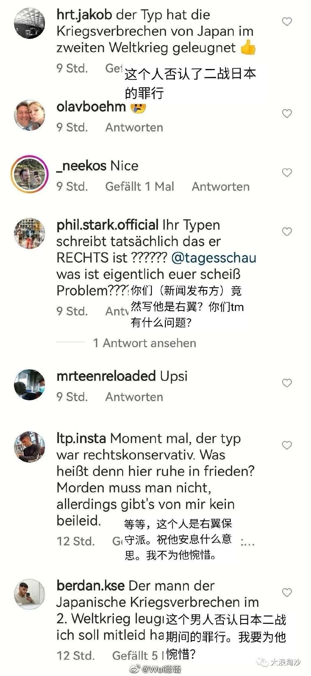 再看看德国网友对于安倍遇刺的评价,德国人肯定更能感同身受。假如有一个德国人天天给希特勒上坟,身上穿着“奥斯维辛”首字母缩写的T恤出席公共活动,别说选他做领导人了,怕不是要受到反纳粹法律的制裁。