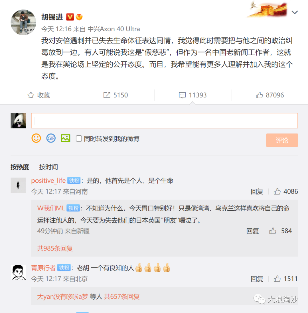 老胡这条的热评是“他是个人、是个生命”,那千千万万牺牲在抗日战争的人算不算生命了,安倍数次前往靖国神社拜鬼,可曾有过半分尊重生命的意思?