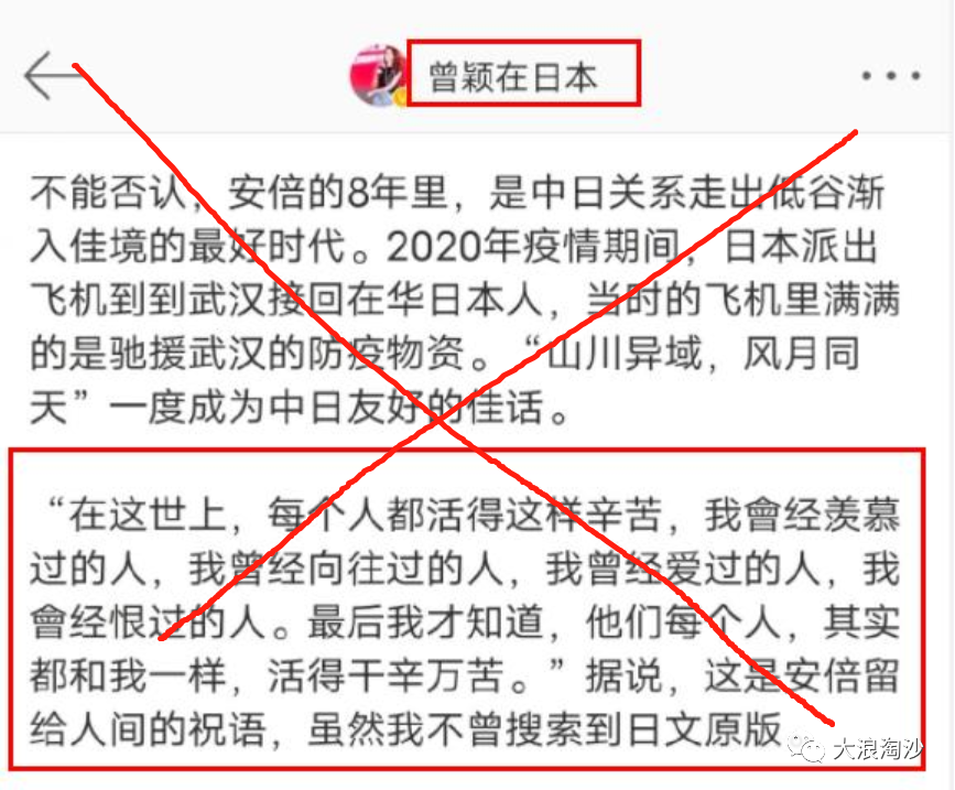 这几日二鬼子们给安倍哭丧的姿势频繁出新,比如安倍知名的孝子贤孙记者曾颖,给安倍张冠李戴了一段鸡汤:“在这世上,每个人都活得这样辛苦……”