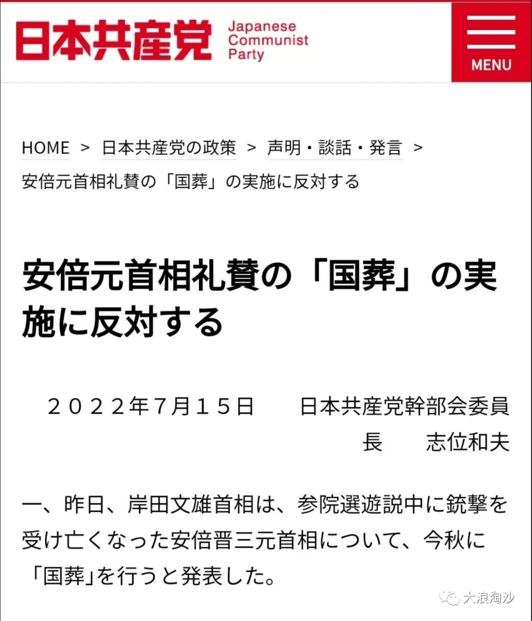 日共虽然很费拉,但也发表了一个反对安倍国葬的声明: