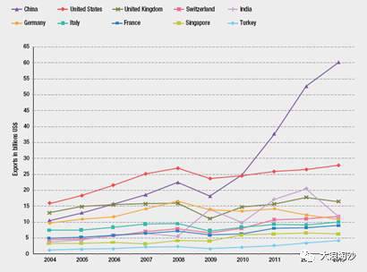 数据来源:THE GLOBALISATION OF CULTURAL TRADE:A SHIFT IN CONSUMPTION—International flows of cultural goods and services 2004-2013