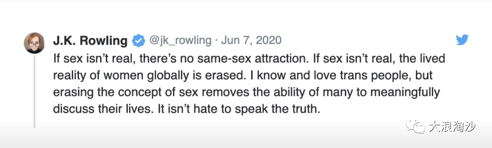 但是西方舆论一篇骂声,完全脱离了女性权益、女性歧视的议题,我还以为他们在骂罗琳上纲上线,结果他们比罗琳更加上纲上线,认为罗琳歧视“跨性别群体”,这实在让我大开眼界。然后罗琳女士就跟他们杠上了,发推表示,性别不应该“去性别化体验”(这是我从英文翻译过来的,不准确)——意思是男女不能你说啥就是啥。