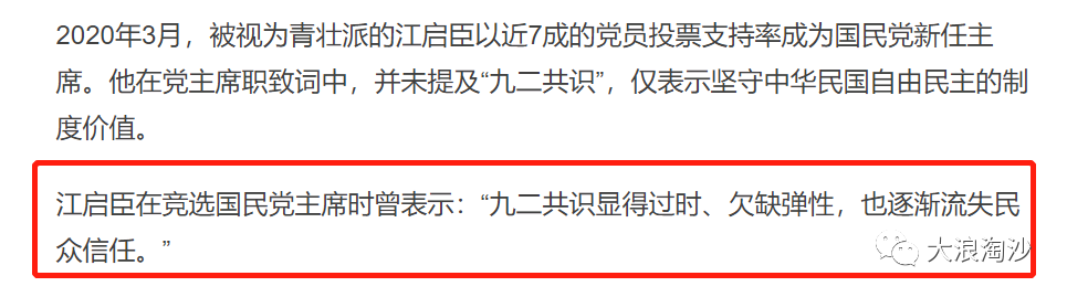 所以大家看出来国民党(伪)有多“搞”了吧,你要一直这样硬气下去也可以吧,为啥短短一年间,又要从新把“九二共识”当宝贝一样祭出来了呢?原因不言自明:祖国统一的大潮流不可阻挡,你要不体面,大陆就帮你体面。
