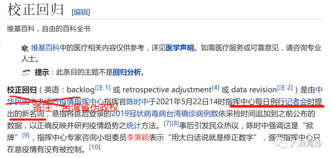 但是,整个台湾省乱成一锅粥了,就算是绿色恐怖也不能阻碍岛内民众越来越多的不满。首先是疫情问题,台湾当局处理疫情也是充满着各种娱乐气息,比如经典名词“校正回归”——不知道的朋友乍一看,可能以为这是一个数学名词,但其实这是台湾省防疫部门享有独创发明权的专有名词,甚至在wiki百科上有了专门词条: