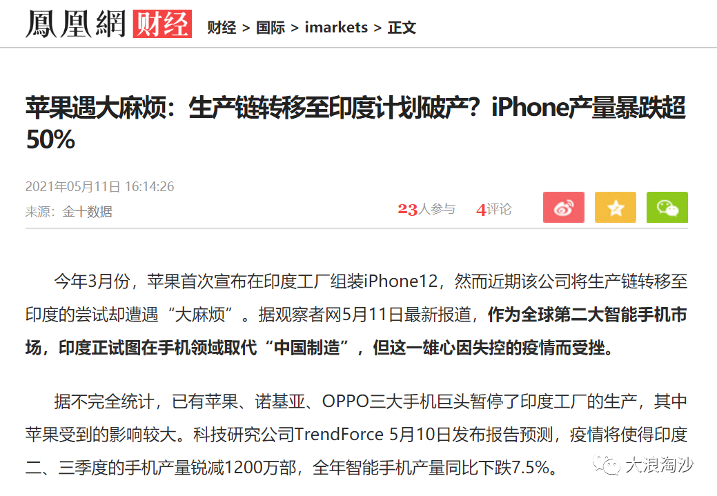 然而这一美梦怎么破的就不用我说了,印度疫情一夜回到解放前,早早试图转移产业的跨国资本巨头都得到了“孽力回馈”,例如iPhone 12在印度新建的代工厂产量暴跌50%以上……
